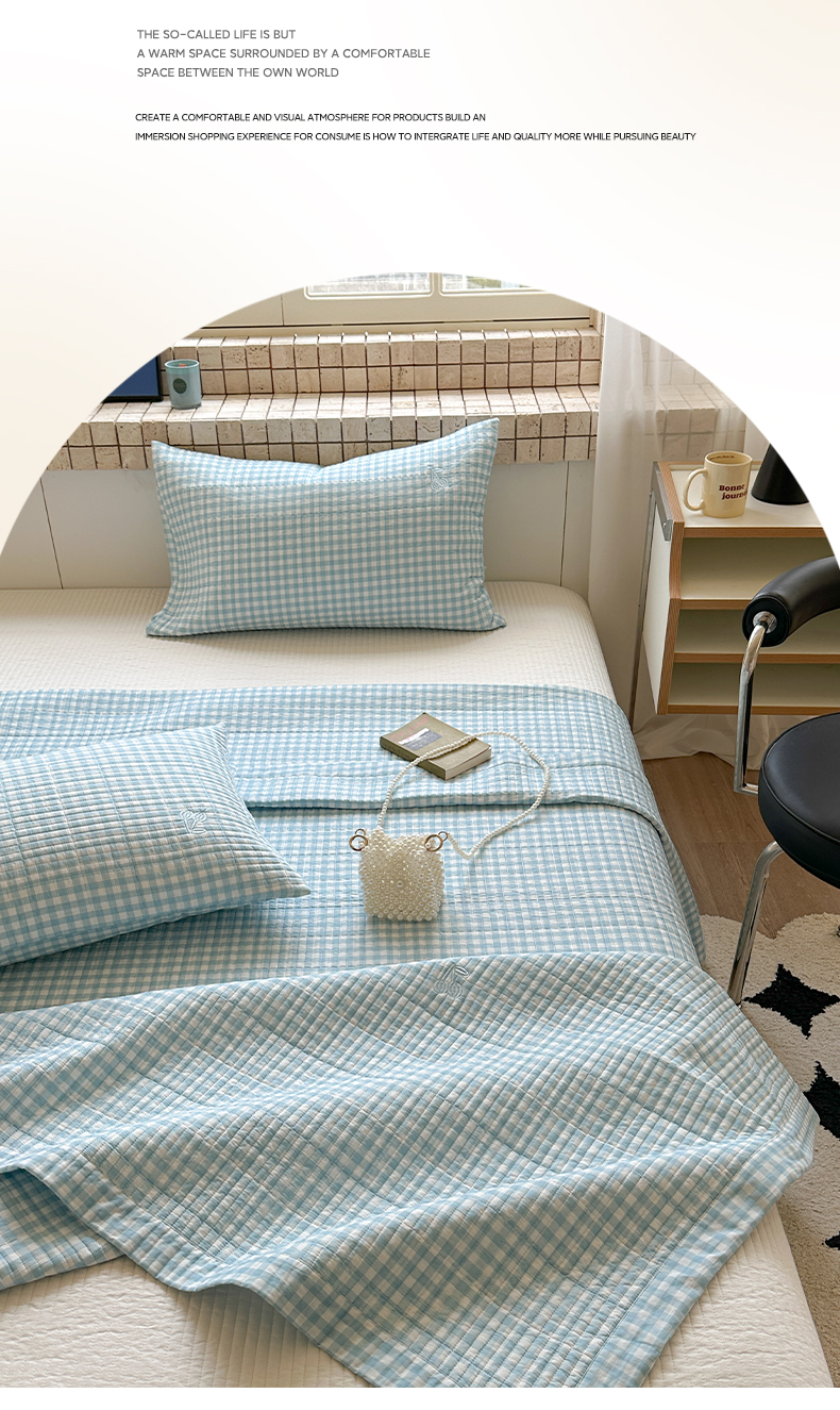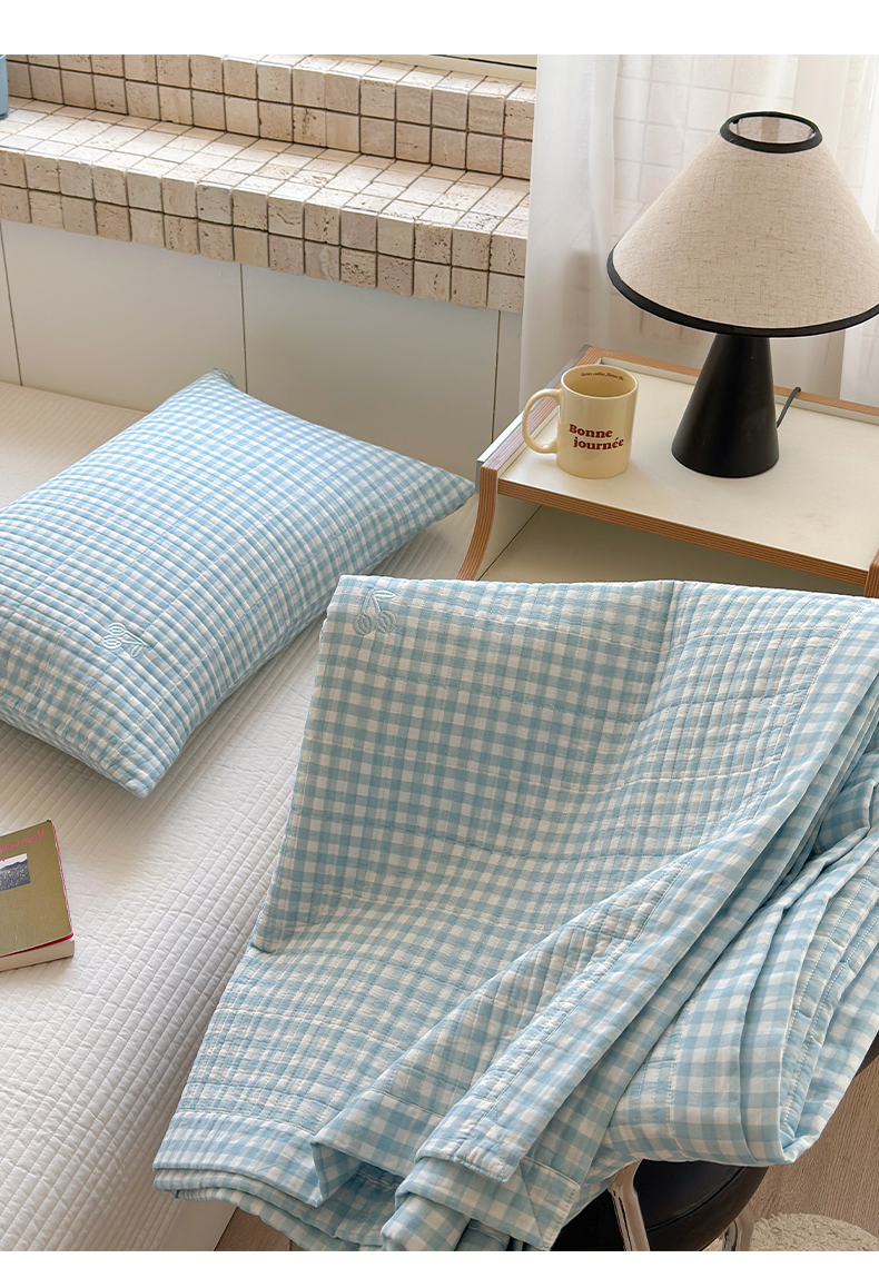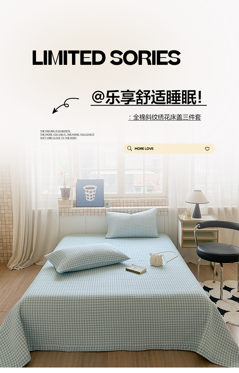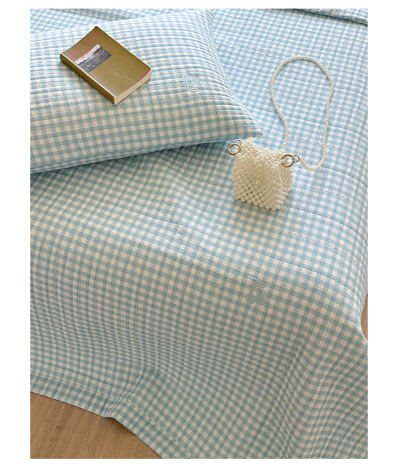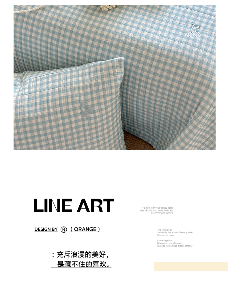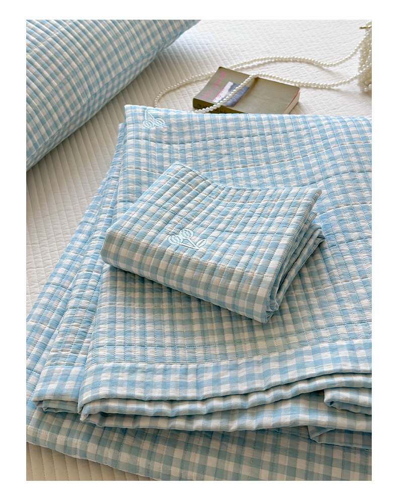 琳可家居 2026春夏新品双面斜纹全棉印花绣花床盖可机洗加密绗缝高温水洗 格子樱桃蓝