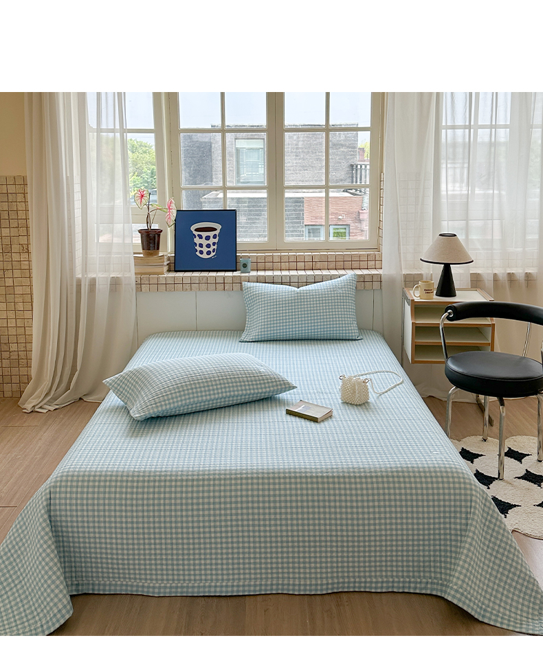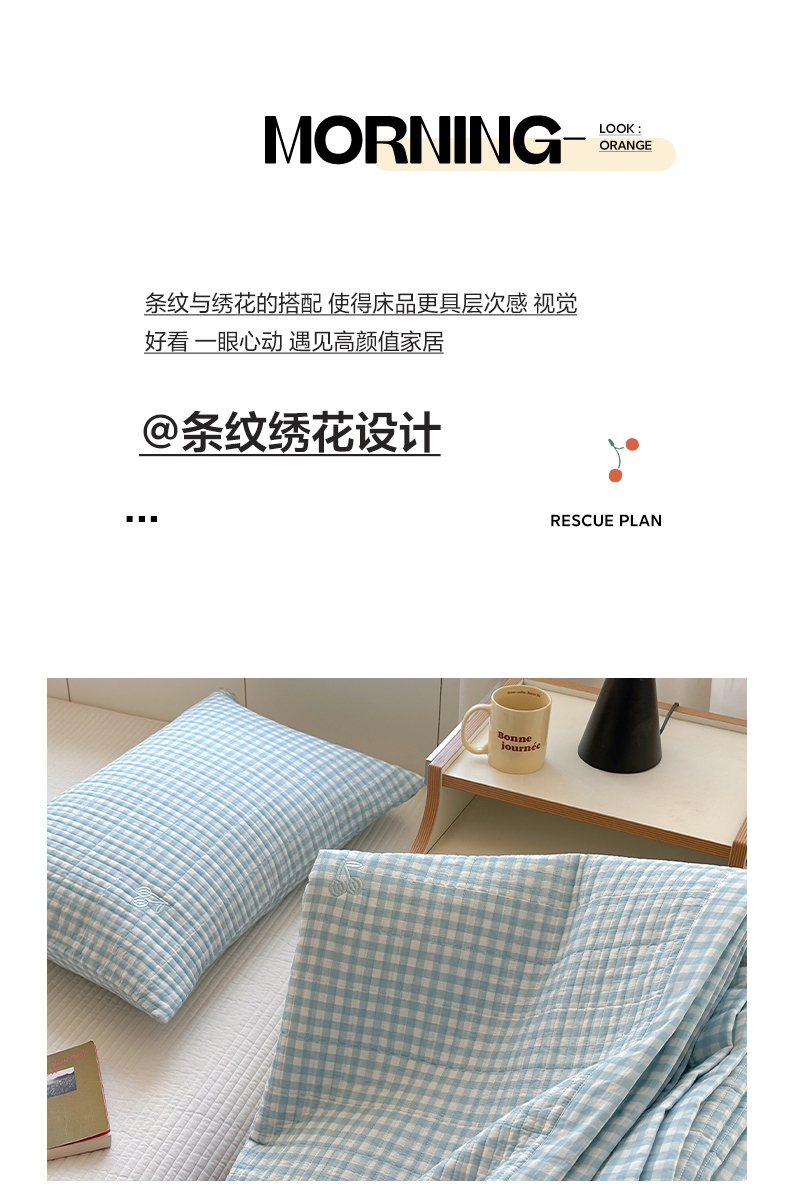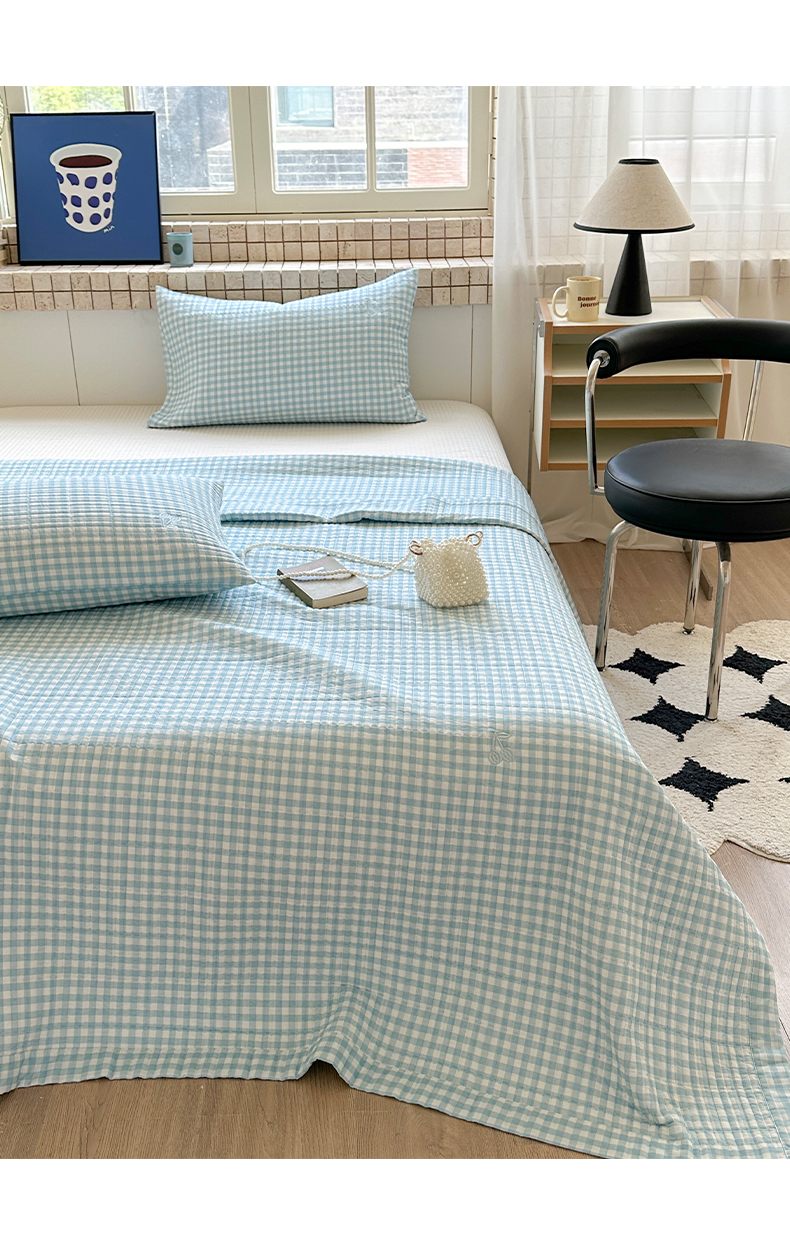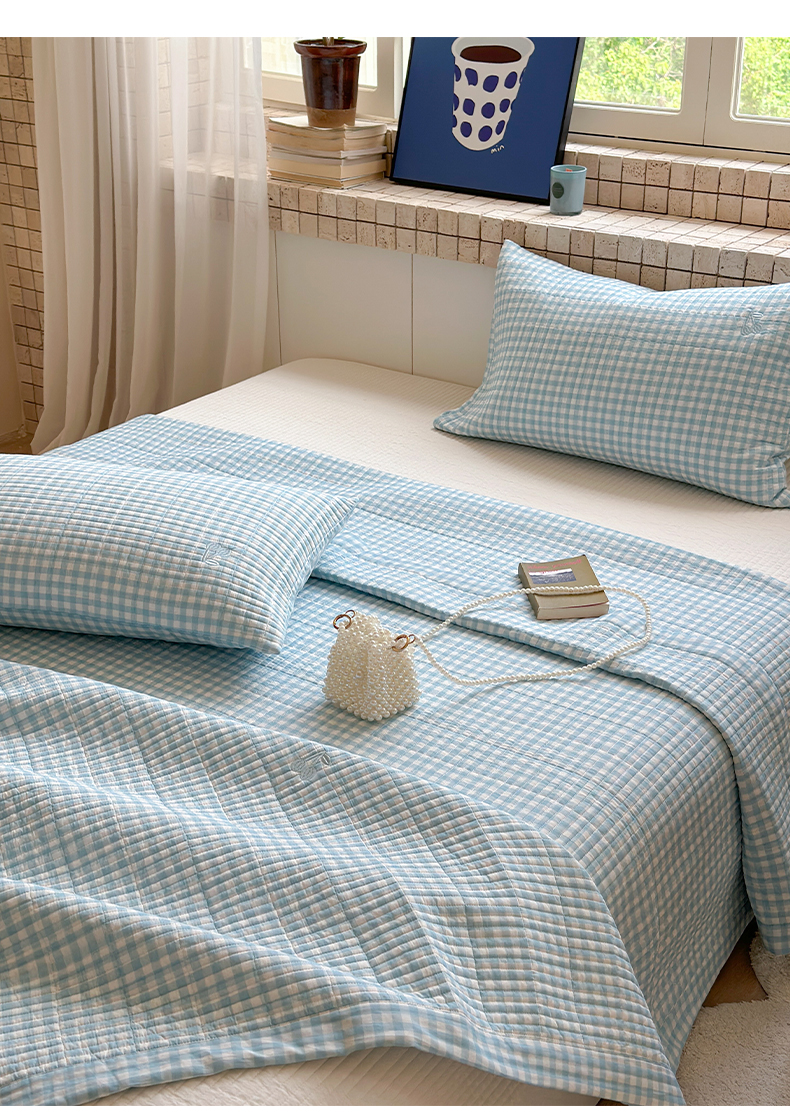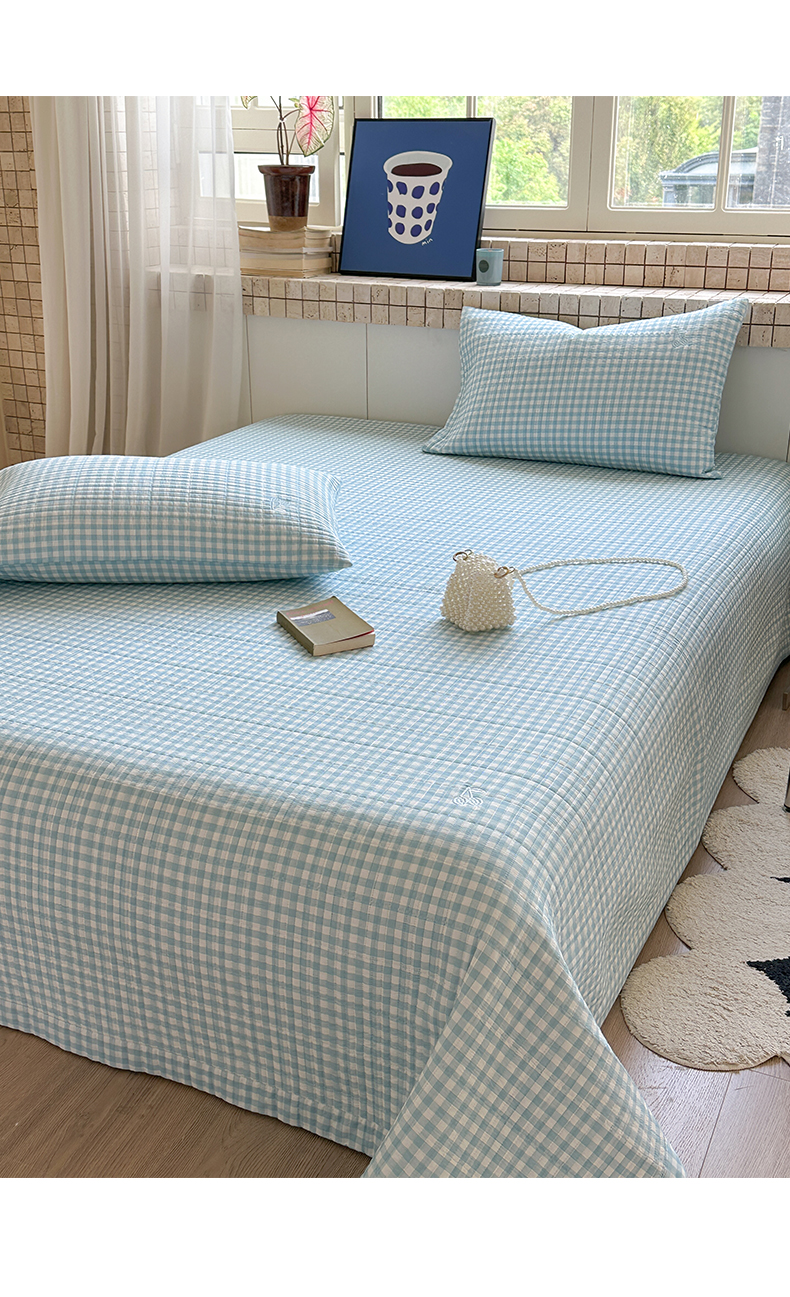 琳可家居 2026春夏新品双面斜纹全棉印花绣花床盖可机洗加密绗缝高温水洗 格子樱桃蓝