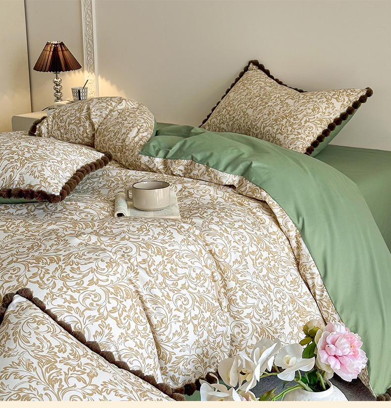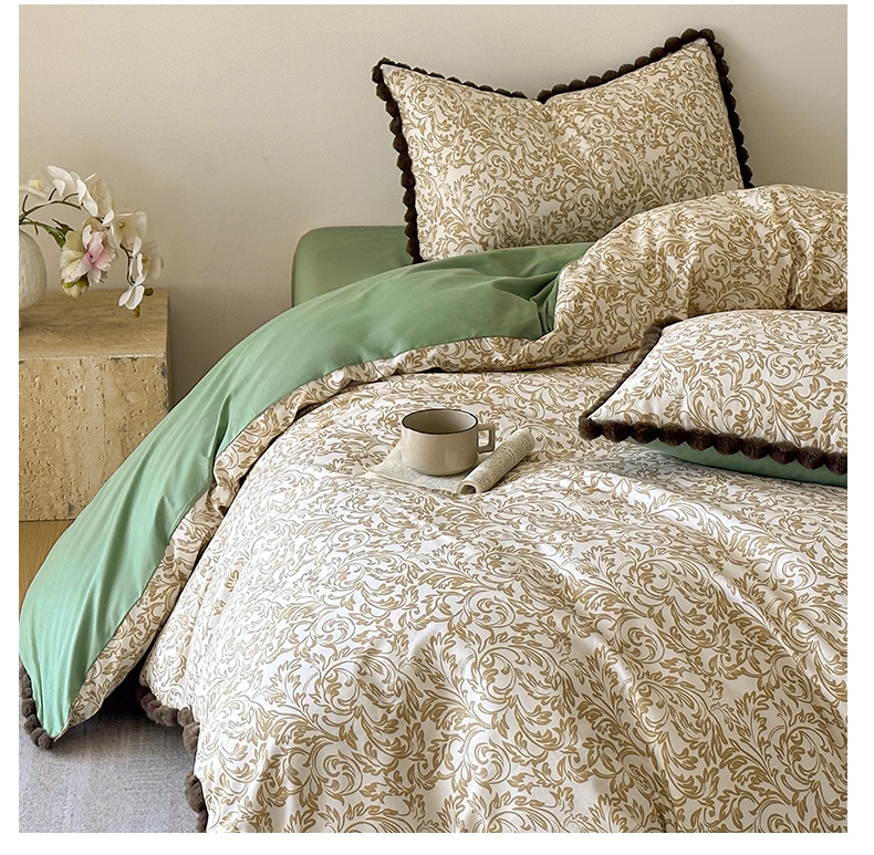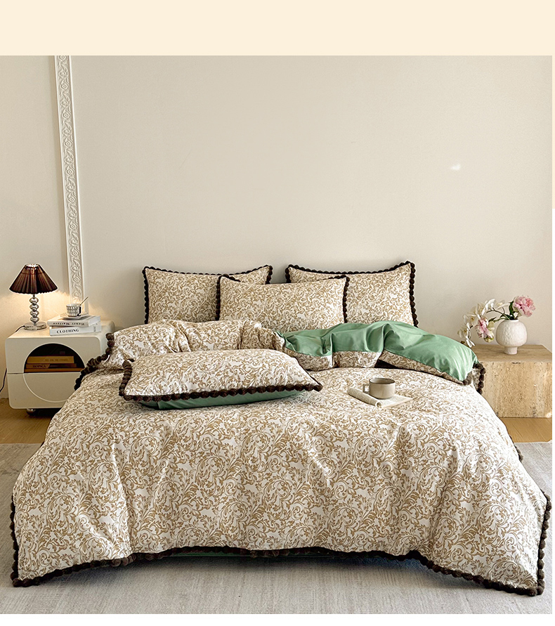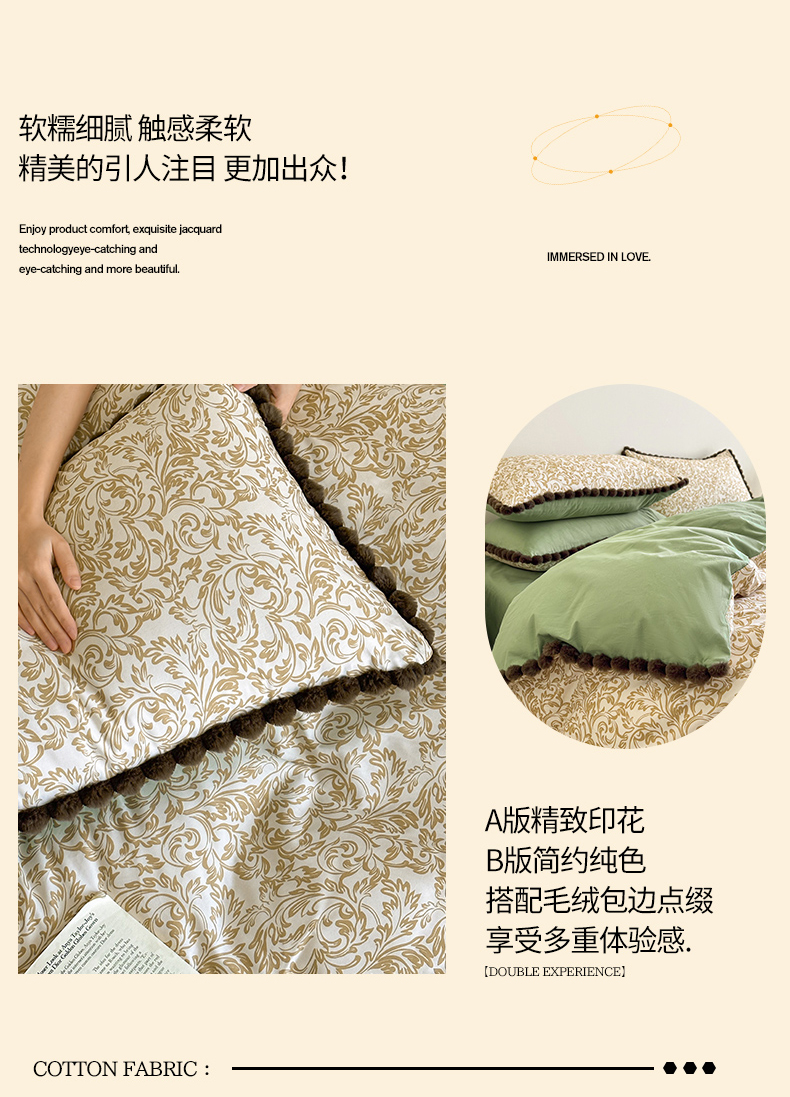 商品名称:羚羊语家纺 2026新款全棉毛球款四件套40支纯棉轻奢13372小清新喷气印花四件套被套床单床笠三件套 莫松染Pro