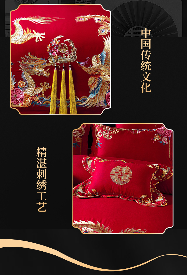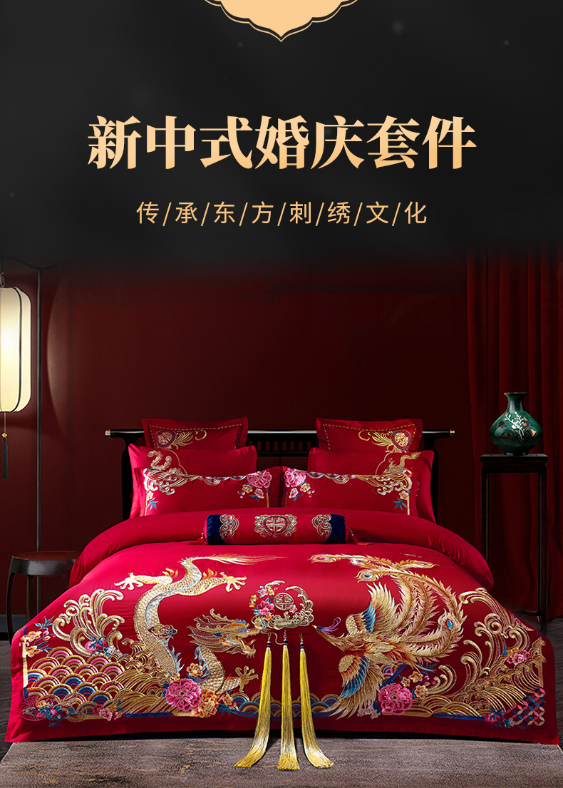 当前位置: 91家纺网 > 商品网购 > 床品套件 > 四件套 > 婚庆四件套 > 慕她家纺 2026年全棉纯棉婚庆四件套大红色刺绣结床上用品(床盖款加40) 长绒棉-欢喜龙凤