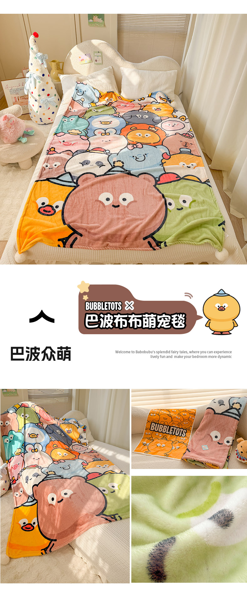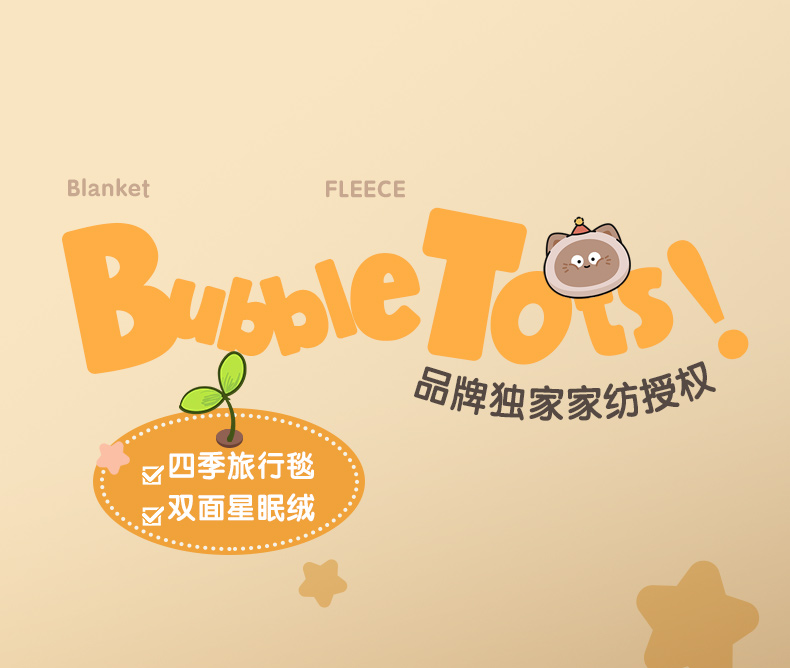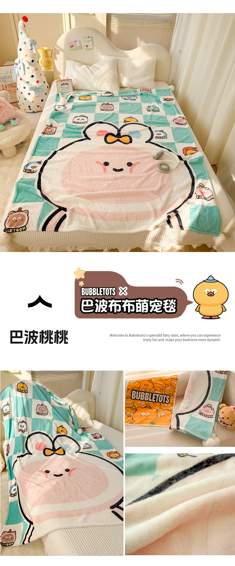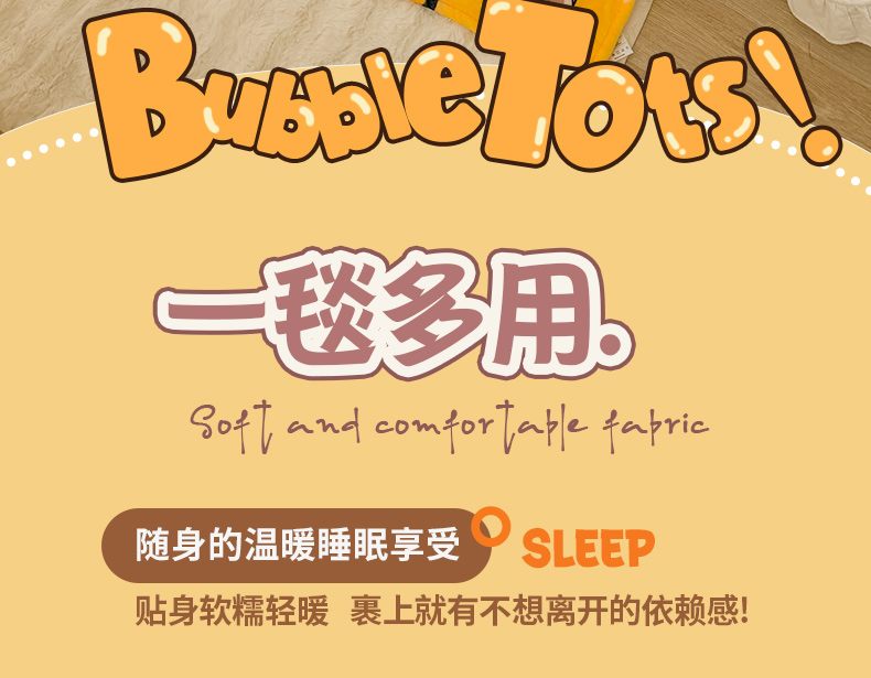 (总)潮邦创意家居 2026新款星眠绒单层双面球毯-BubbleTots巴波布布独家授权-第一批 控价:100*150cm不得低于69元 150*200cm不得低于89元,巴波萌团,巴波桃桃,巴波众萌,巴啵茨茨