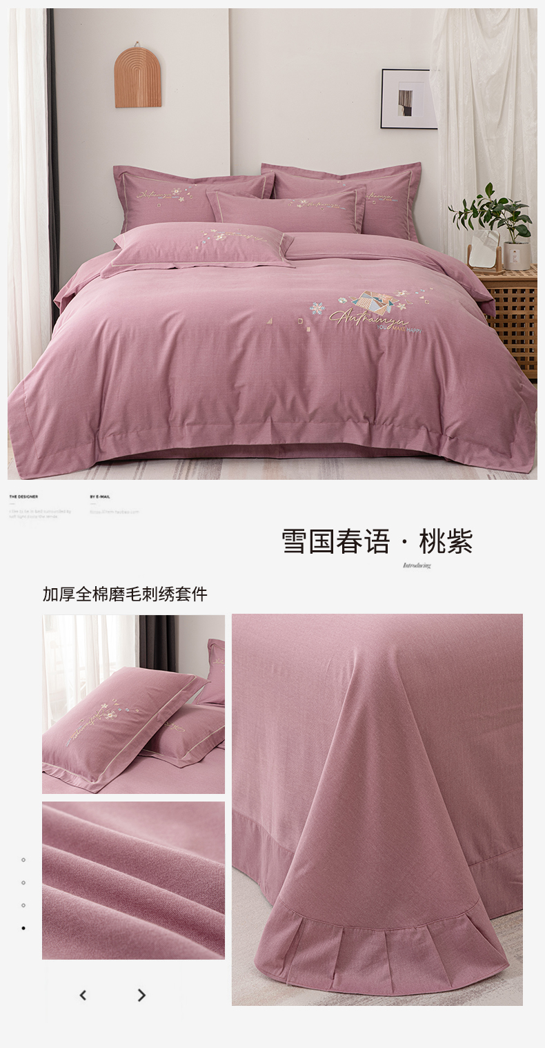 (总)缘舒家纺 2025新款全棉加厚工艺款绣花磨毛四件套,雪国春语-宝蓝,雪国春语-高级灰,雪国春语-浅绿,雪国春语-桃紫,自由格调-豆沙,自由格调-湖蓝,自由格调-橘色,自由格调-银灰
