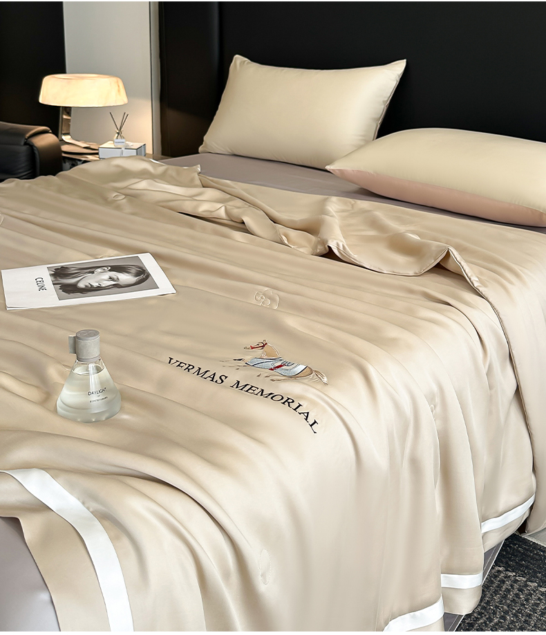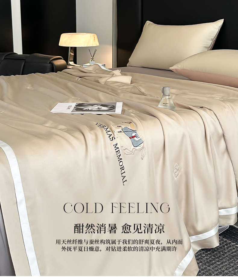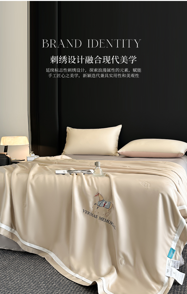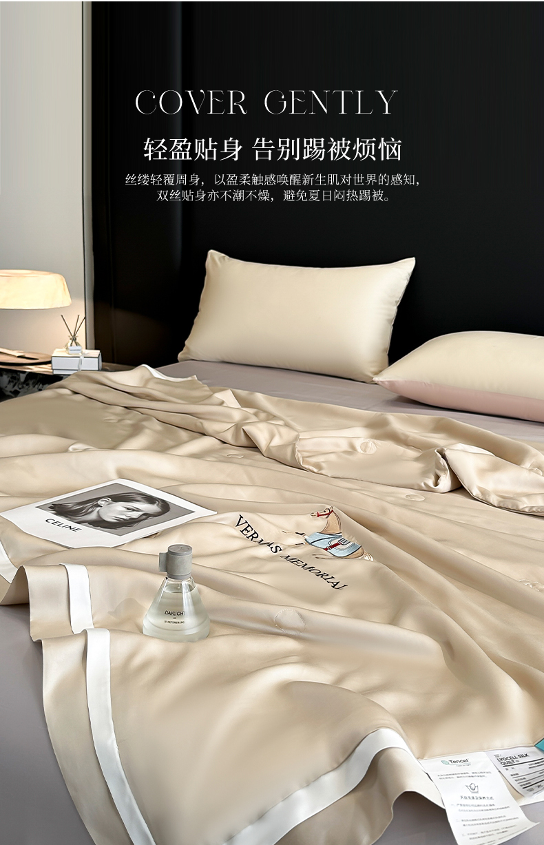 商品名称:薇玛仕 2026新款绣花80支兰精天丝可水洗蚕丝被100蚕丝填充夏凉被空调被 香槟咖