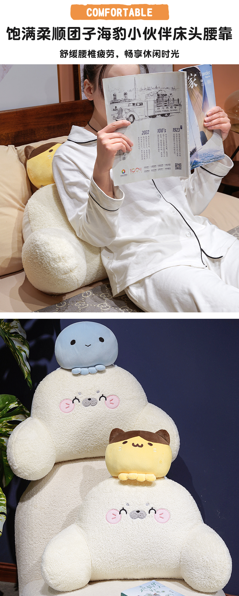(总)仟亿莱 2026新款团子海豹小伙伴拥抱式腰靠,黄色团子海豹,蓝色团子海豹