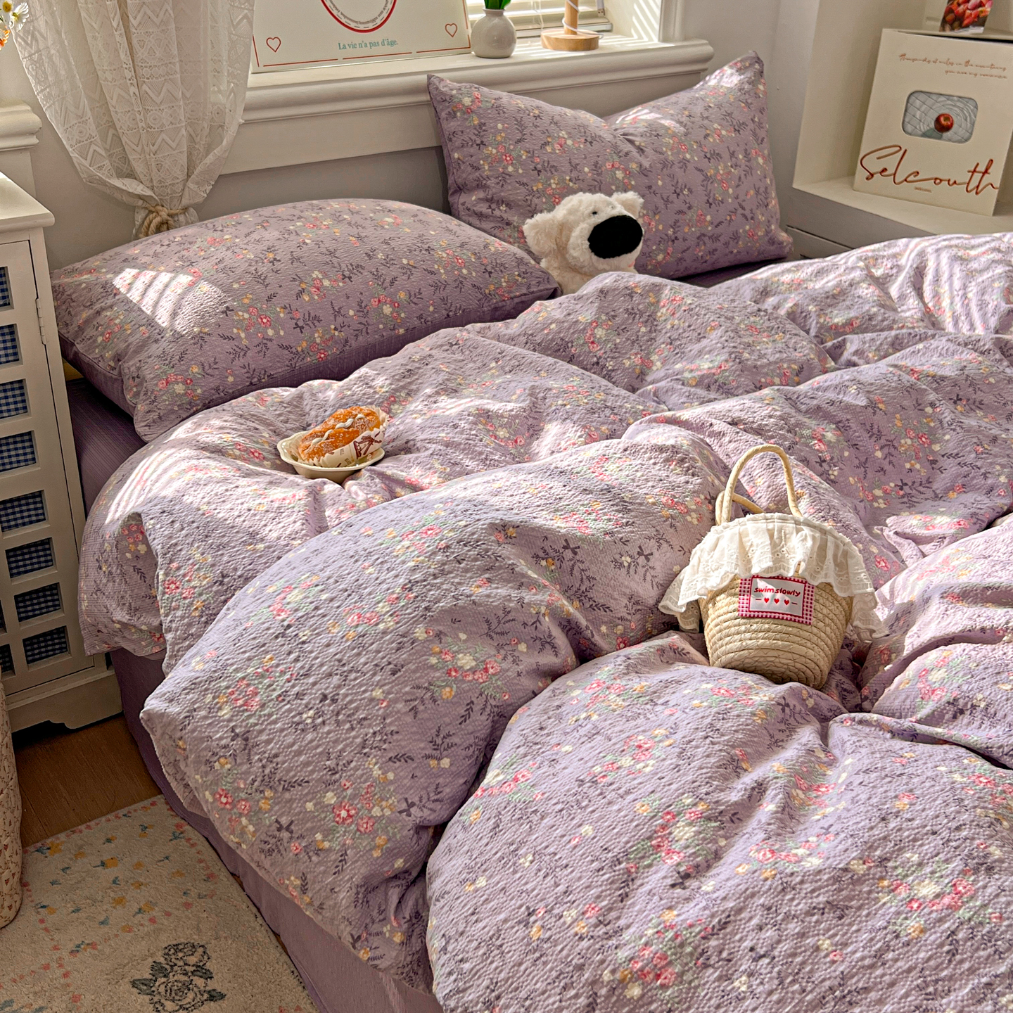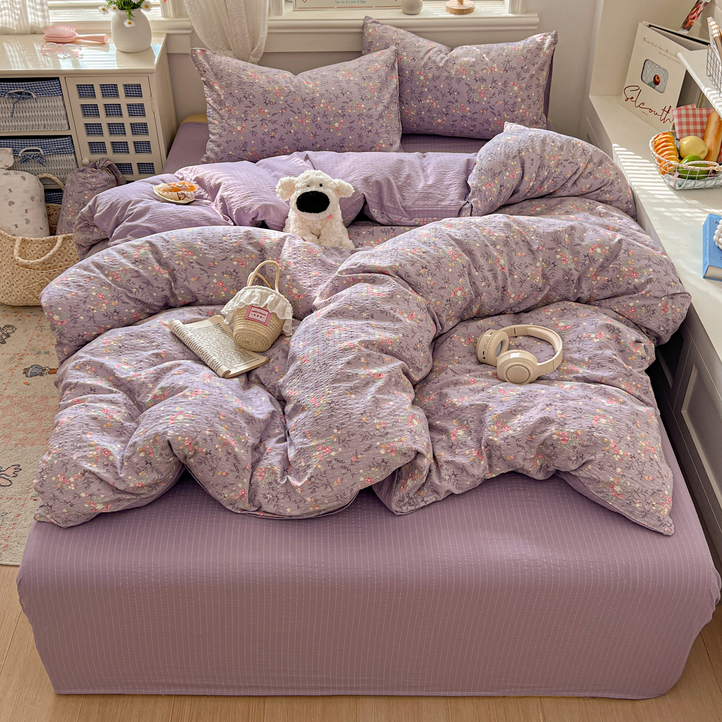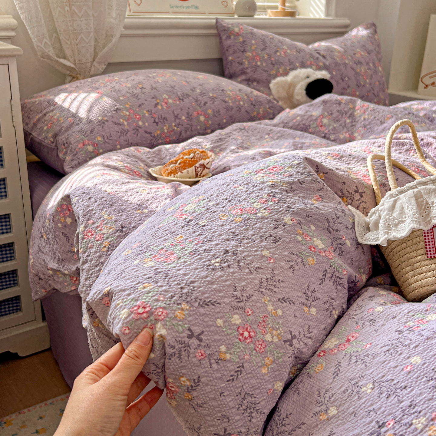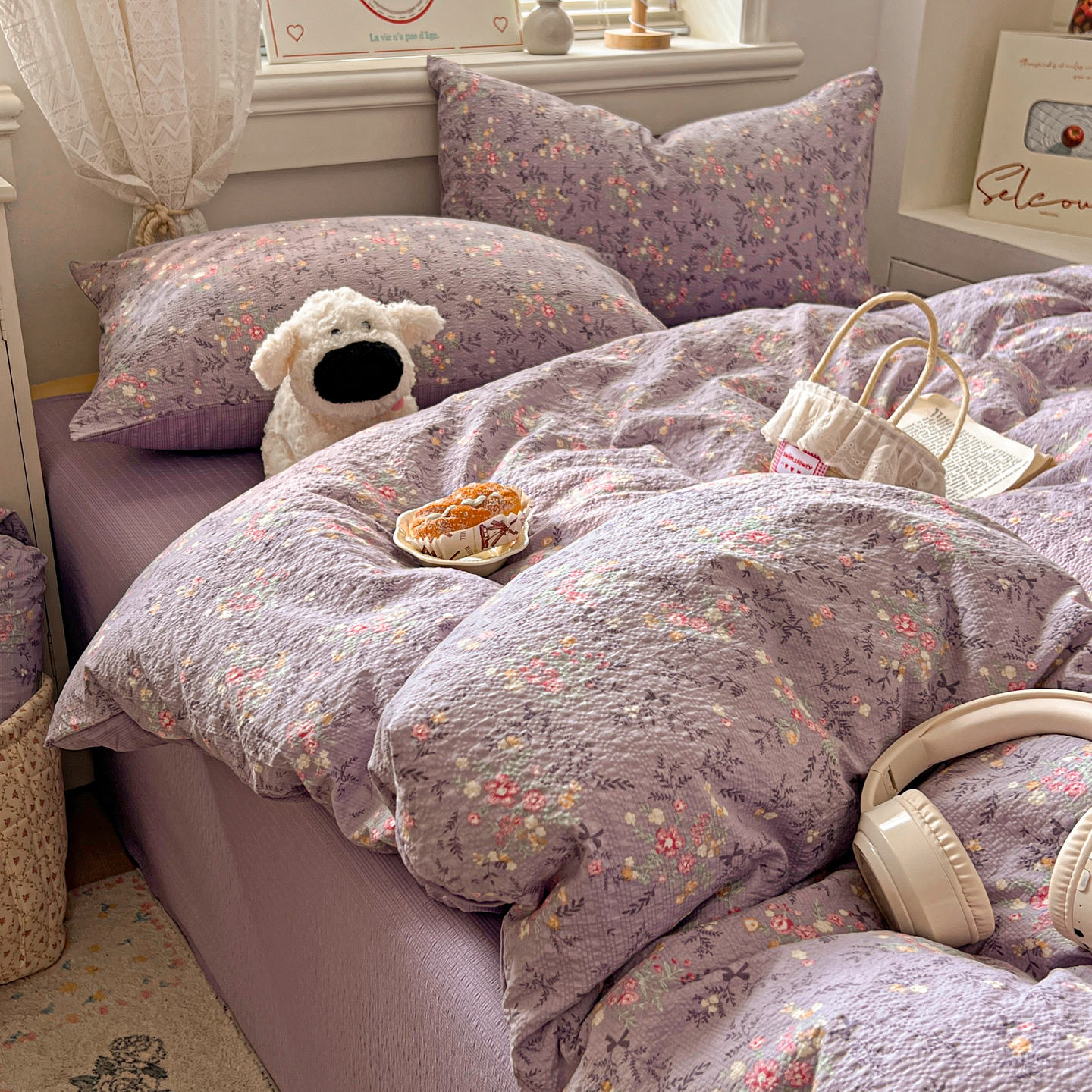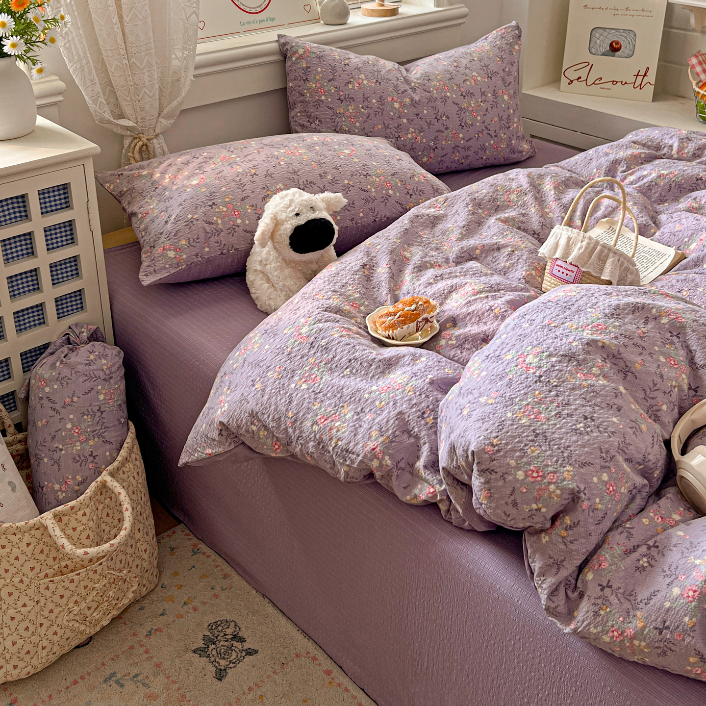 商品名称:暖伊家居 2026新款糖果小布袋泡芙纱四件套 薰衣紫花