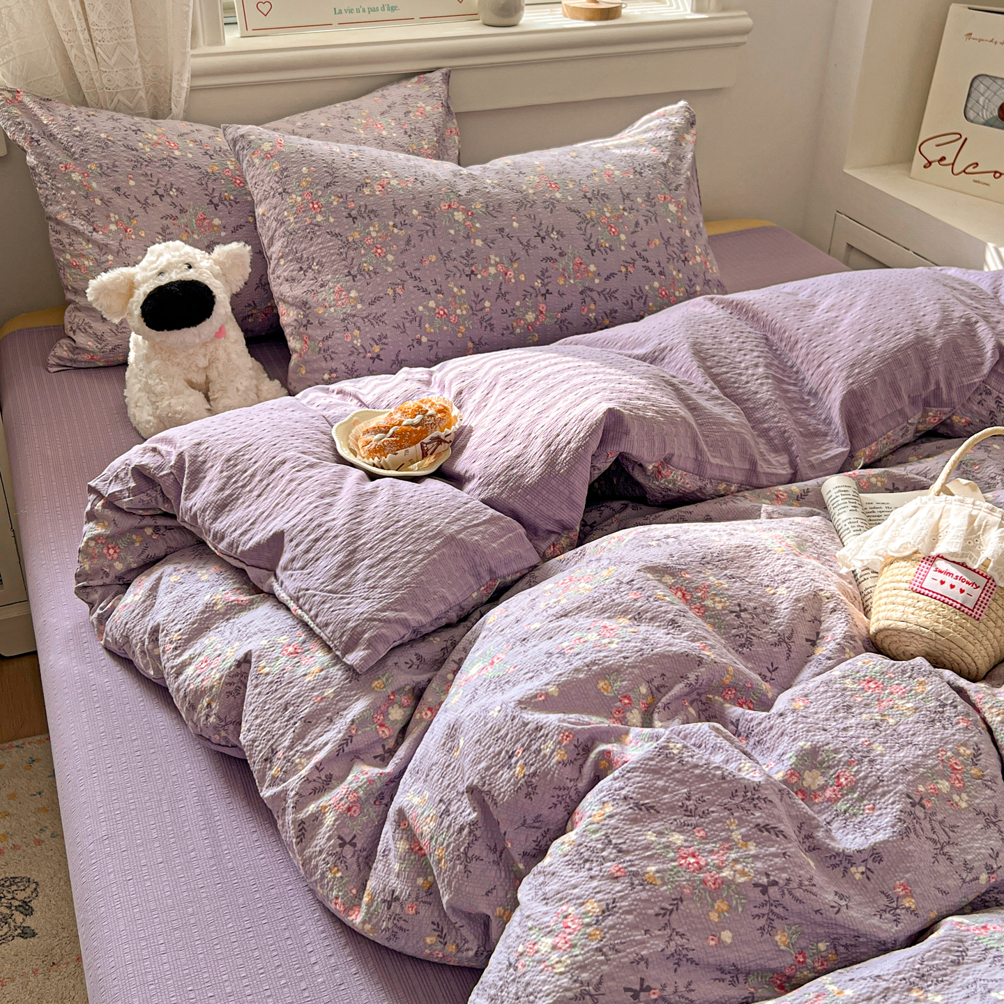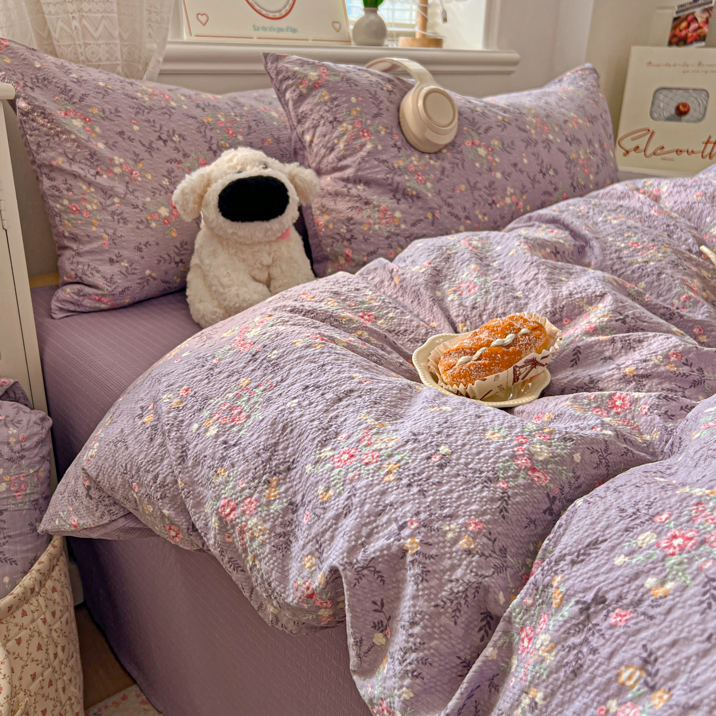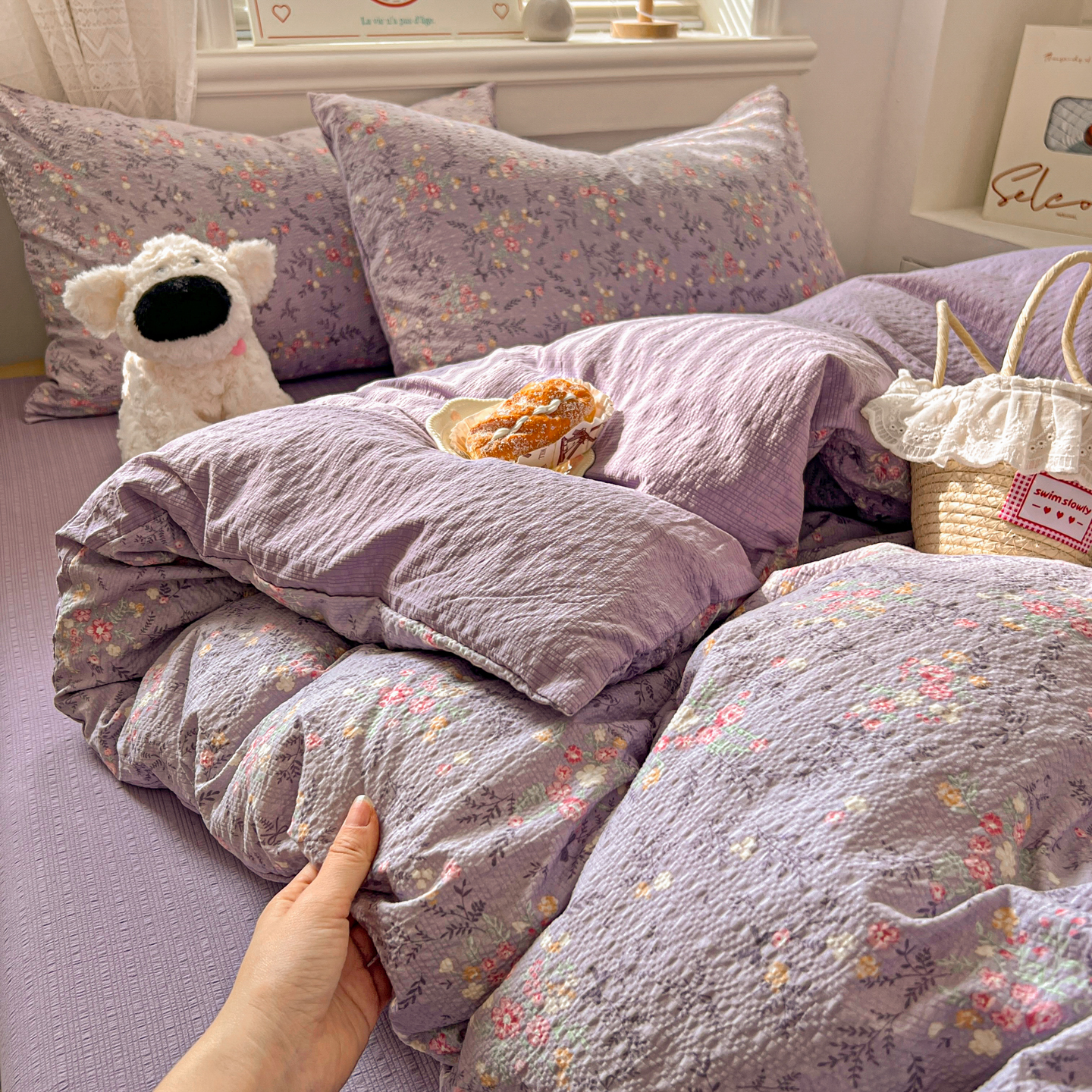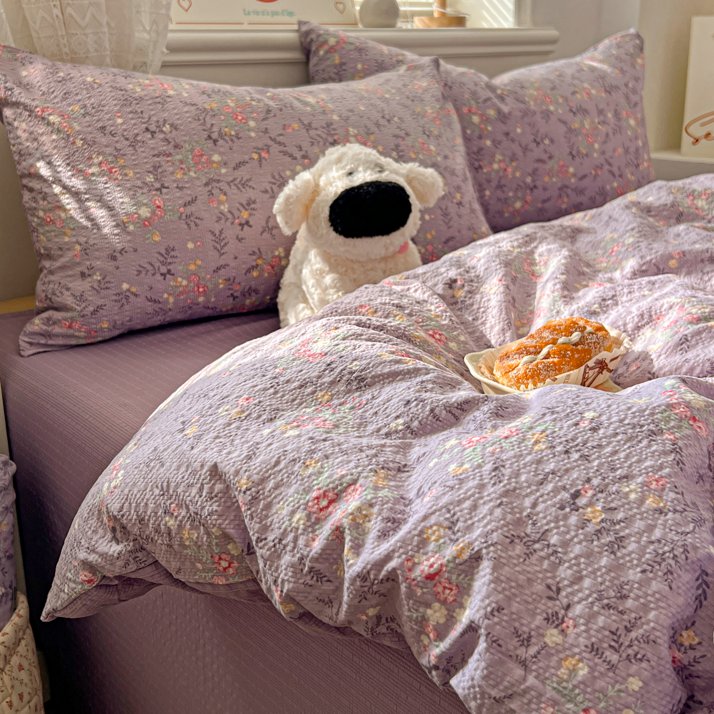 暖伊家居 2026新款糖果小布袋泡芙纱四件套 薰衣紫花
