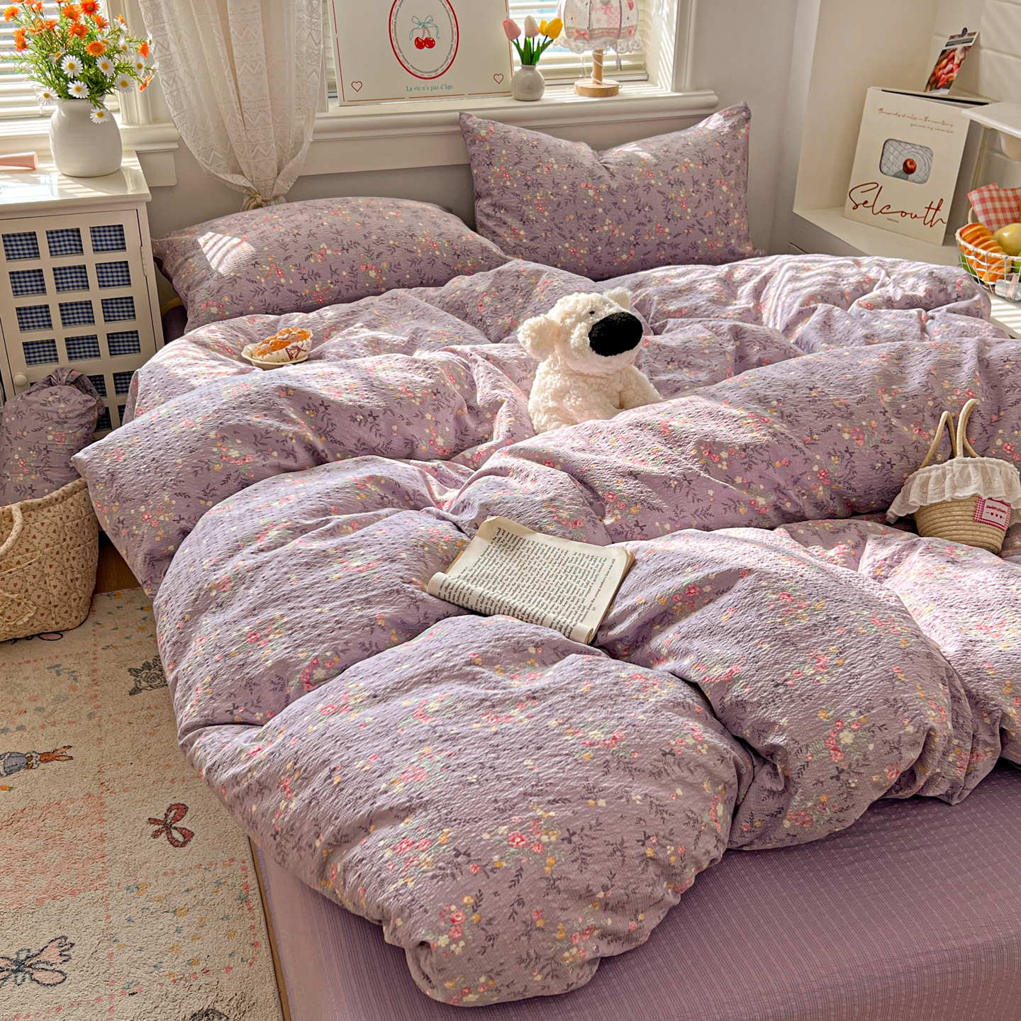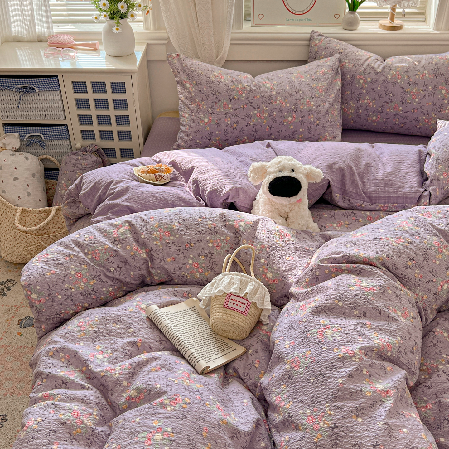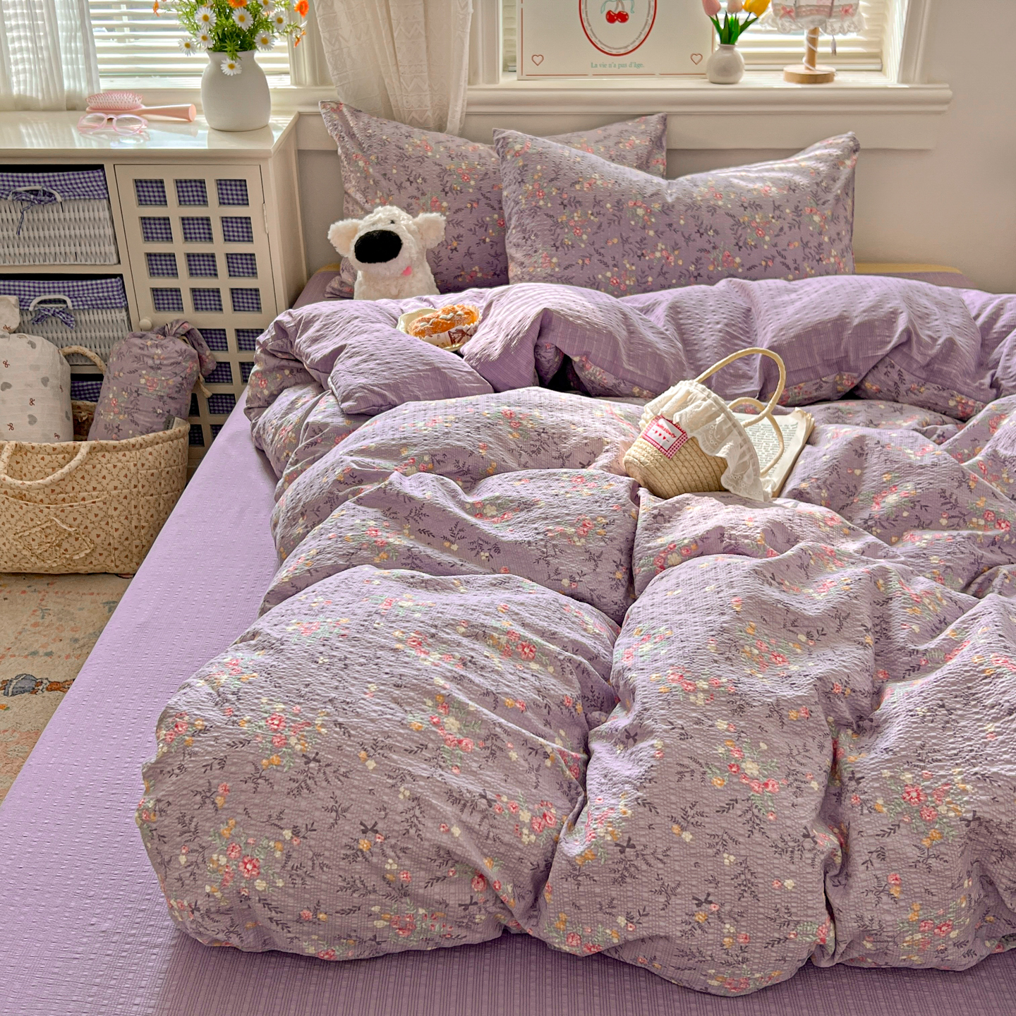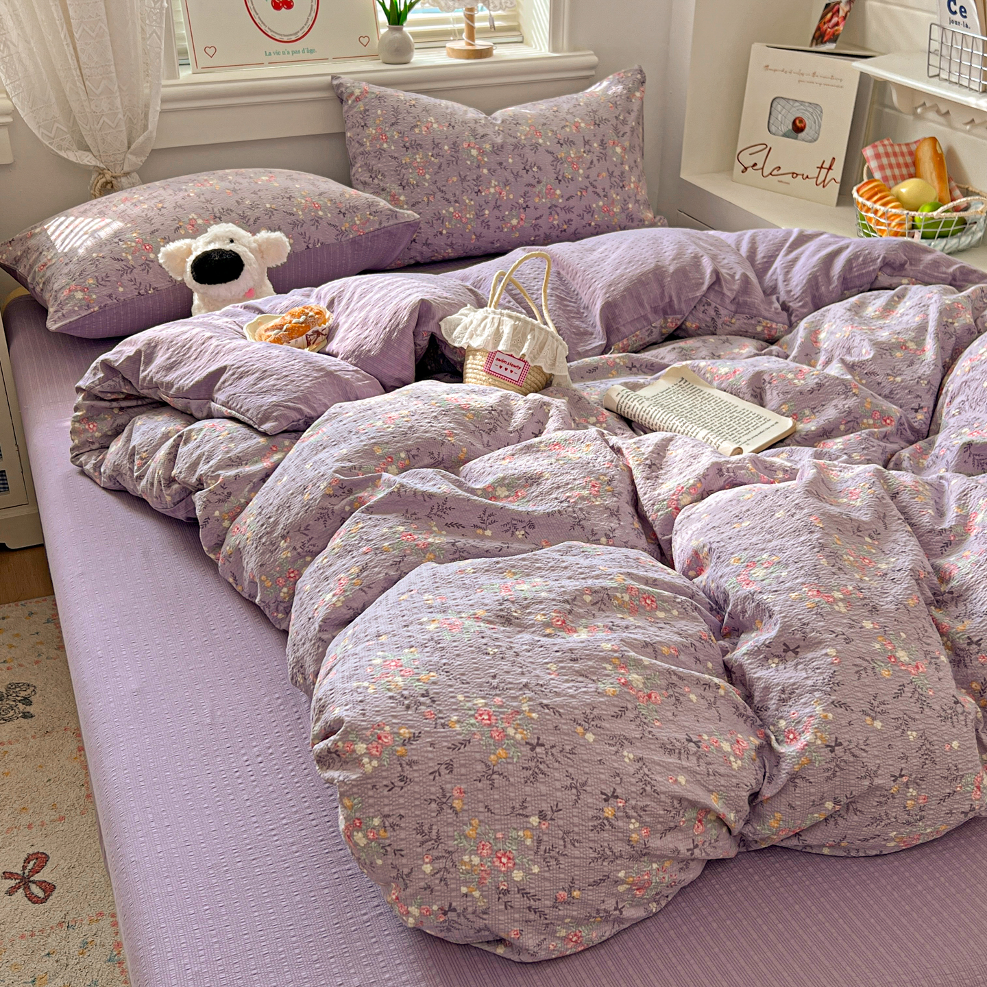 暖伊家居 2026新款糖果小布袋泡芙纱四件套 薰衣紫花
