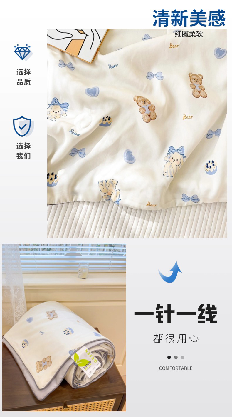 (总)十九色 2026新款液态硅胶奶嘴同源天丝棉飞边凉感夏被夏凉被空调被,小蓝心,小兔兔,草莓多多,花园里,田园趣事,小布偶