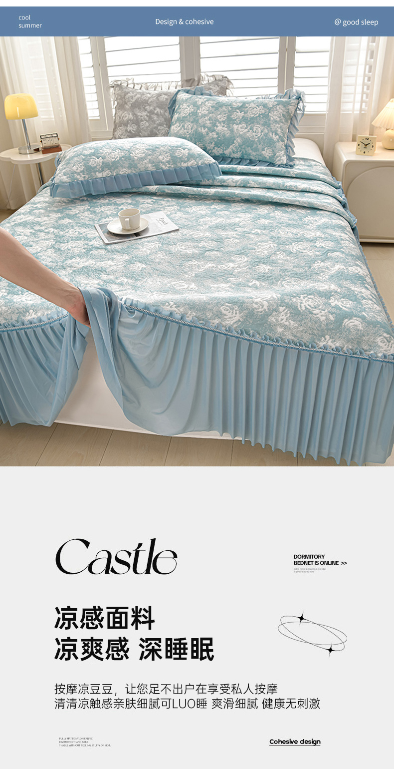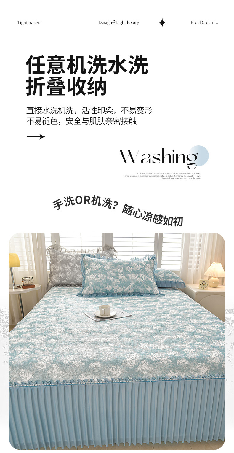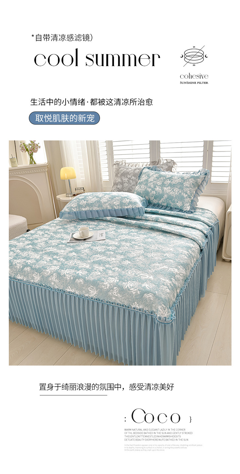 畅畅家纺 2026春夏新款聚乙烯中分子双面提花高克重凉感冰感凉豆豆床裙三件套-经典玫瑰 经典玫瑰-蓝
