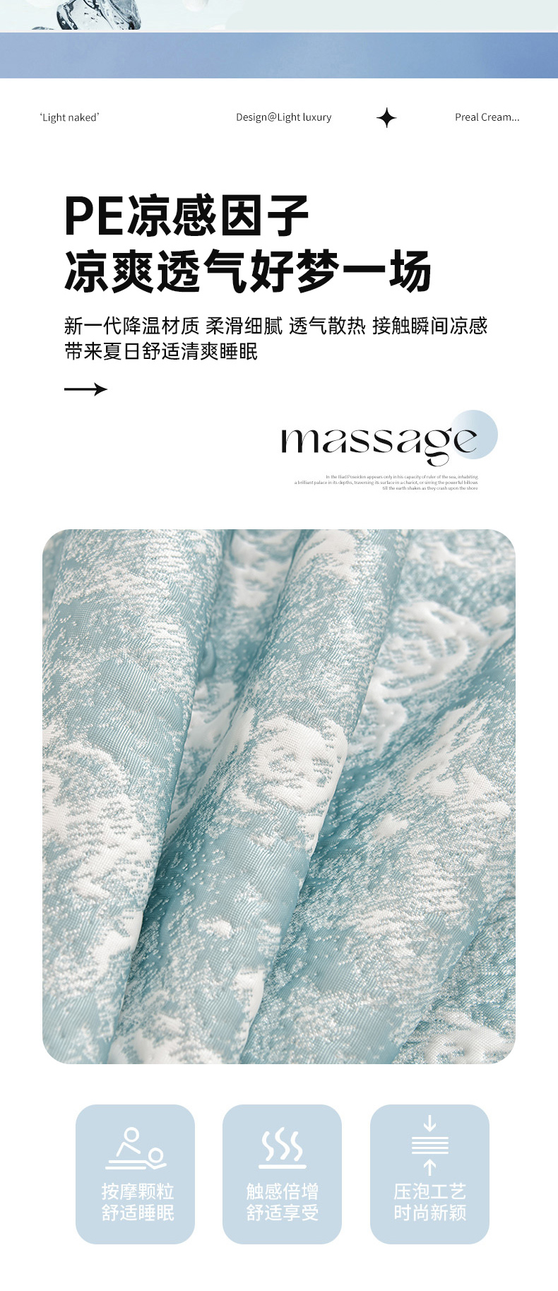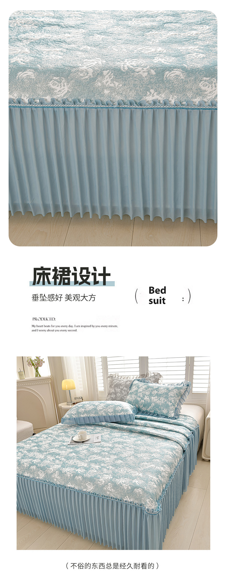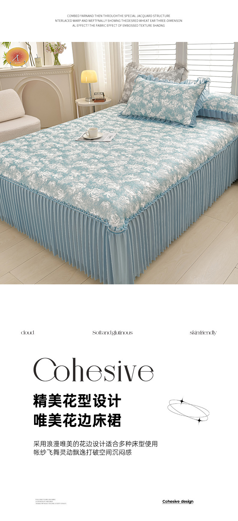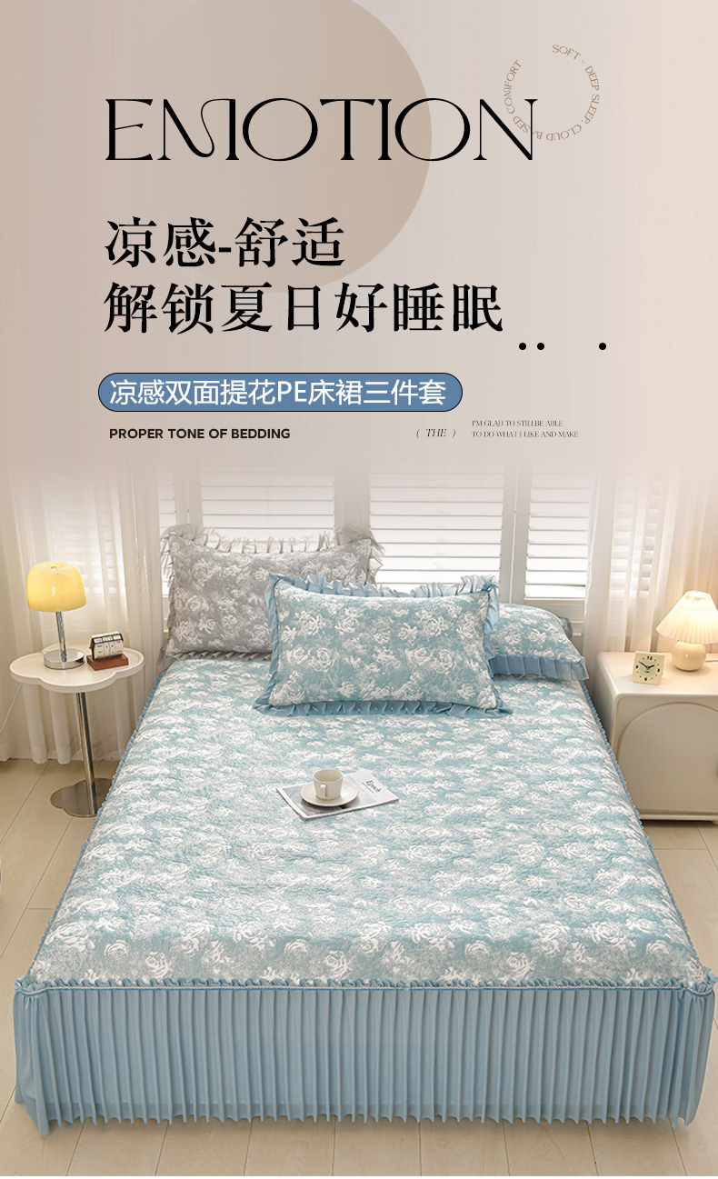 商品名称:畅畅家纺 2026春夏新款聚乙烯中分子双面提花高克重凉感冰感凉豆豆床裙三件套-经典玫瑰 经典玫瑰-蓝