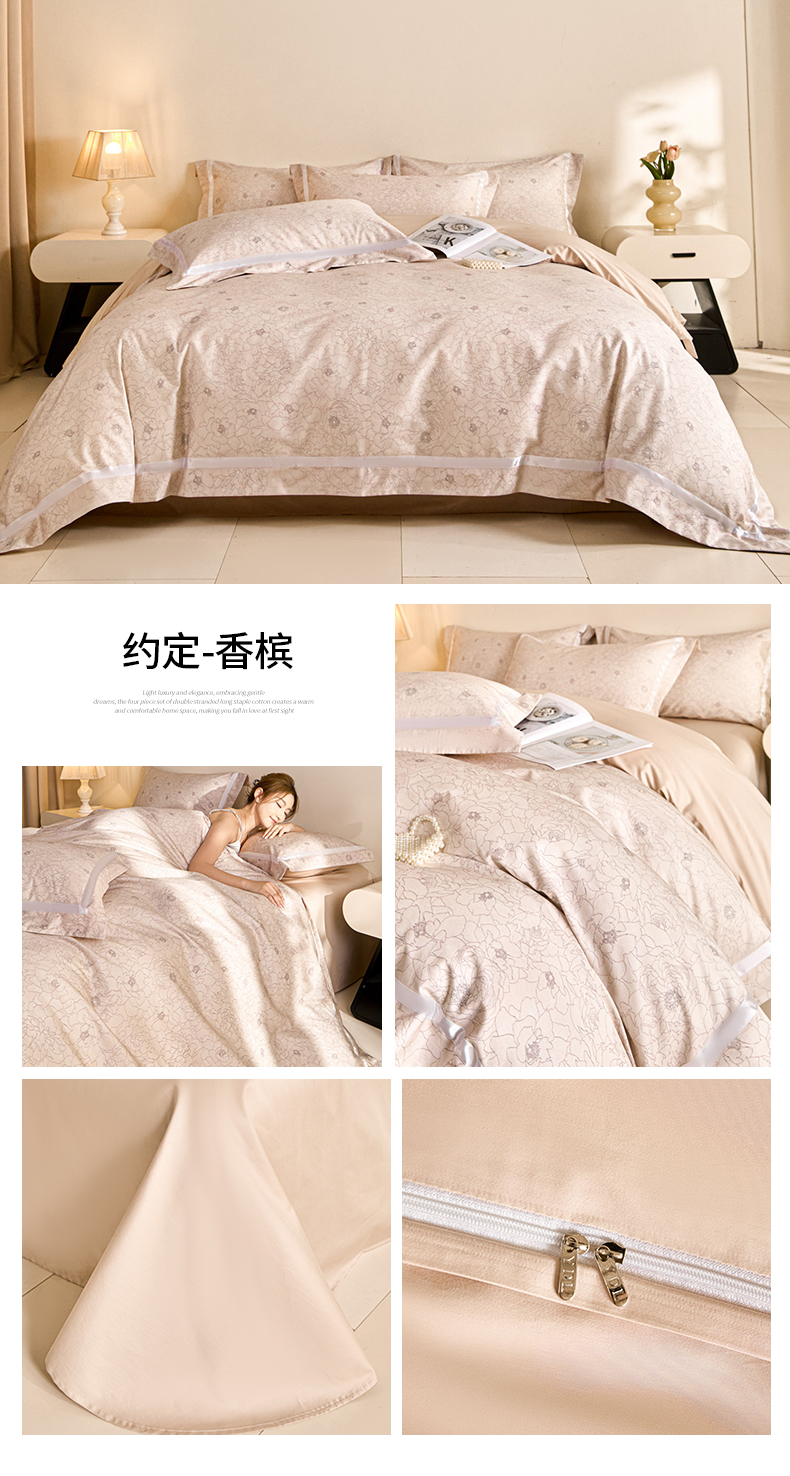 商品名称:新方向 【控价 提供买家秀】2026新款数码印花50s双股全棉贡缎长绒棉四件套-约定 约定-香槟