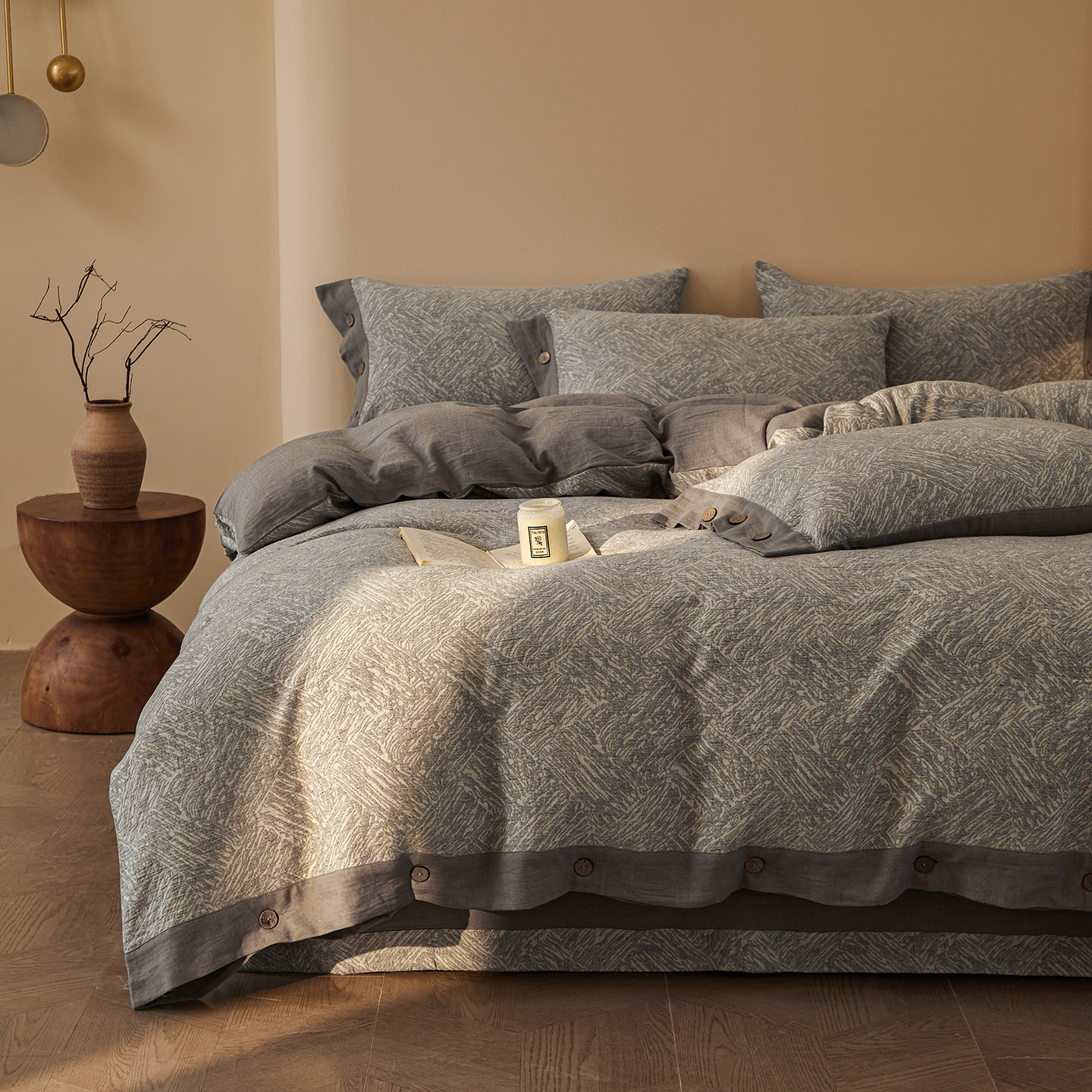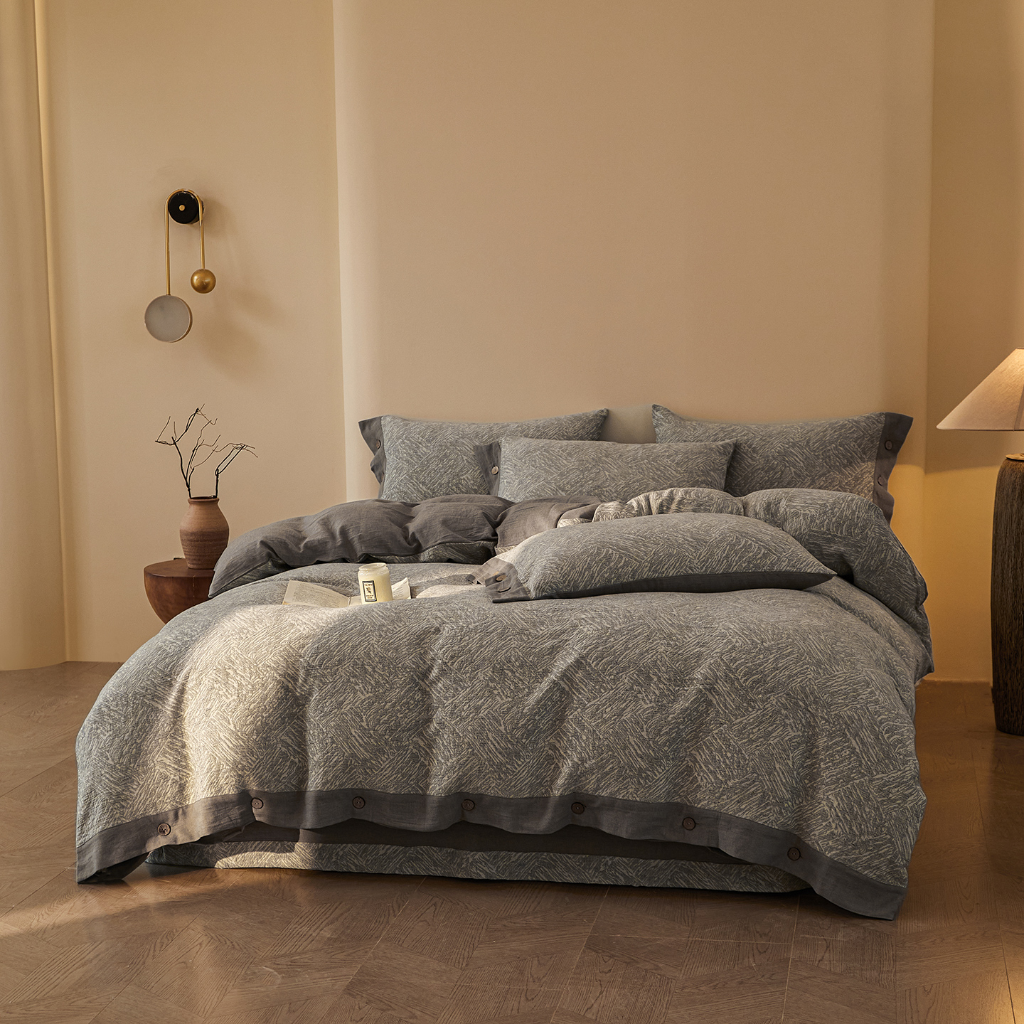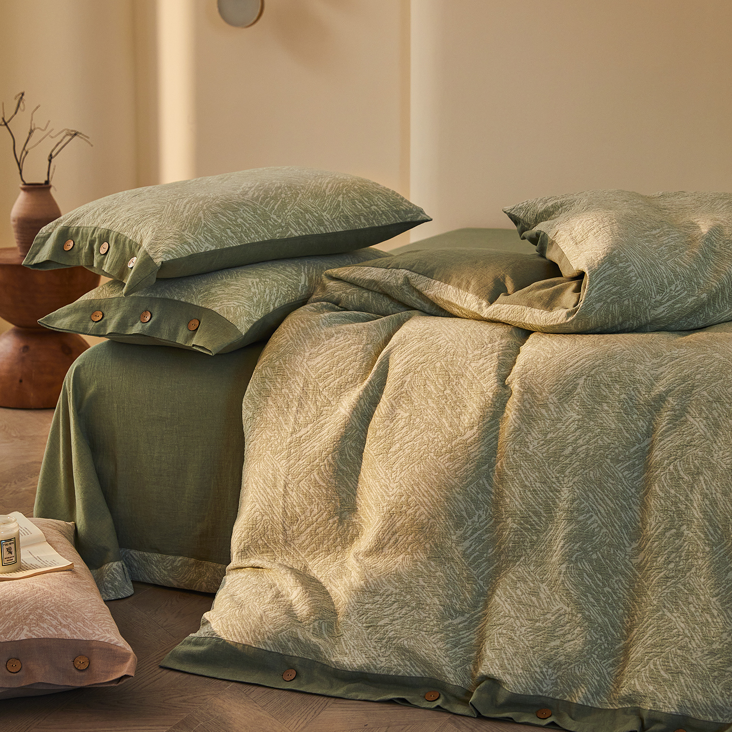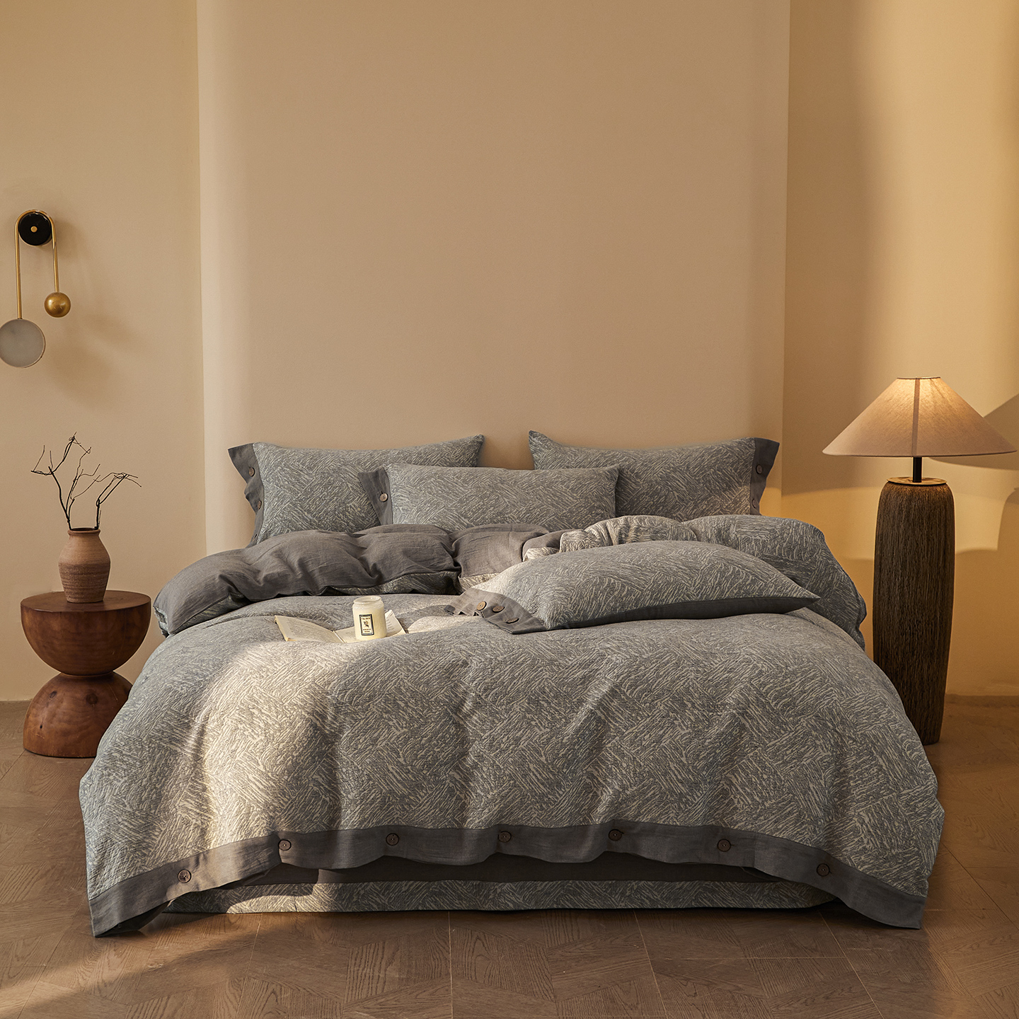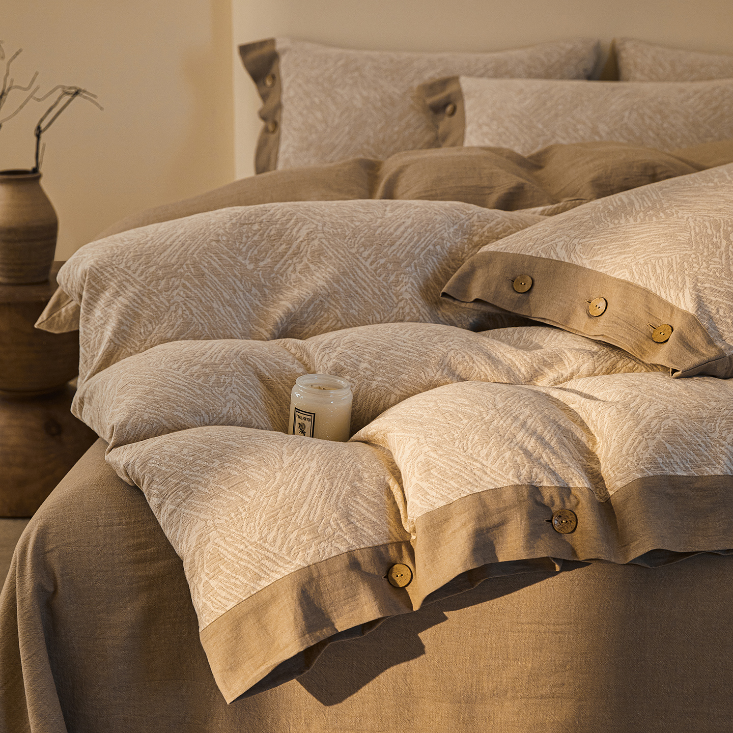 (总)仰望棉麻双层纱供应链 2026新款全棉色织提花双层纱纽扣款四件套-森意棉棉,森意棉棉
