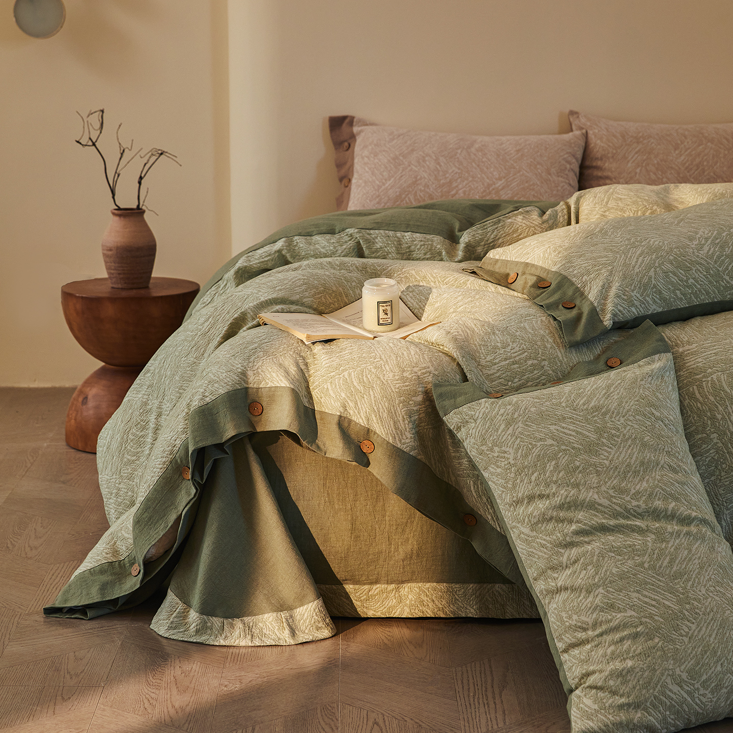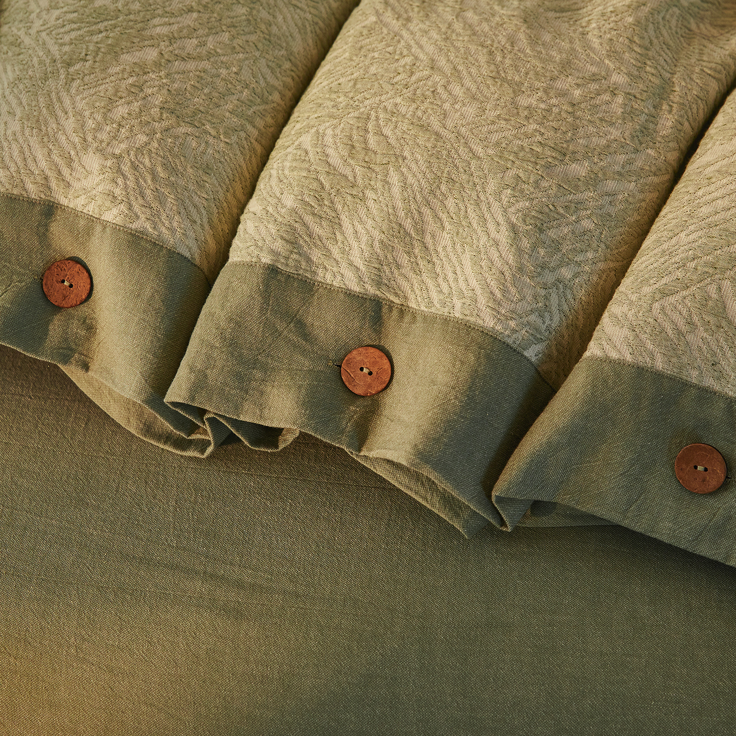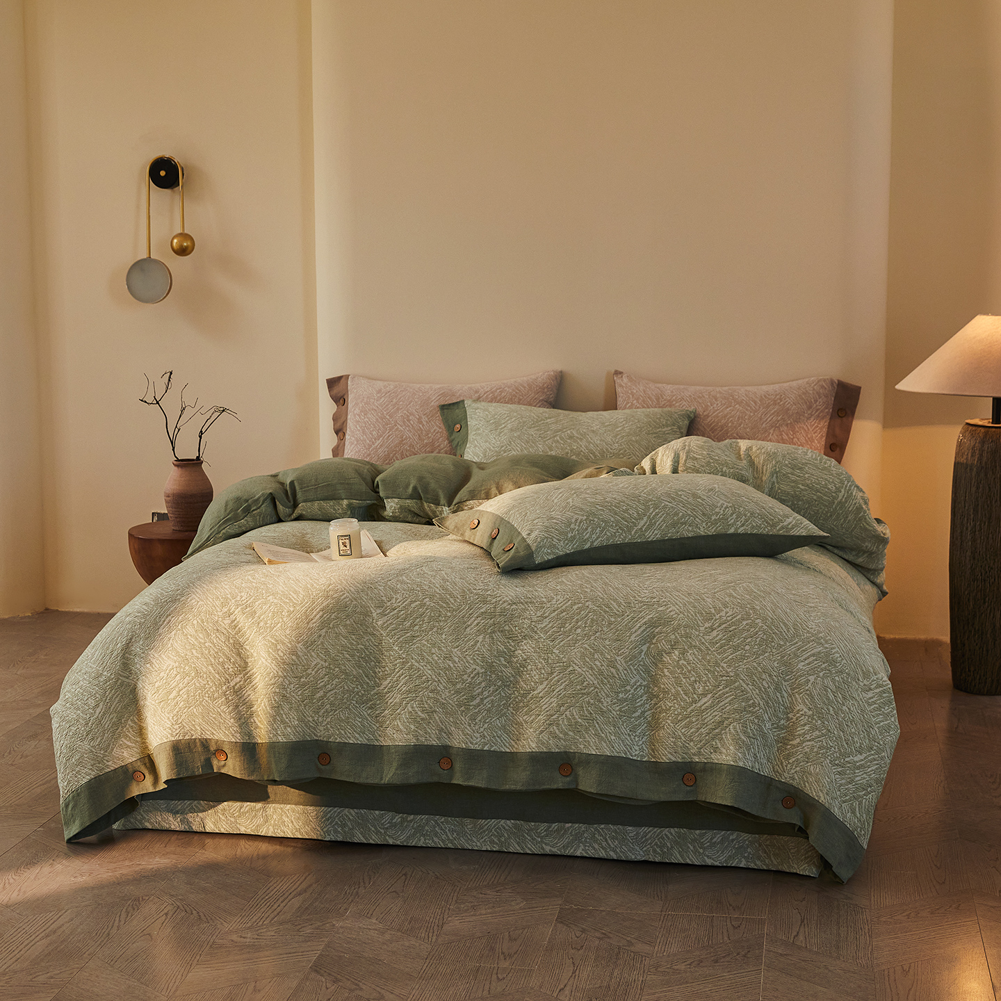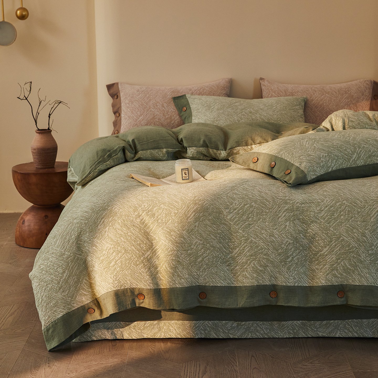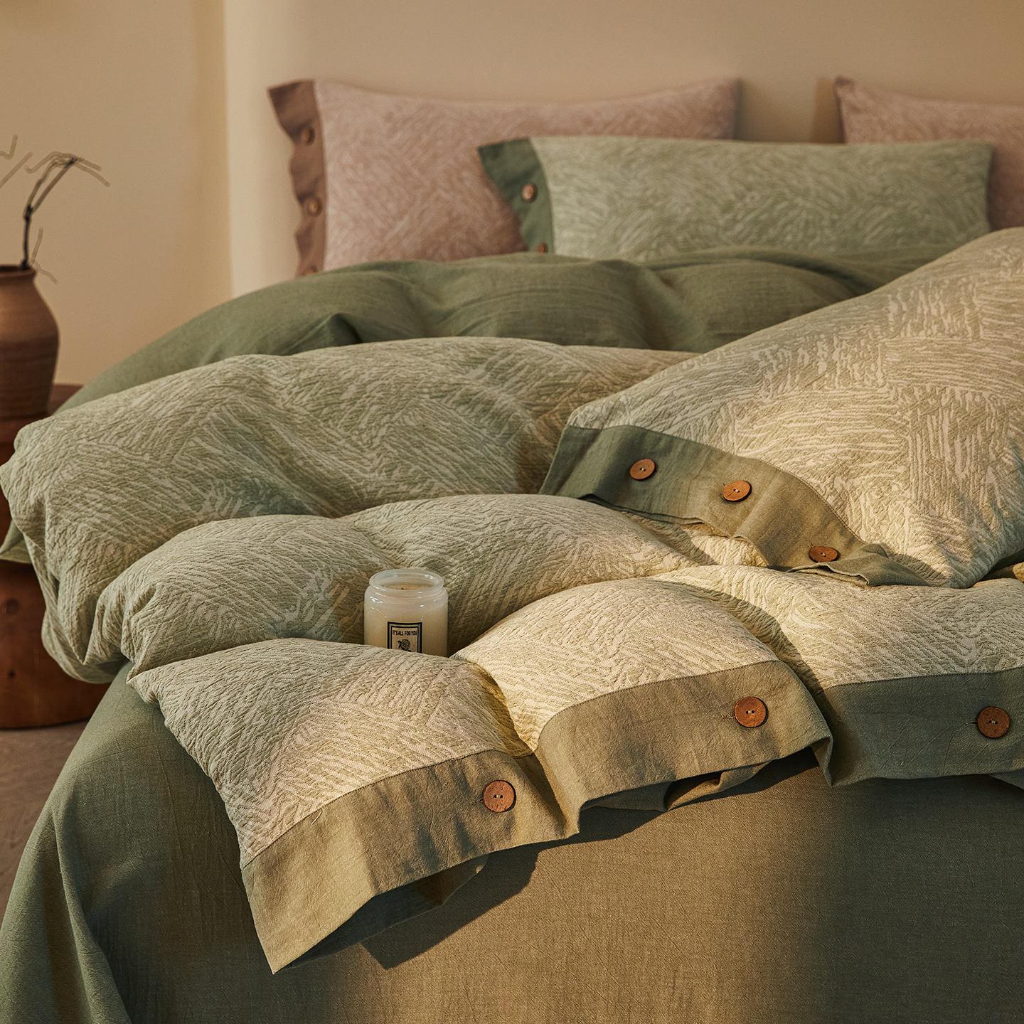 (总)仰望棉麻双层纱供应链 2026新款全棉色织提花双层纱纽扣款四件套-森意棉棉,森意棉棉