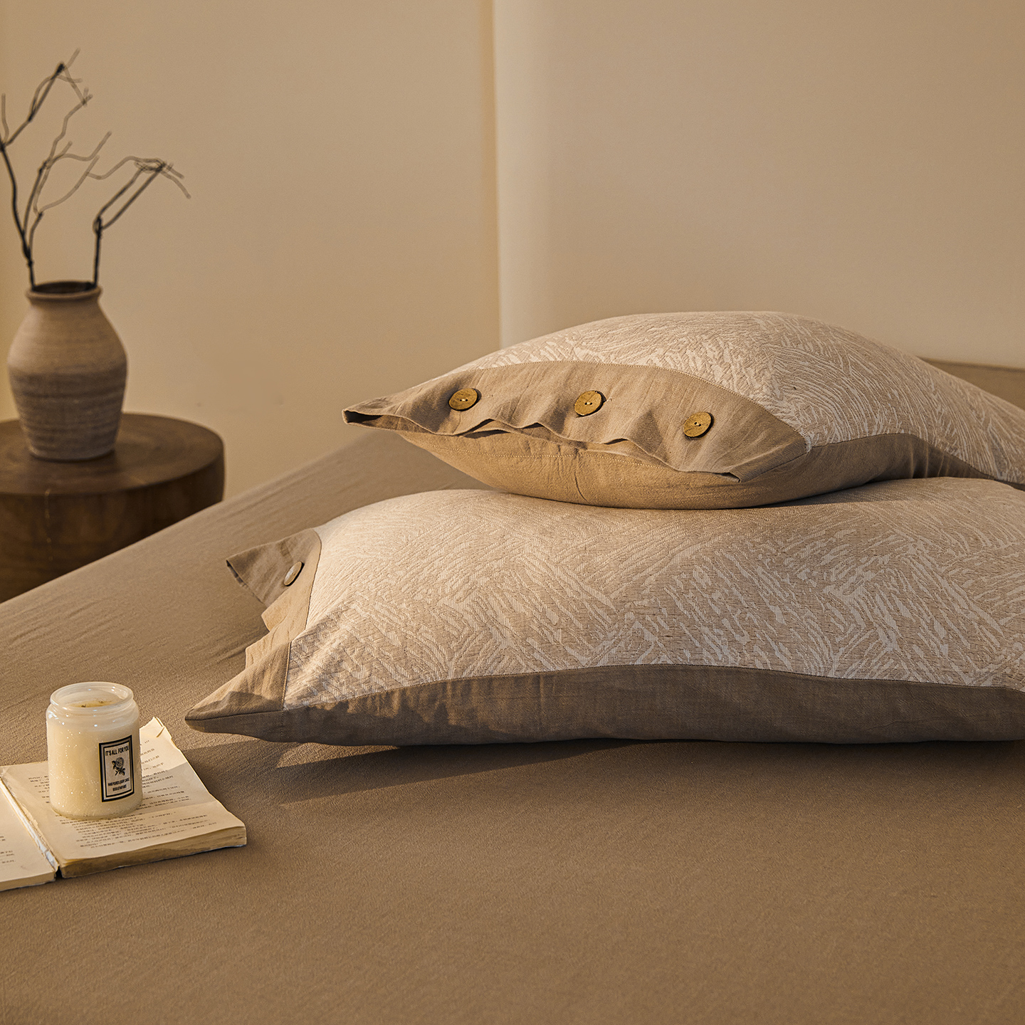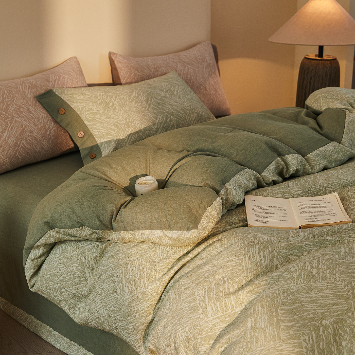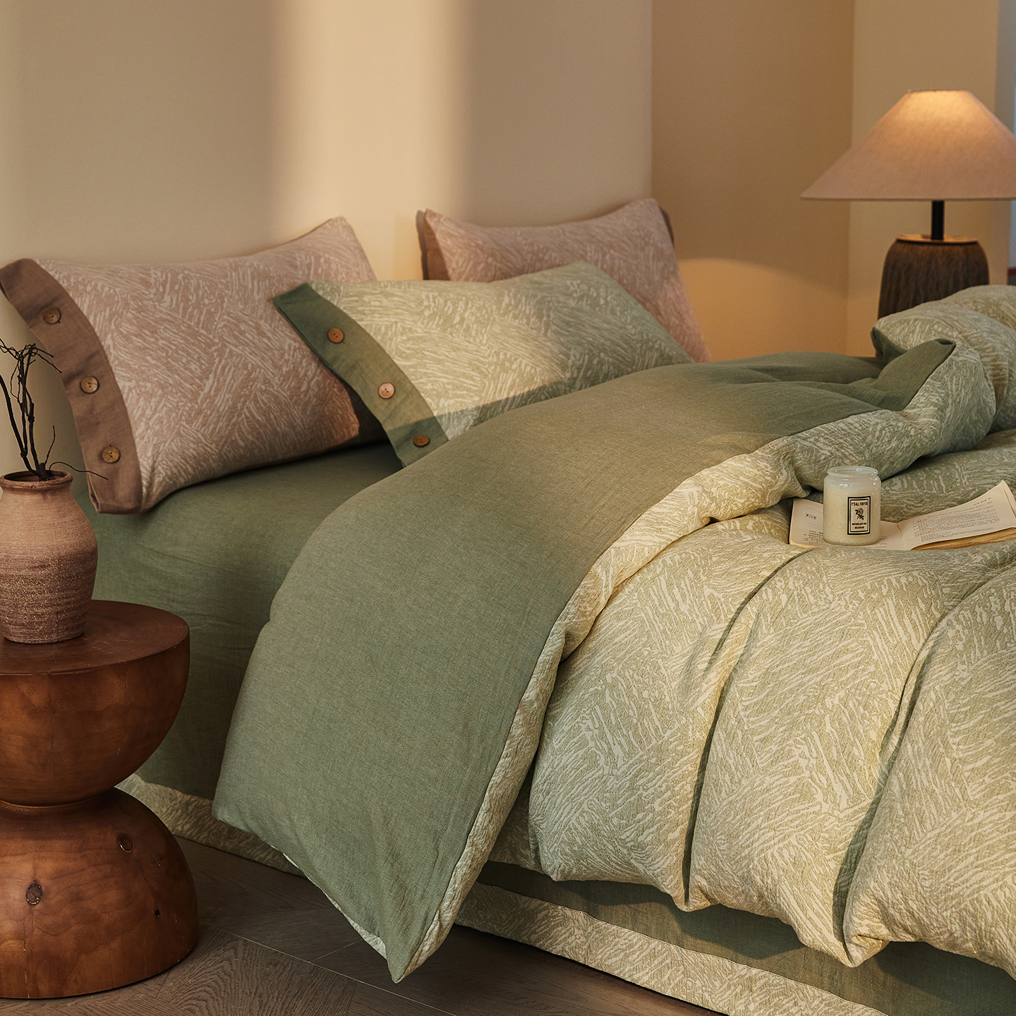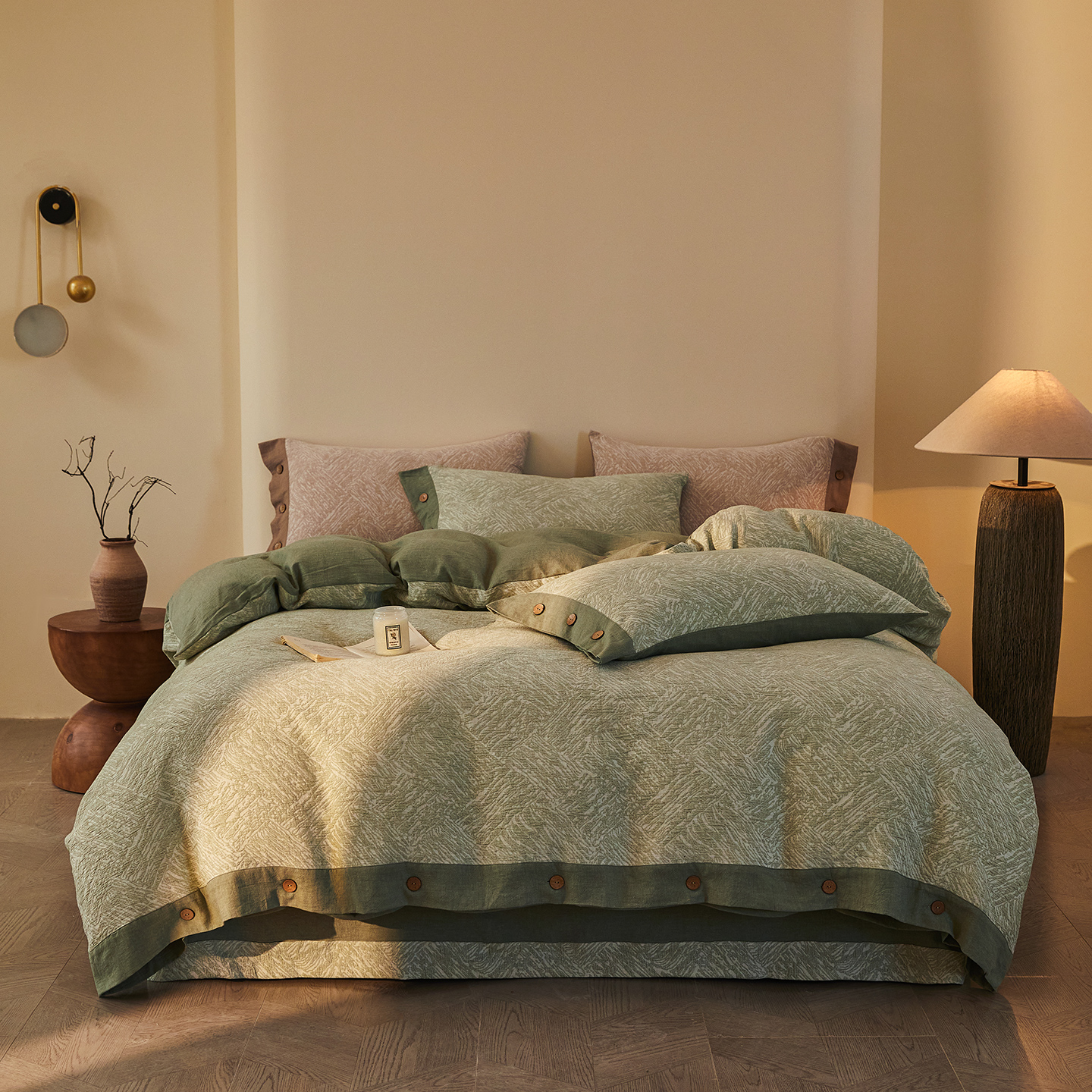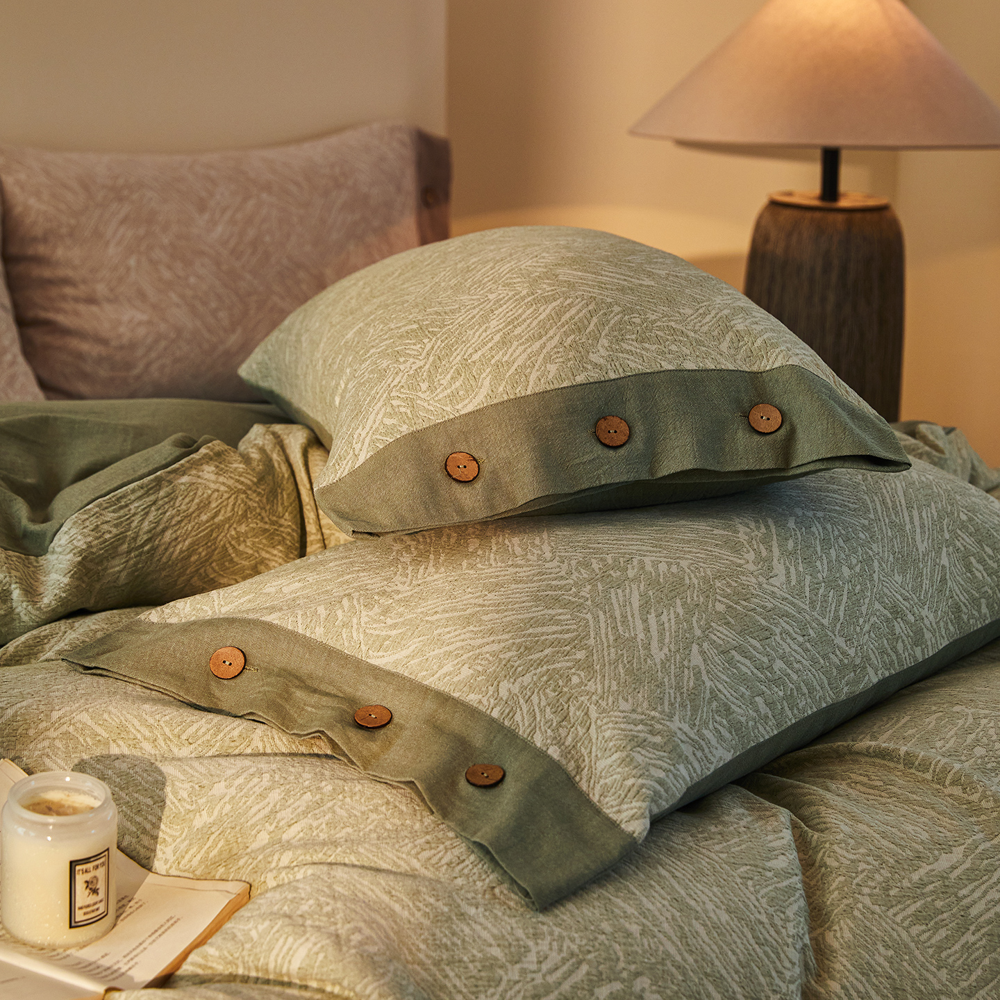 (总)仰望棉麻双层纱供应链 2026新款全棉色织提花双层纱纽扣款四件套-森意棉棉,森意棉棉