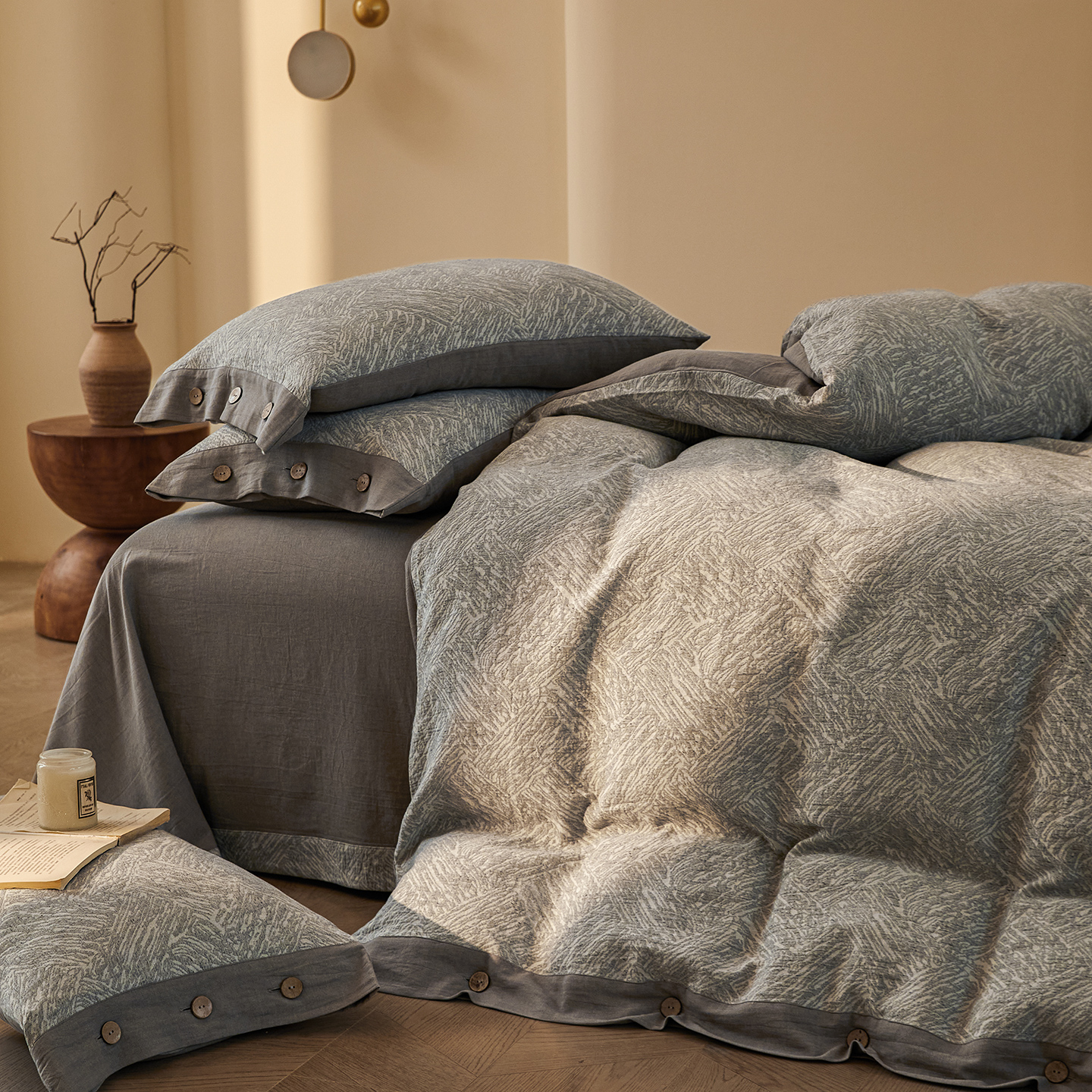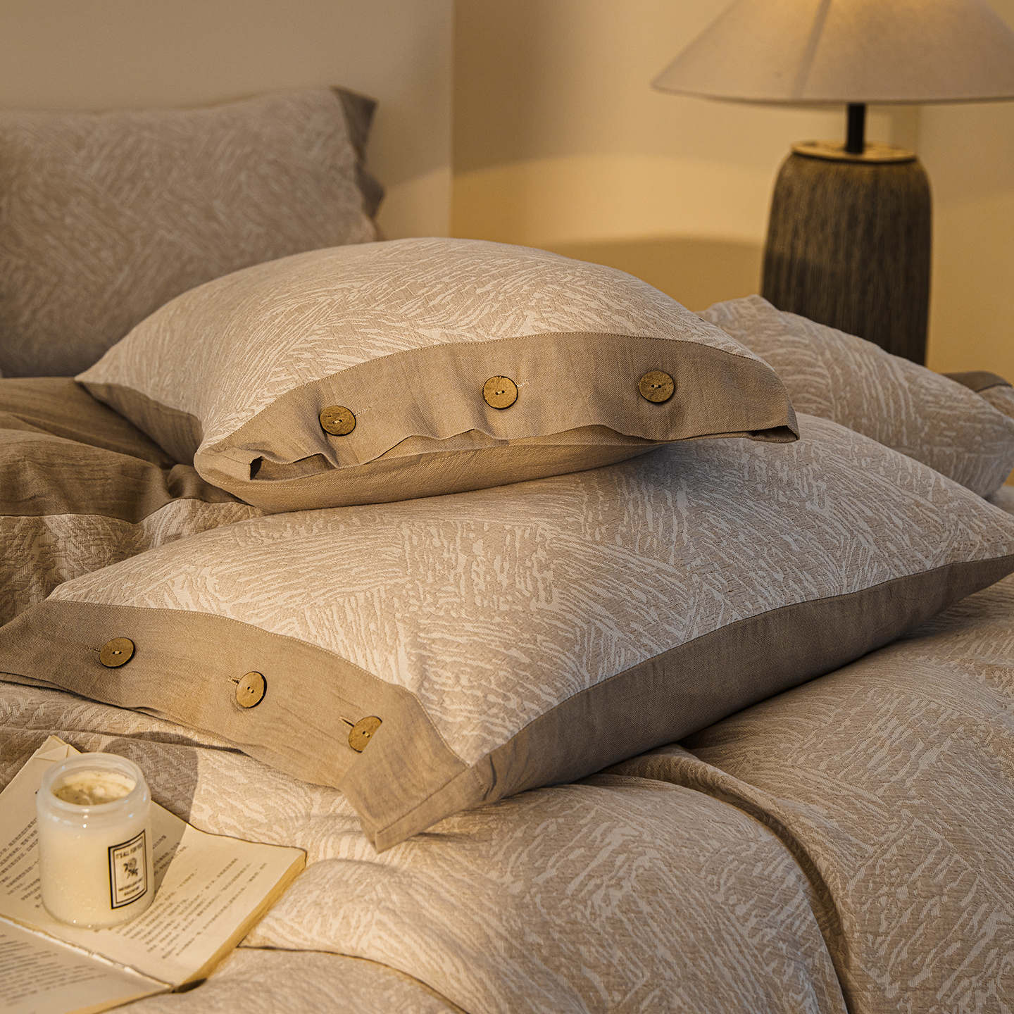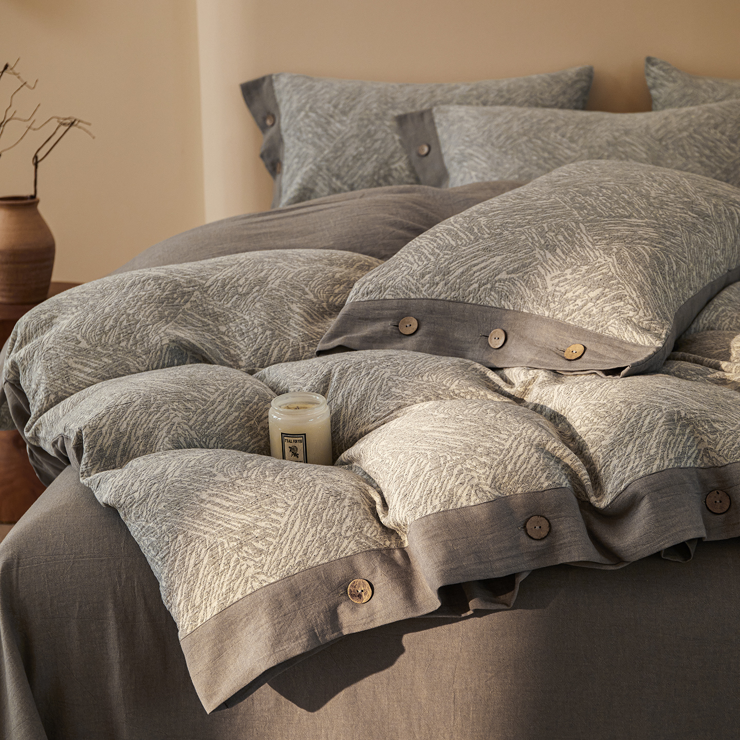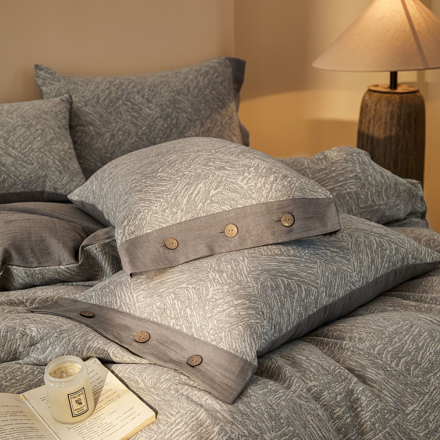 商品名称:(总)仰望棉麻双层纱供应链 2026新款迷雾之城一花三色全棉色织提花双层纱纽扣款四件套