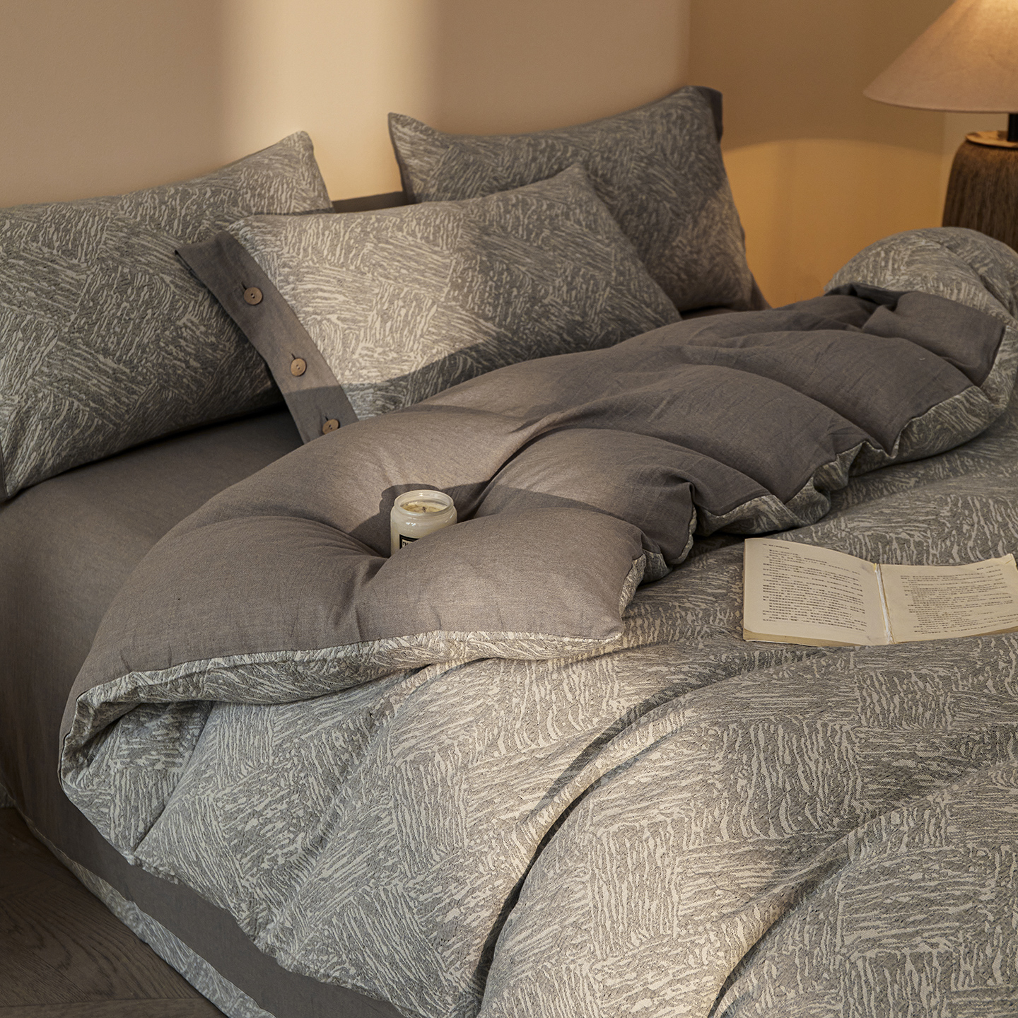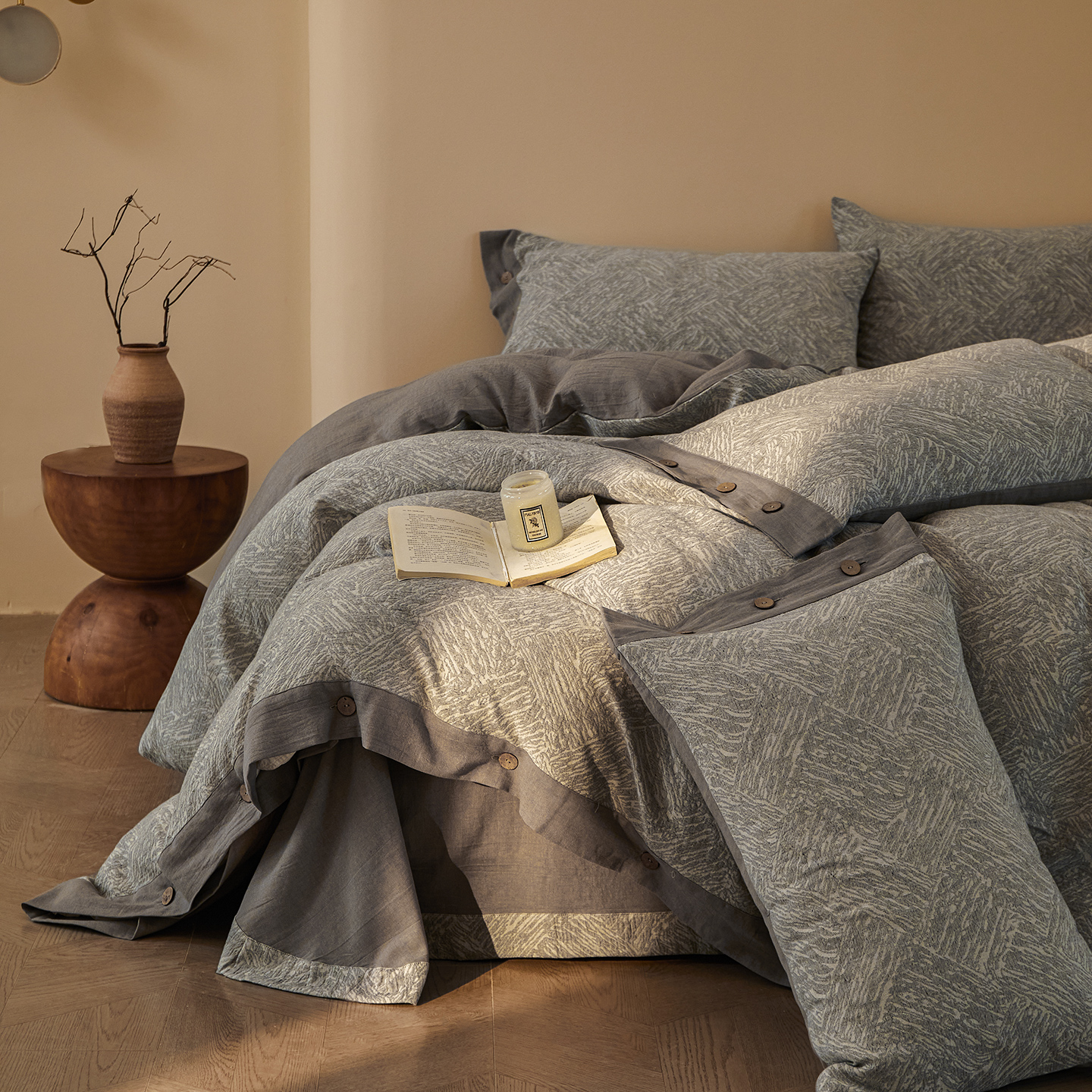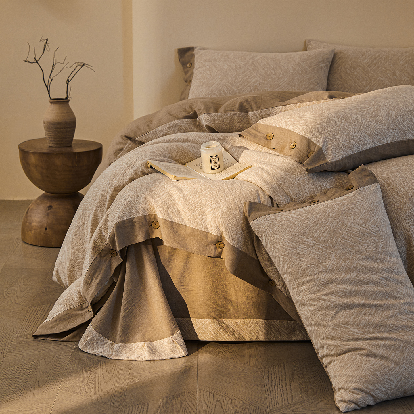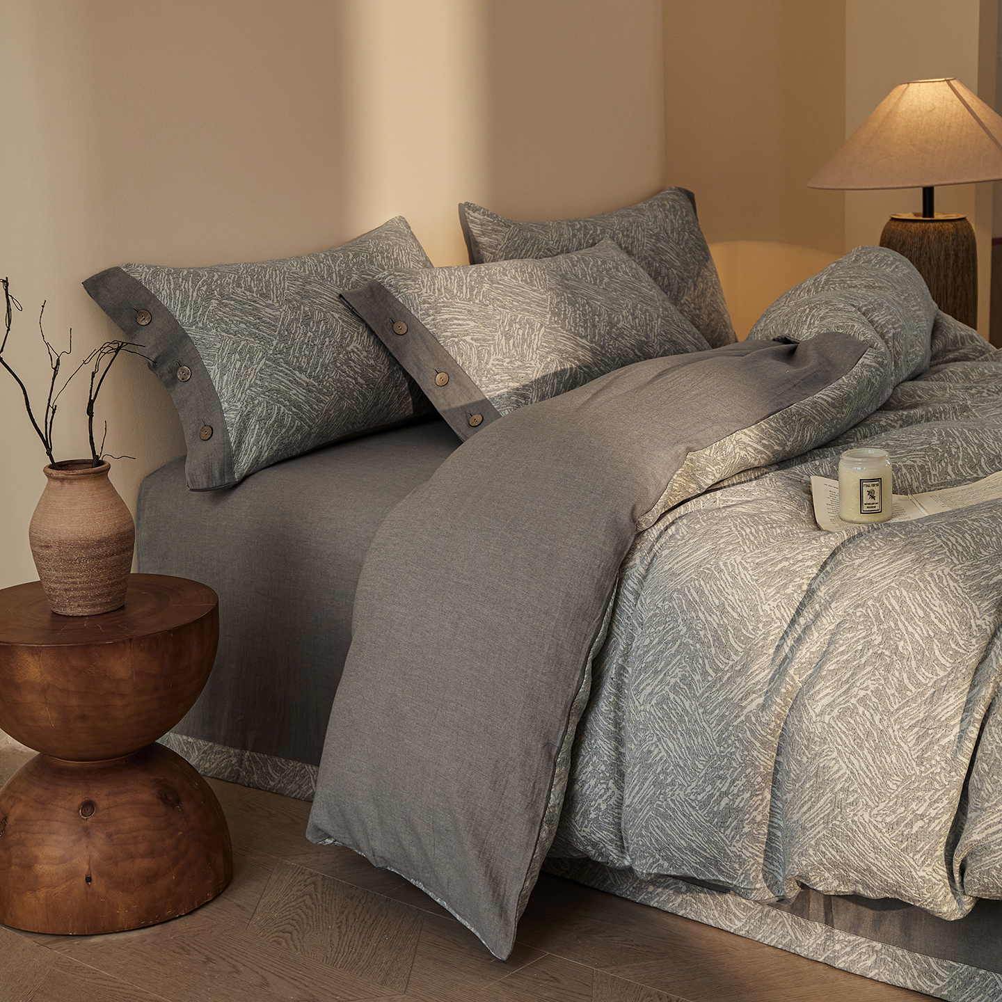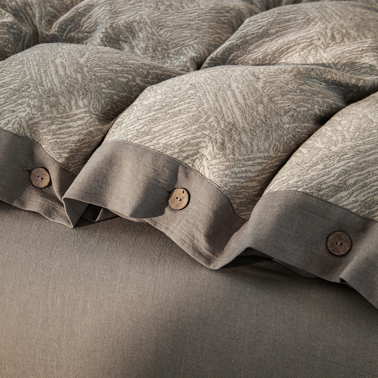 商品名称:(总)仰望棉麻双层纱供应链 2026新款迷雾之城一花三色全棉色织提花双层纱纽扣款四件套