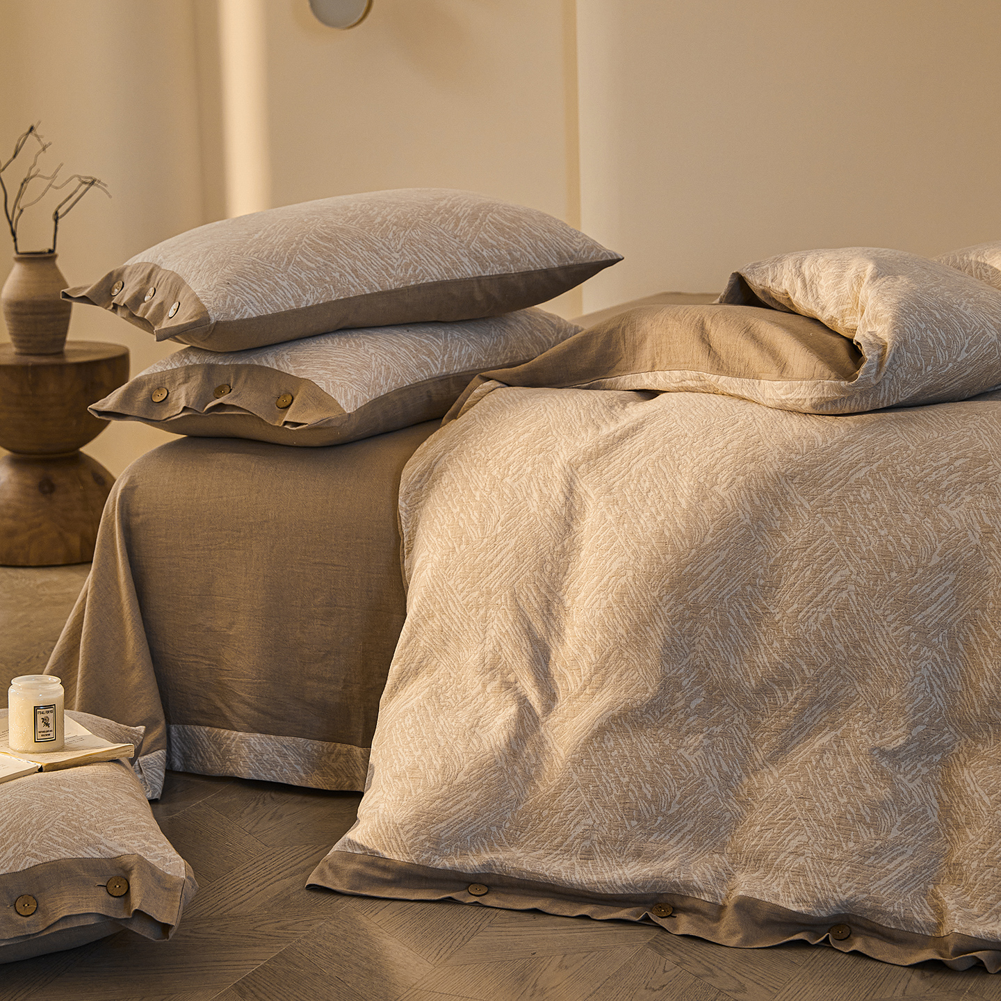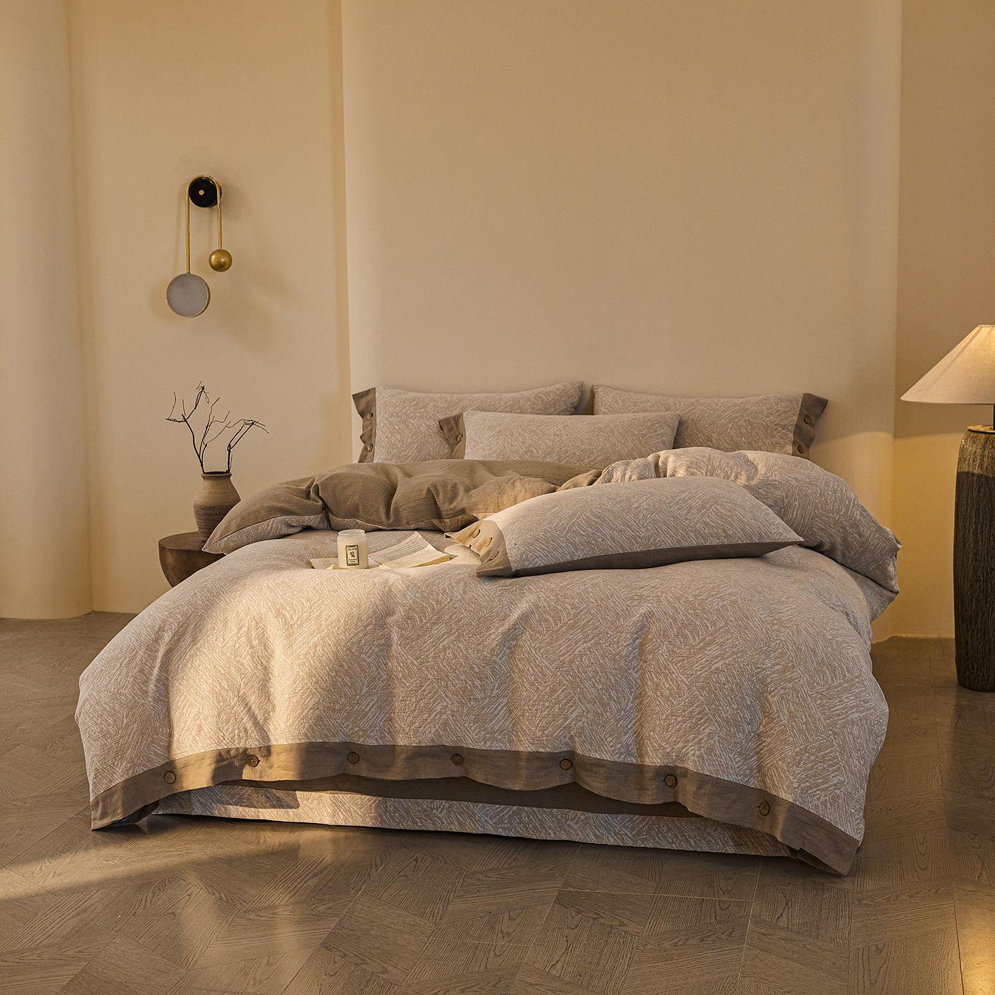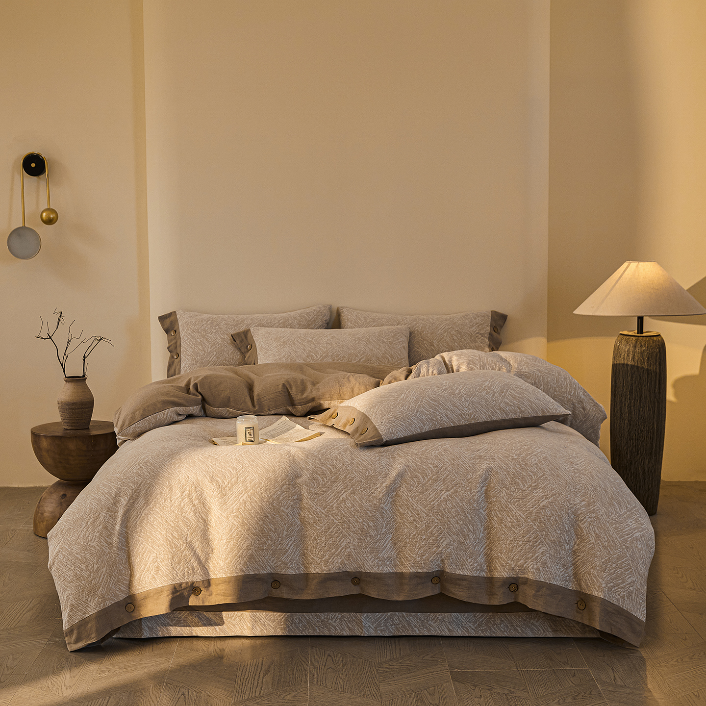 (总)仰望棉麻双层纱供应链 2026新款爱情马全棉色织提花双层纱纽扣款四件套,爱情马-棕