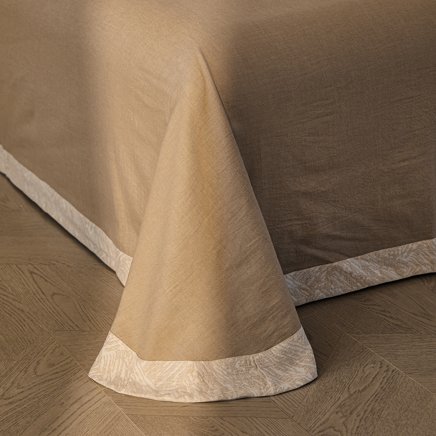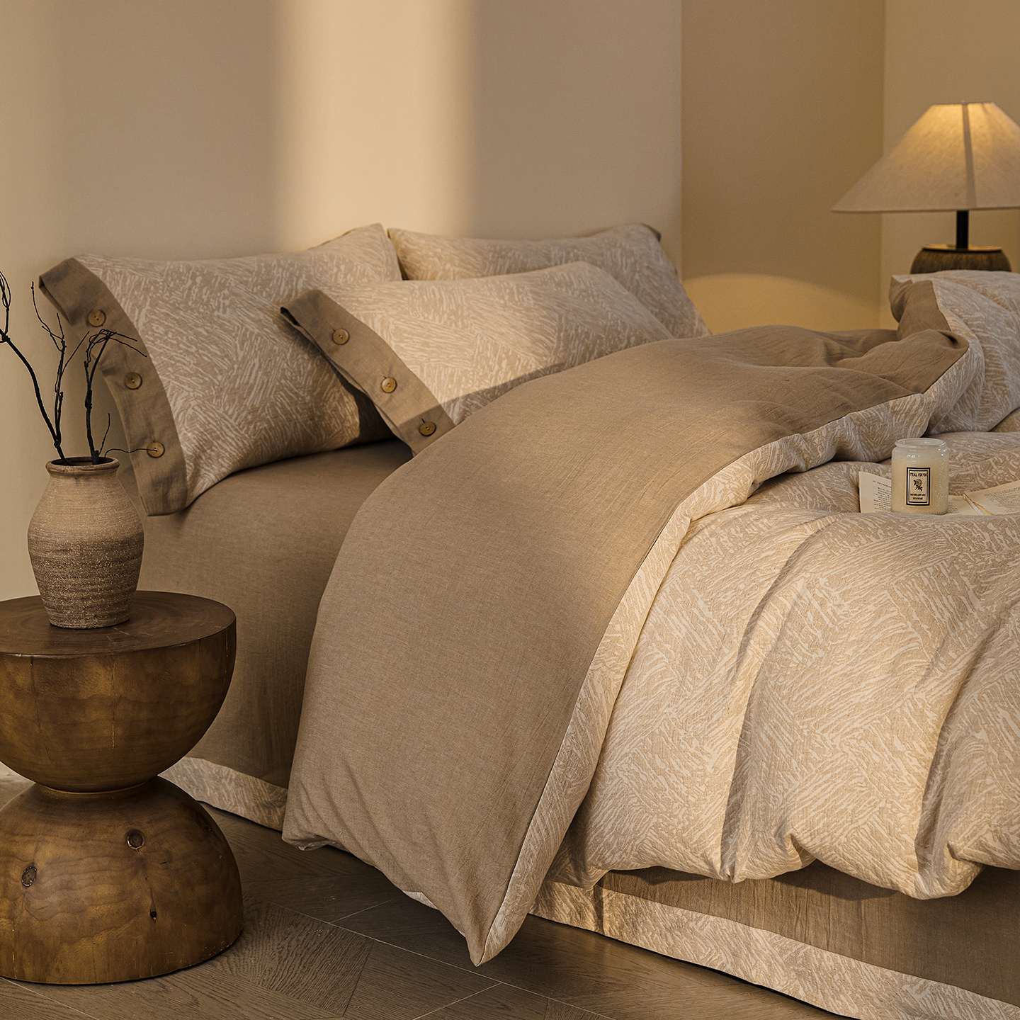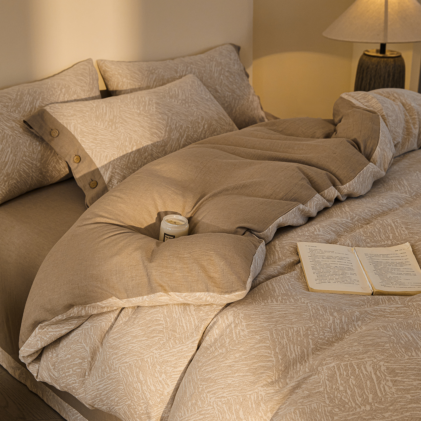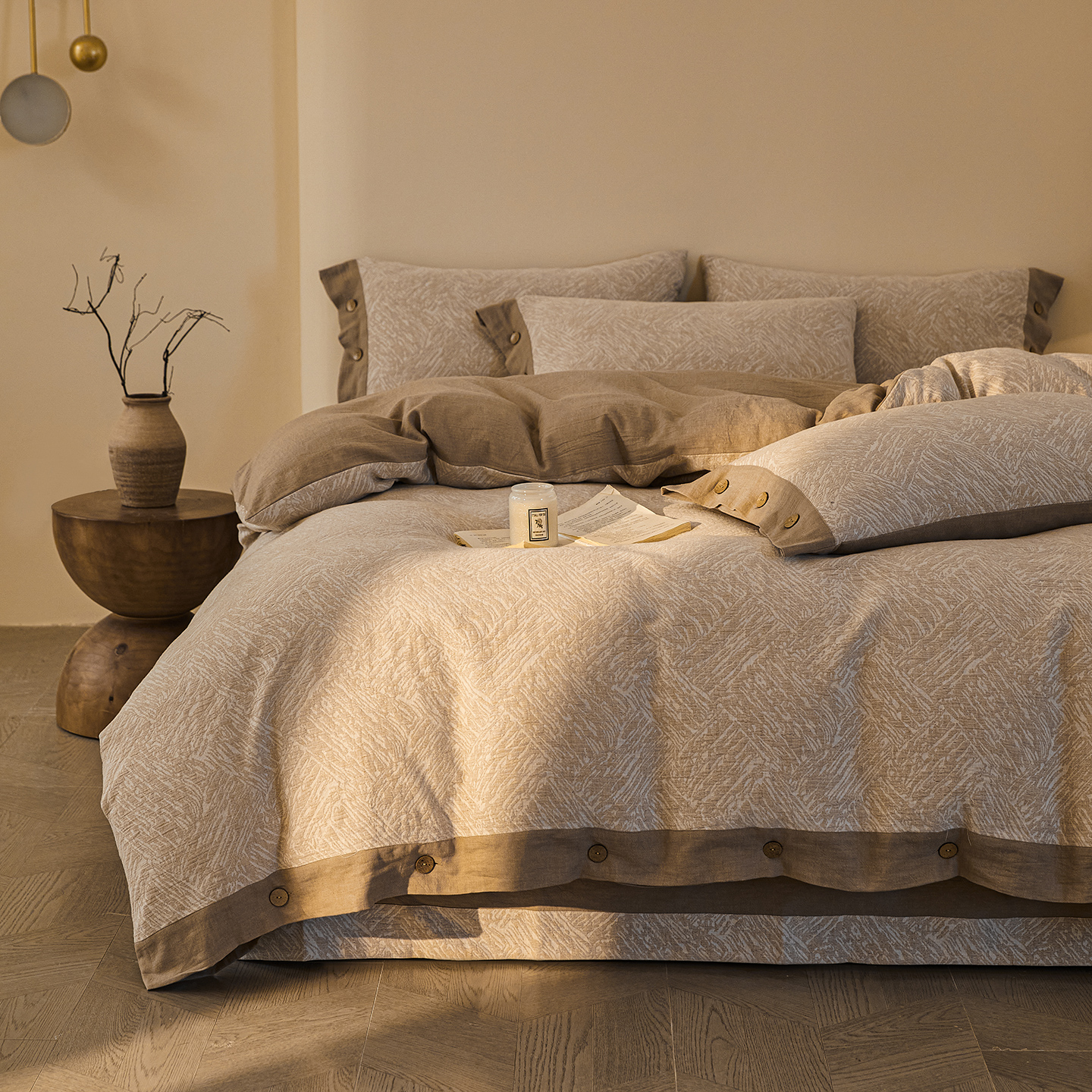 (总)仰望棉麻双层纱供应链 2026新款爱情马全棉色织提花双层纱纽扣款四件套,爱情马-棕