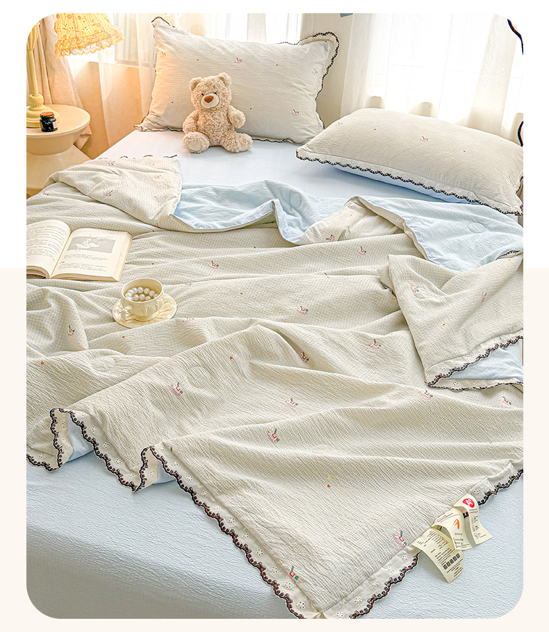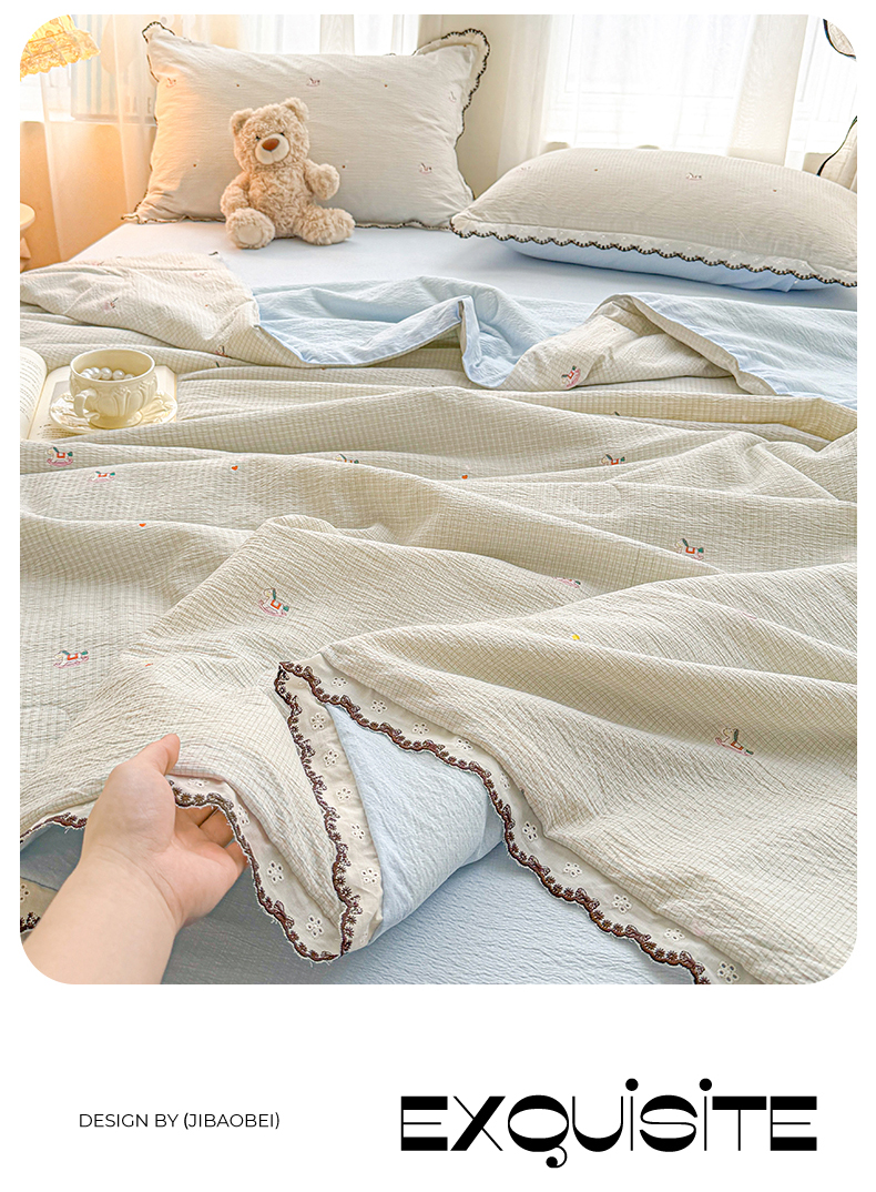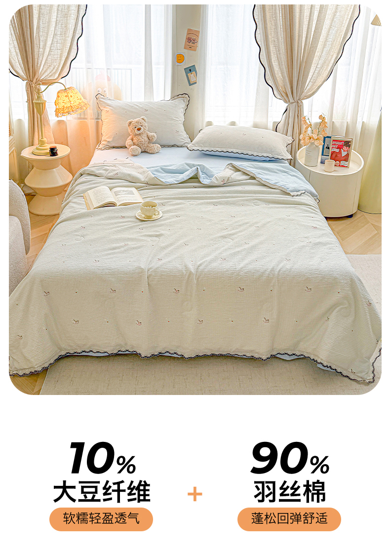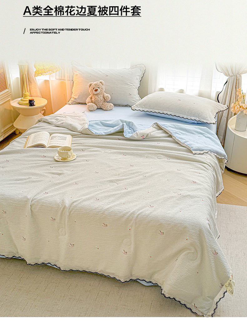 招财星家纺 2026新款A类全棉花边云感双层纱大豆纤维夏被四件套夏被夏凉被空调被(带质检报告买家秀) 花边款-格子木马-蓝