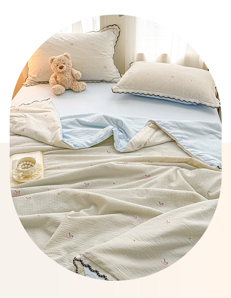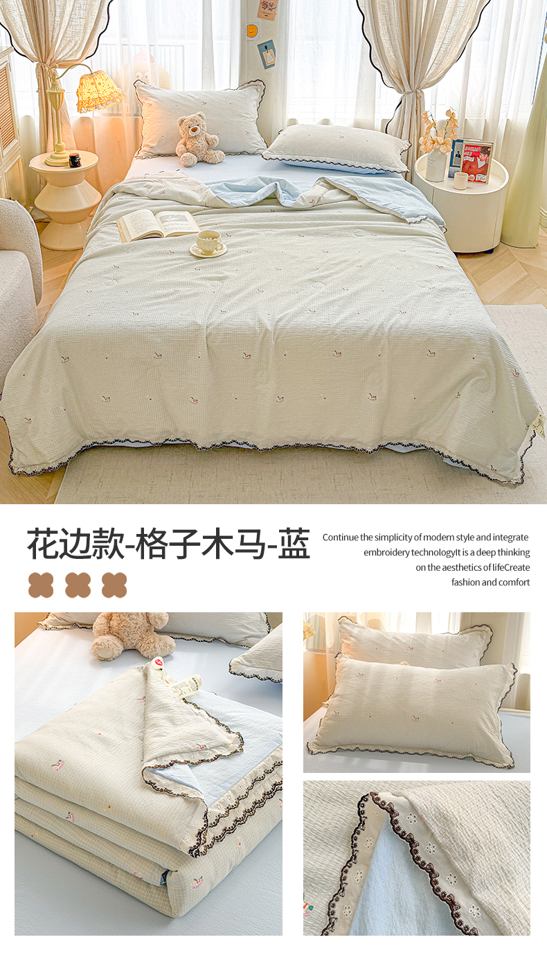• 91家纺网 家纺一手货源 找家纺 招财星家纺 2026新款A类全棉花边云感双层纱大豆纤维夏被四件套夏被夏凉被空调被(带质检报告买家秀) 花边款-格子木马-蓝