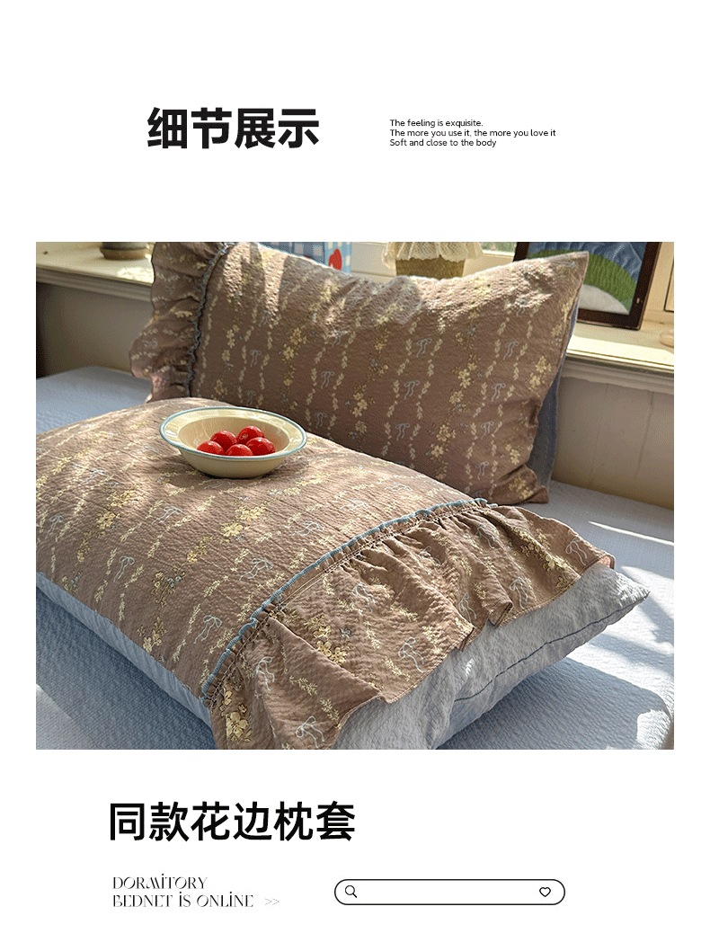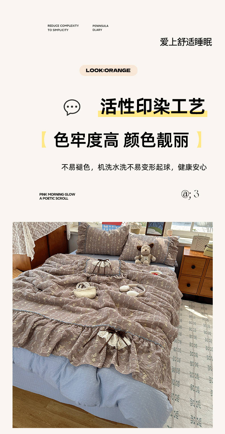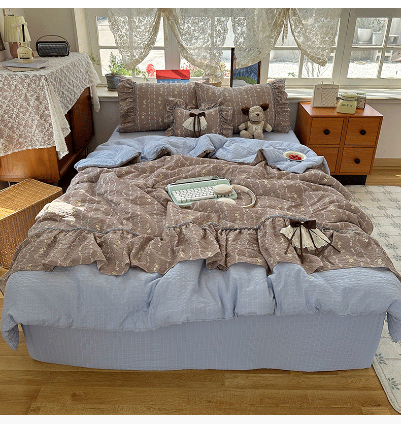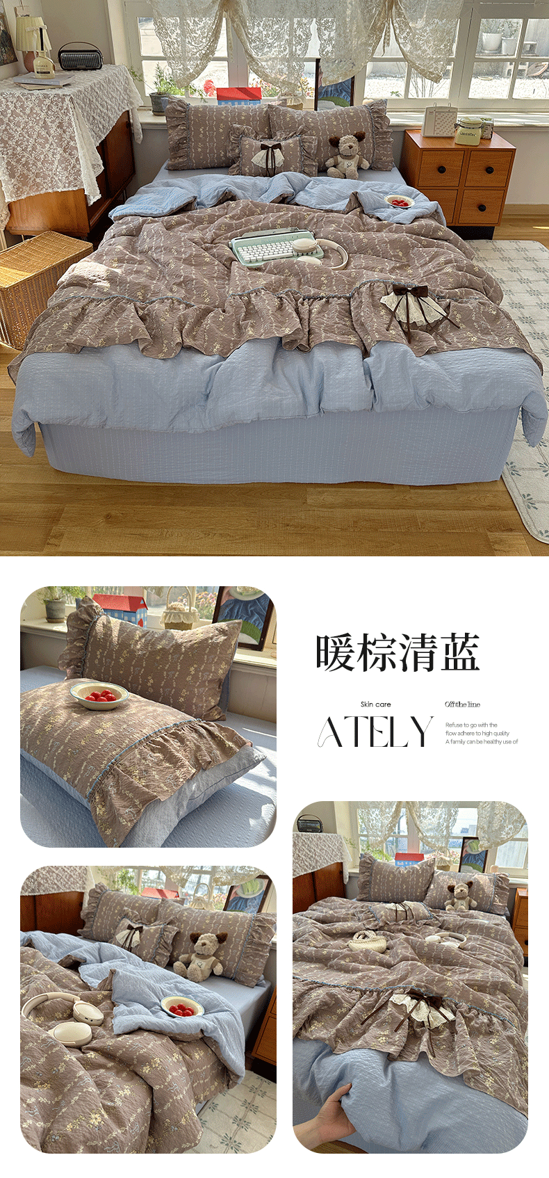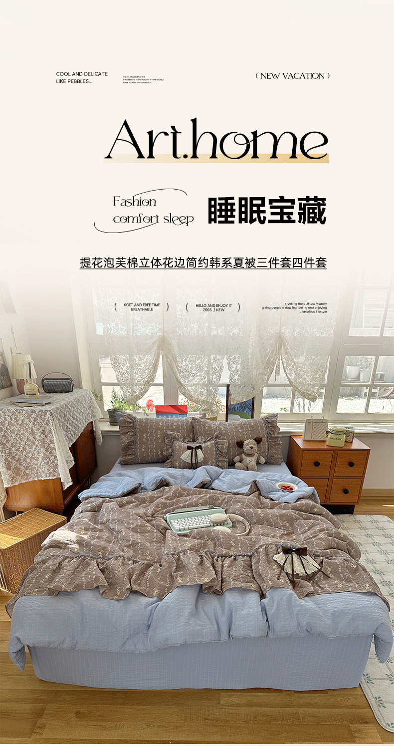 当前位置: 91家纺网 > 商品网购 > 床品套件 > 四件套 > 化纤普通四件套 > 栩裕纺织 2026新款提花泡芙棉立体花边简约韩系夏被-夏被三件套四件套 暖棕清蓝