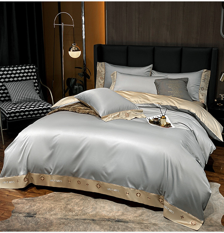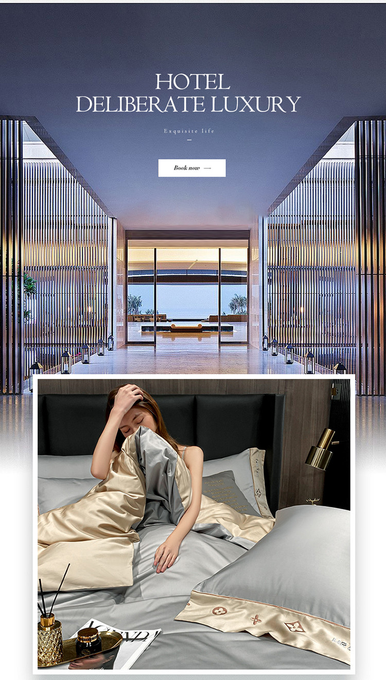 蓝米卡夫新款高档酒店款全棉贡缎长绒棉刺绣四件套卡夫银灰+香槟