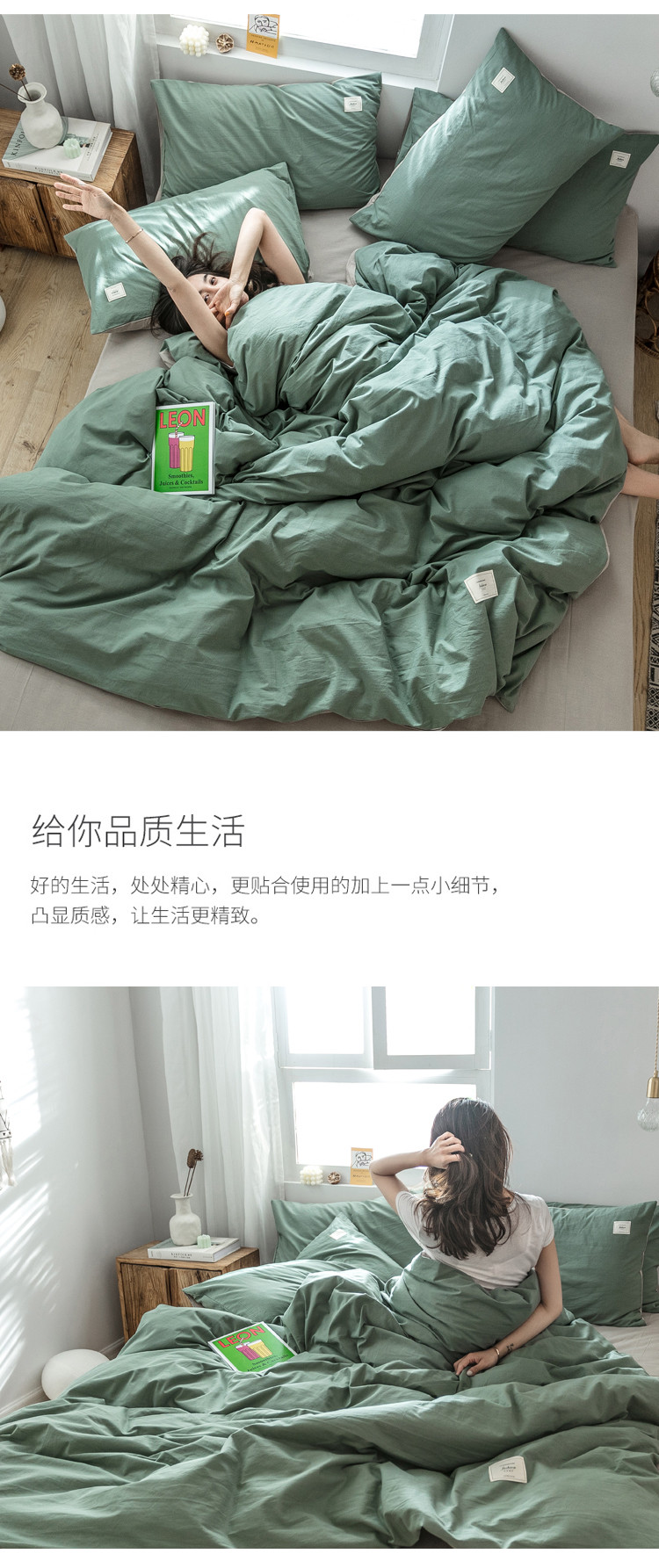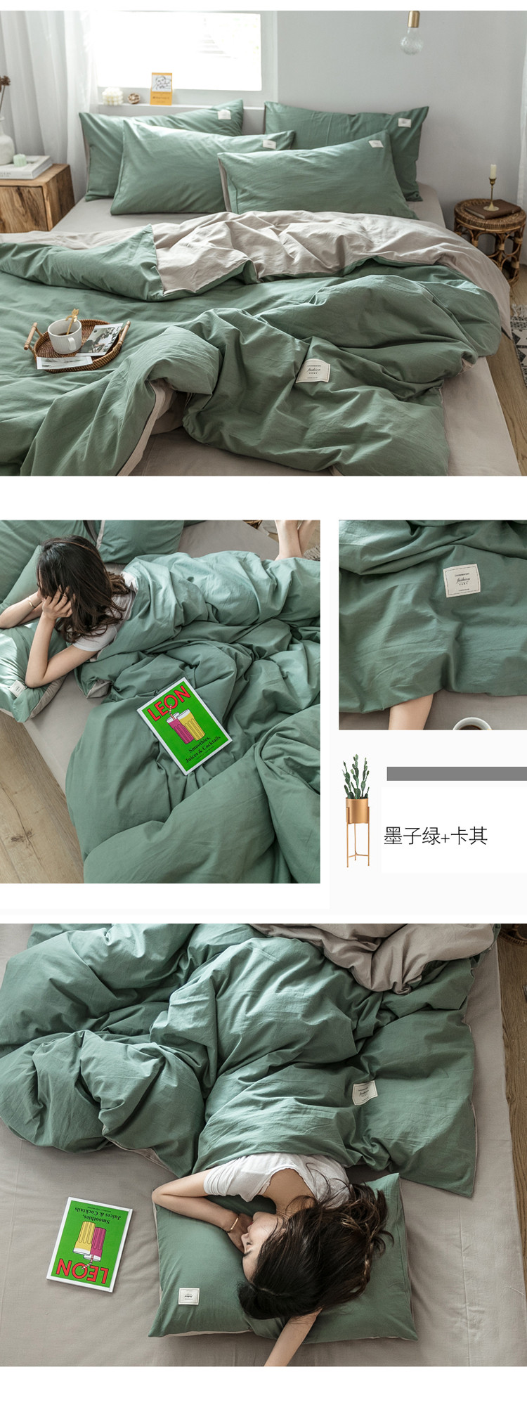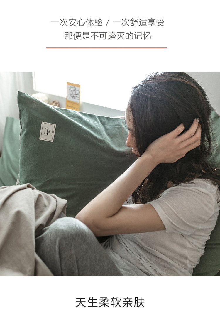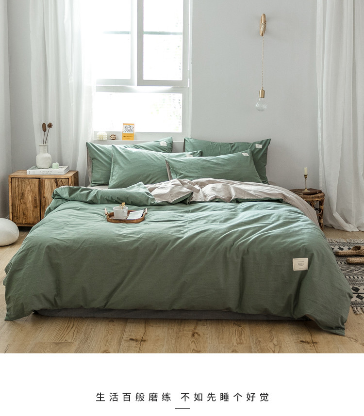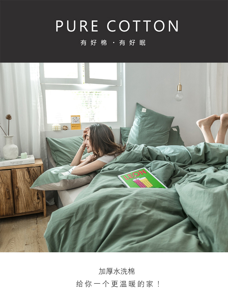 雅居纺 2022新款全棉水洗棉四件套 墨子绿+卡其