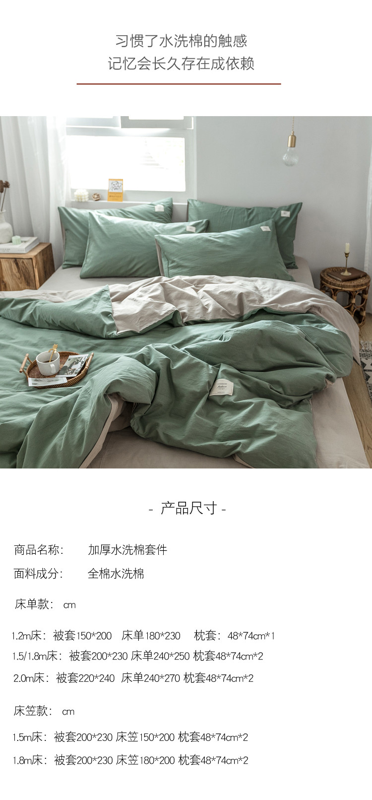 商品名称:雅居纺 2022新款全棉水洗棉四件套 墨子绿+卡其