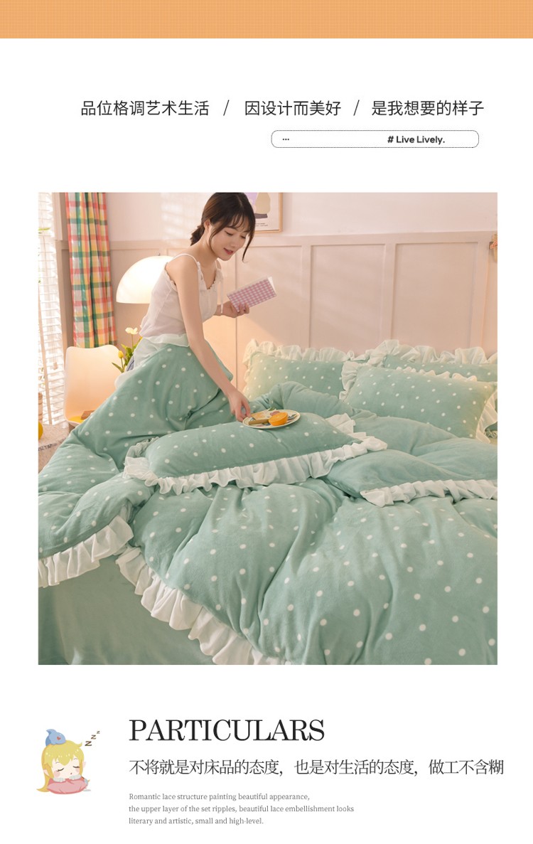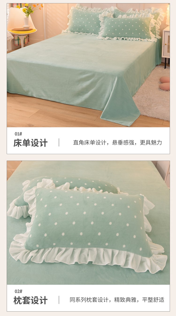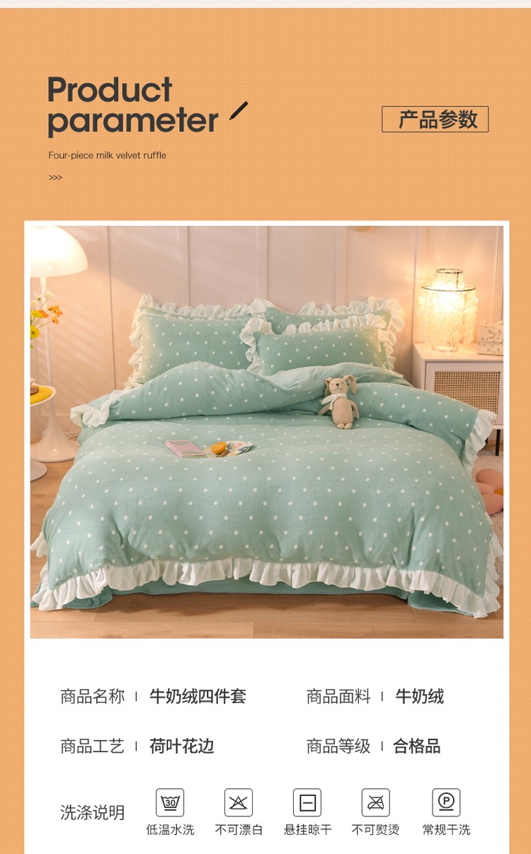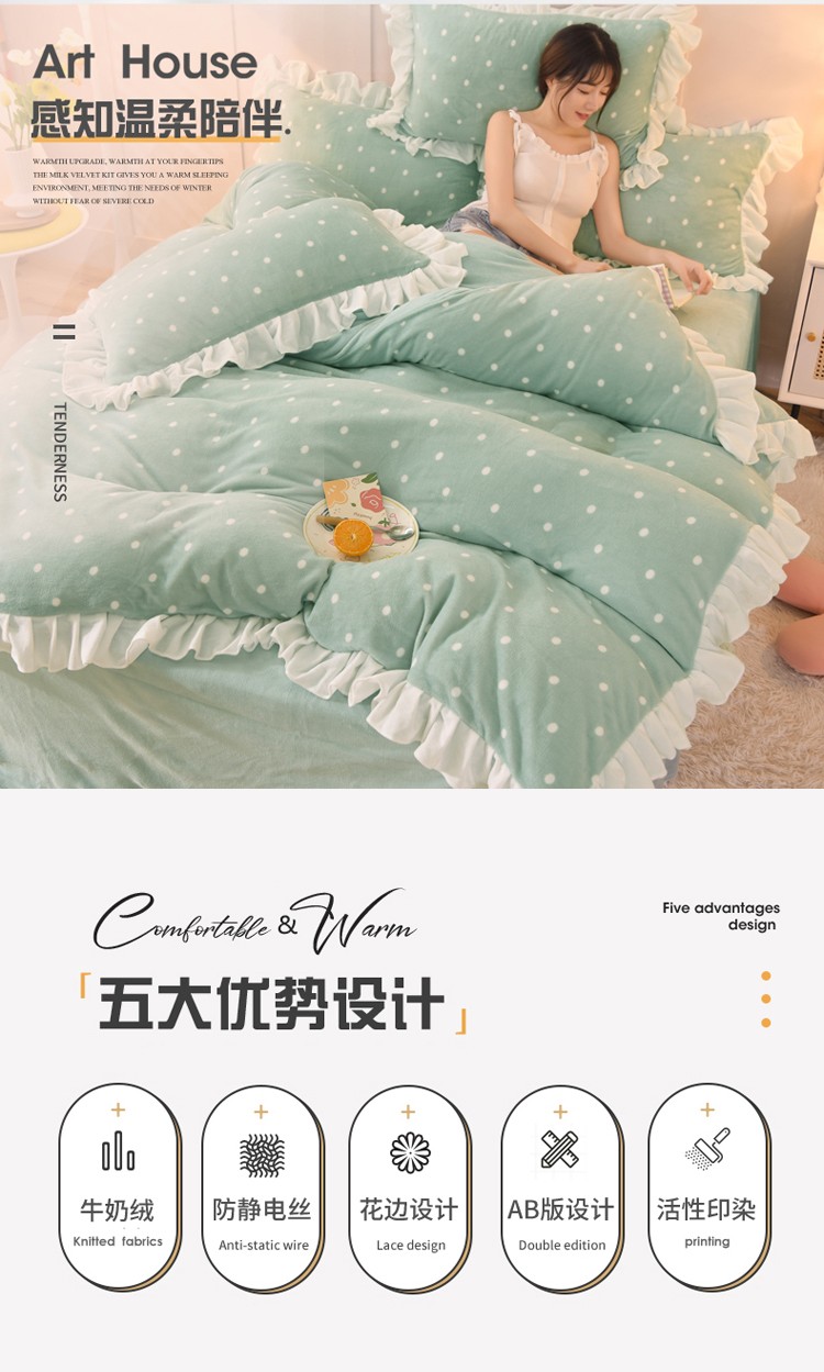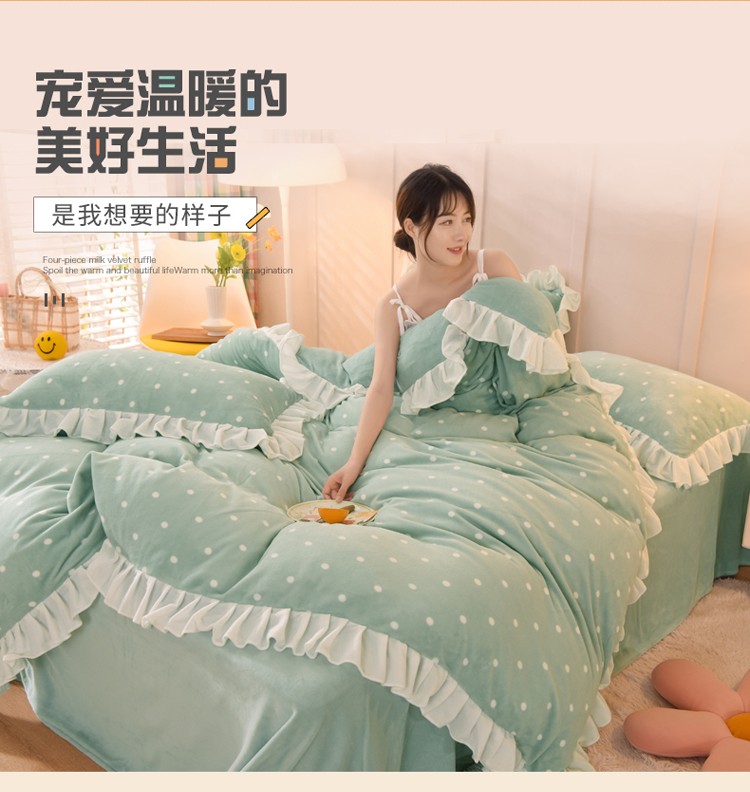 商品名称:绒世界 2022新款牛奶绒花边款四件套-爱心 绿-波点