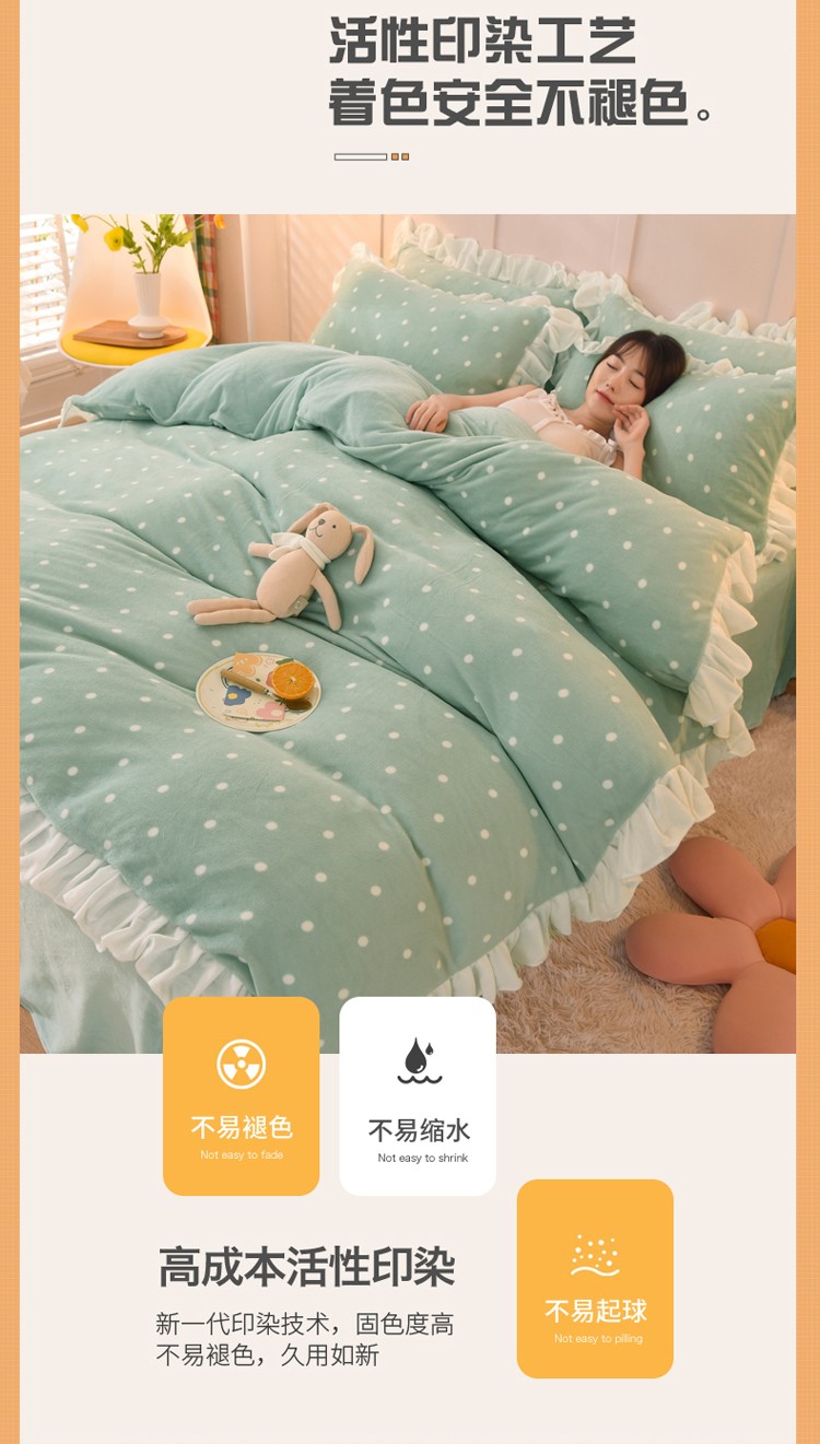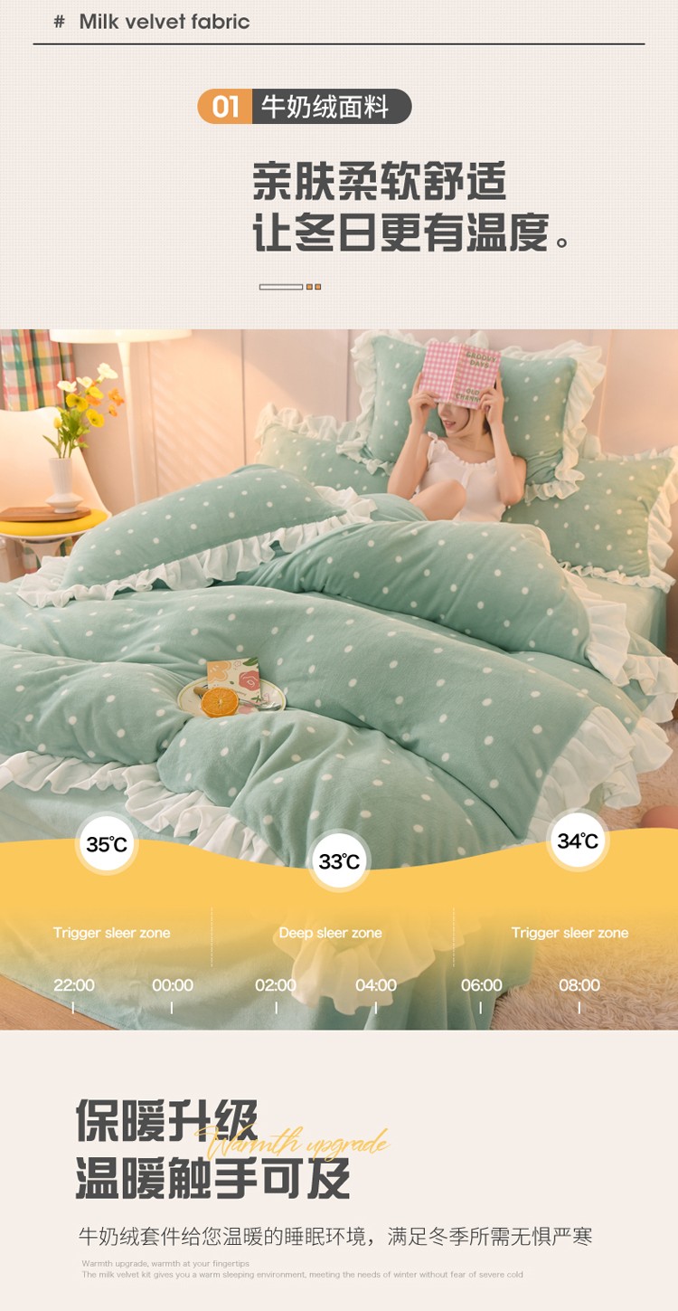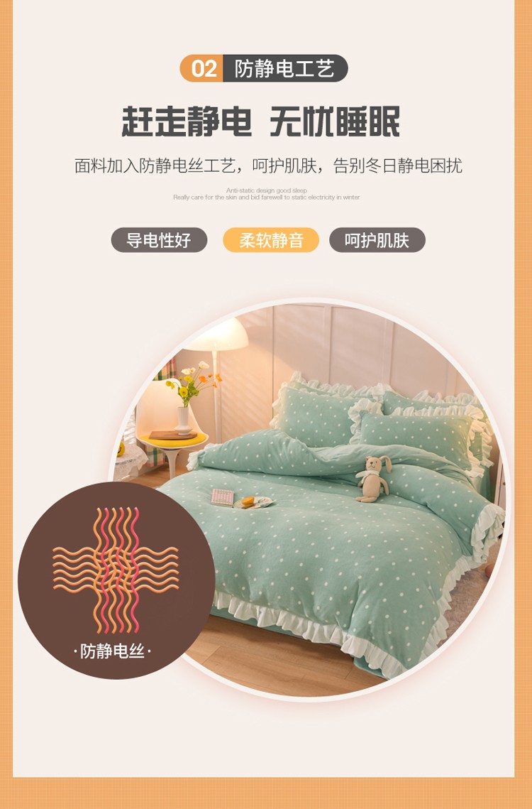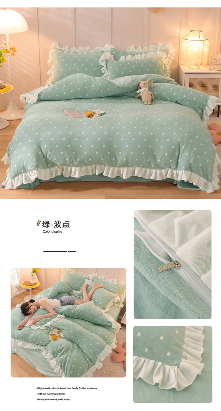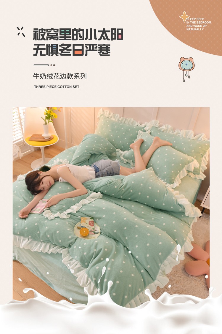 商品名称:绒世界 2022新款牛奶绒花边款四件套-爱心 绿-波点