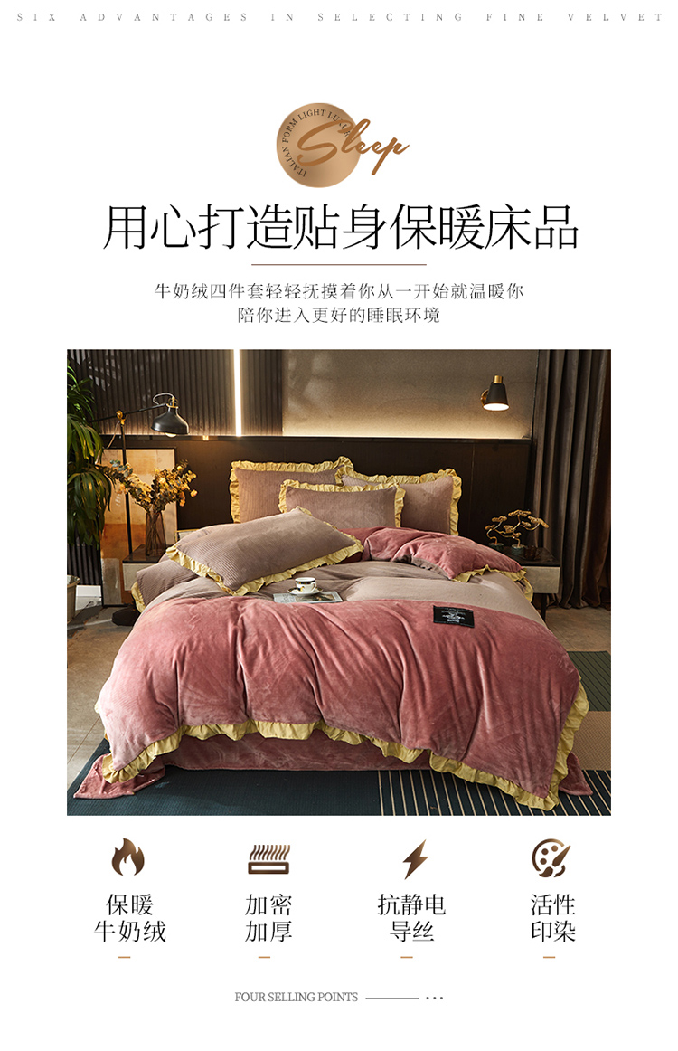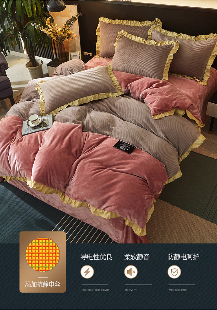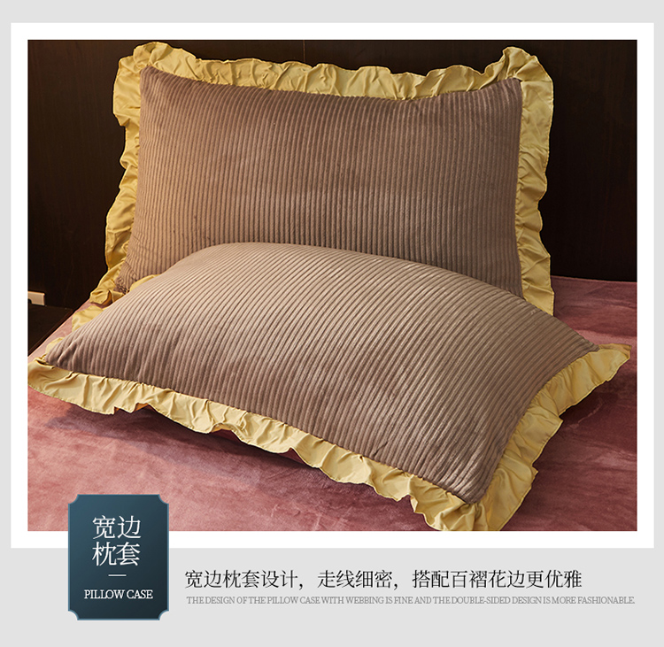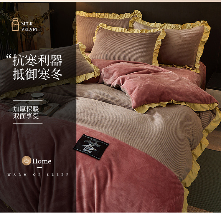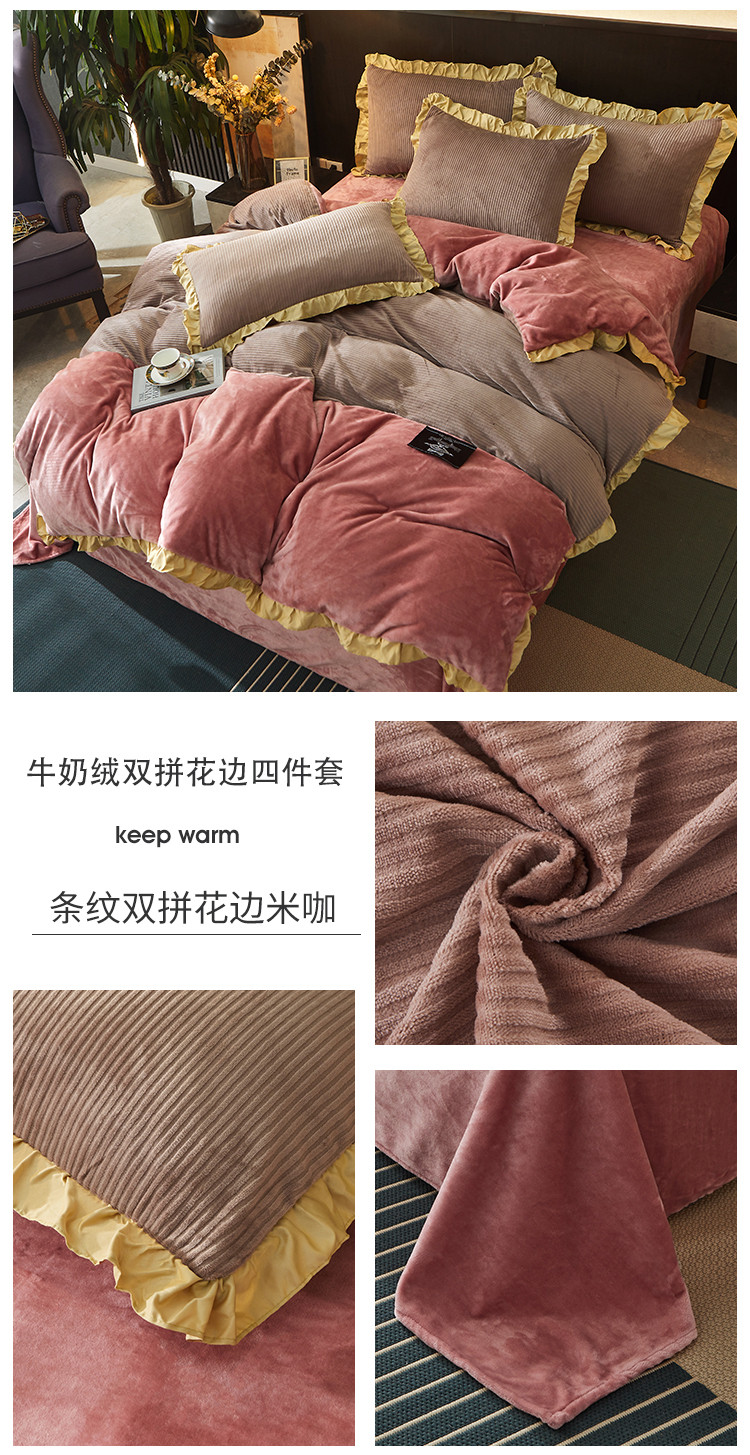 商品名称:芃成家纺 2021新款牛奶绒双拼花边四件套 条纹双拼花边米咖