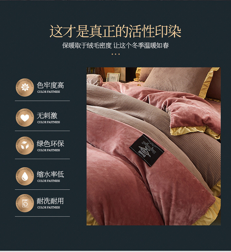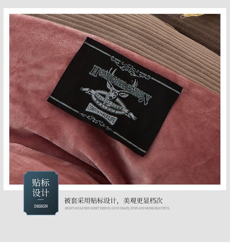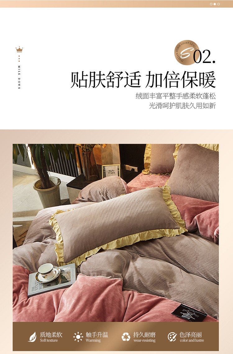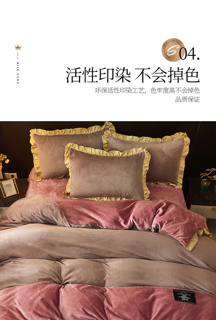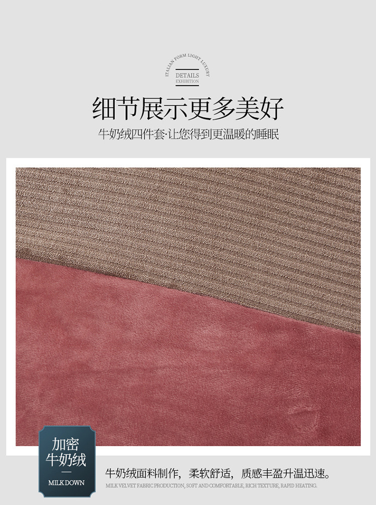 商品名称:芃成家纺 2021新款牛奶绒双拼花边四件套 条纹双拼花边米咖