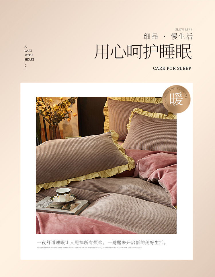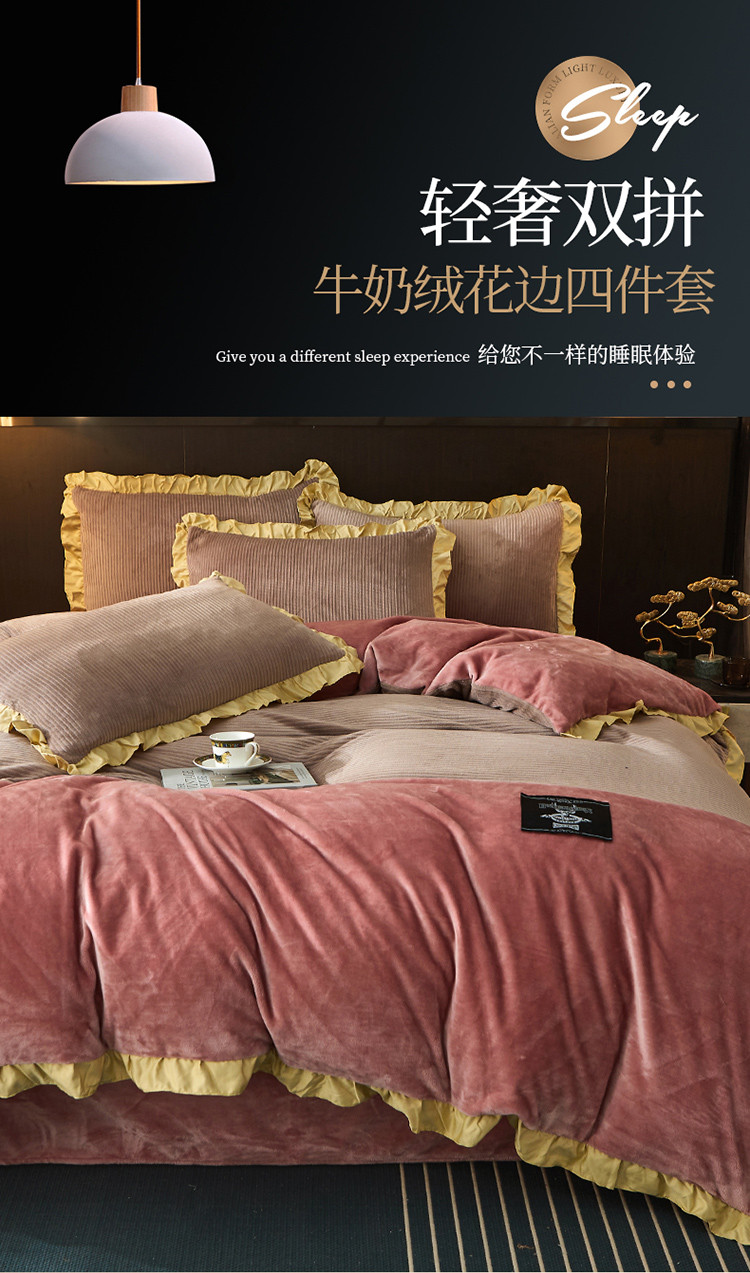 芃成家纺 2021新款牛奶绒双拼花边四件套 条纹双拼花边米咖