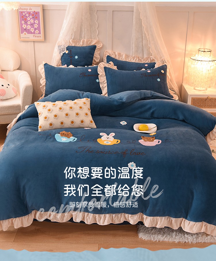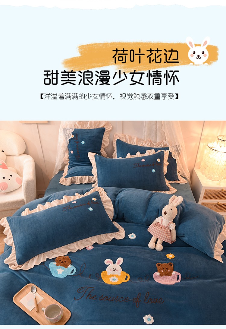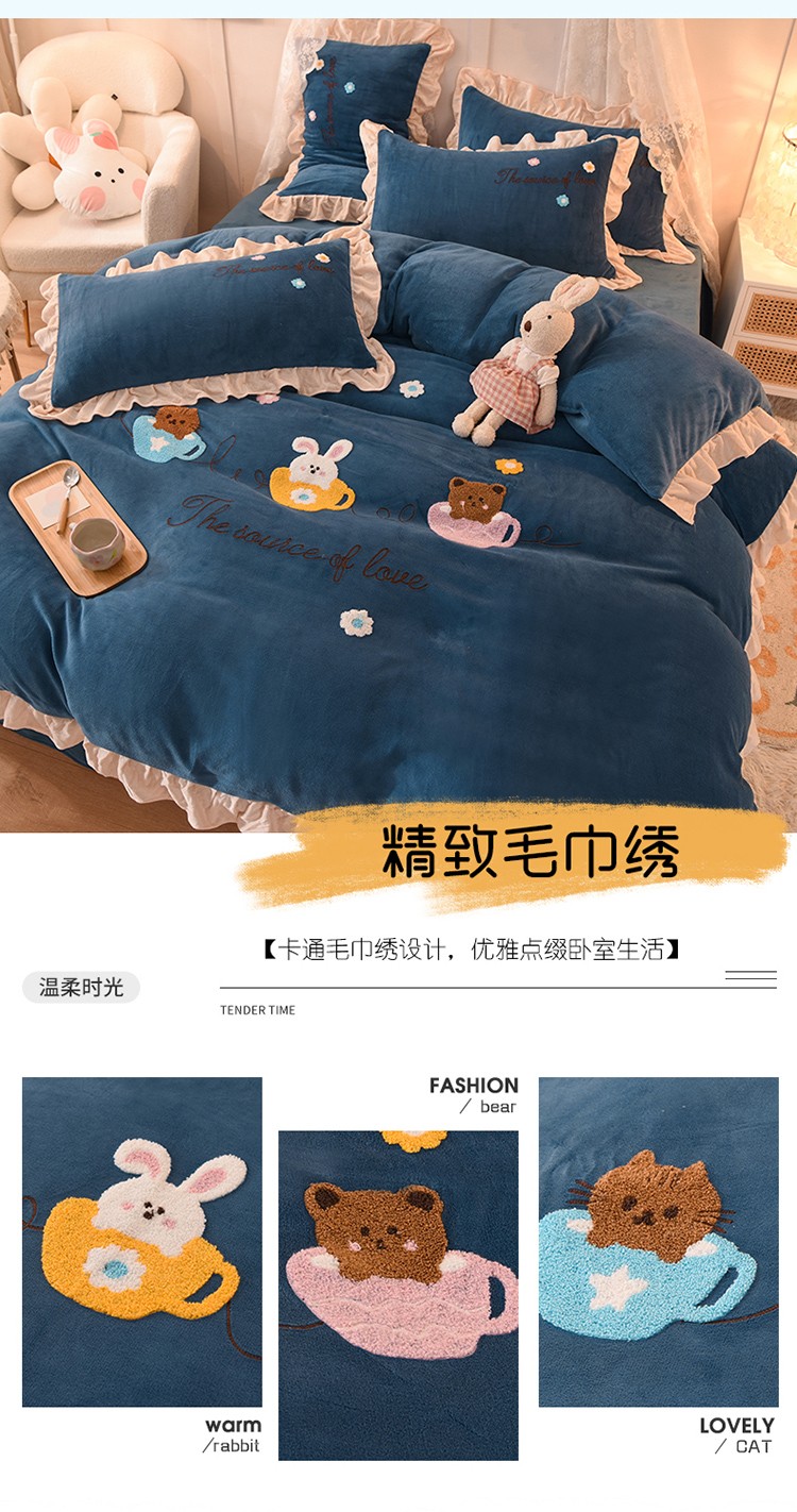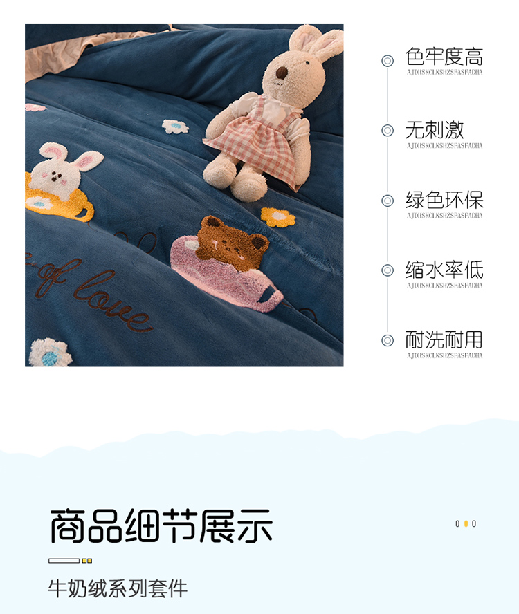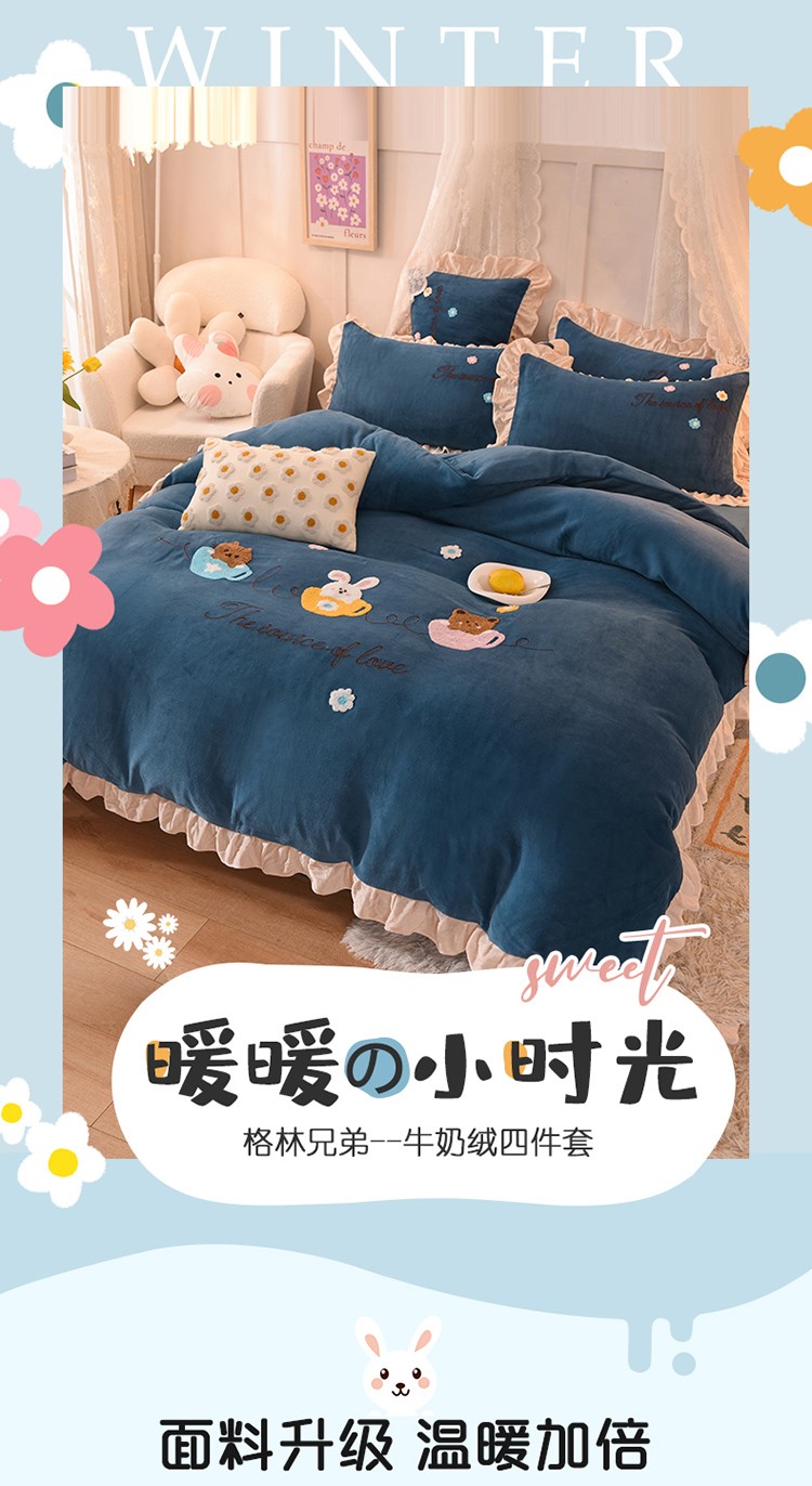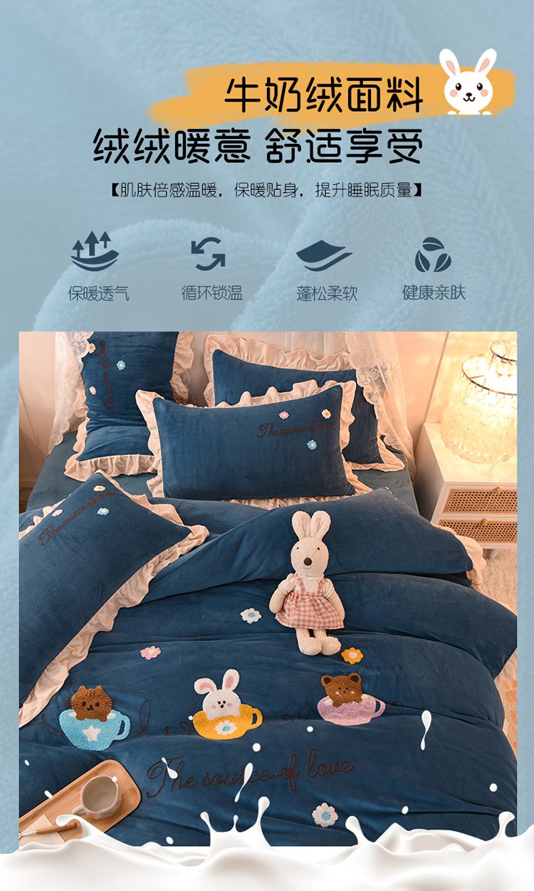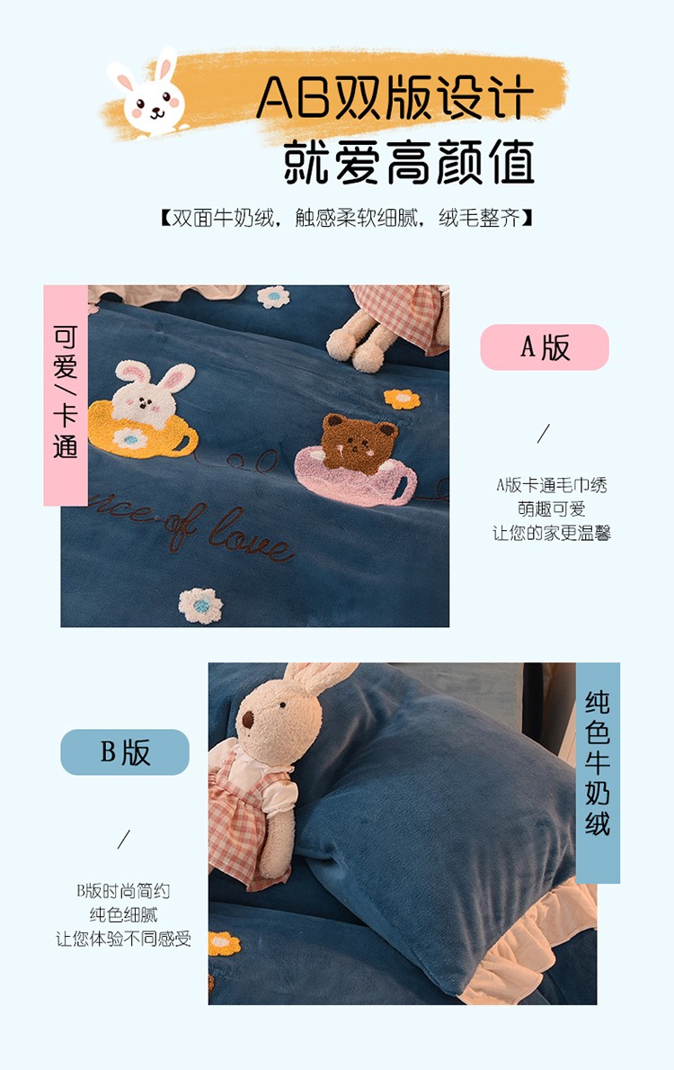 大米家居2023新款卡通毛巾绣牛奶绒宝宝绒四件套格林兄弟海蓝
