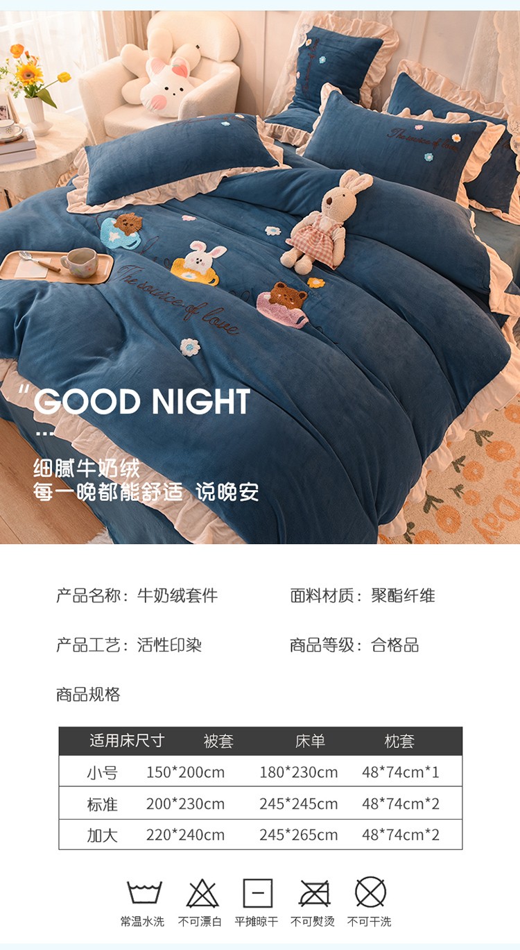 商品名称:大米家居2023新款卡通毛巾绣牛奶绒宝宝绒四件套格林兄弟海蓝