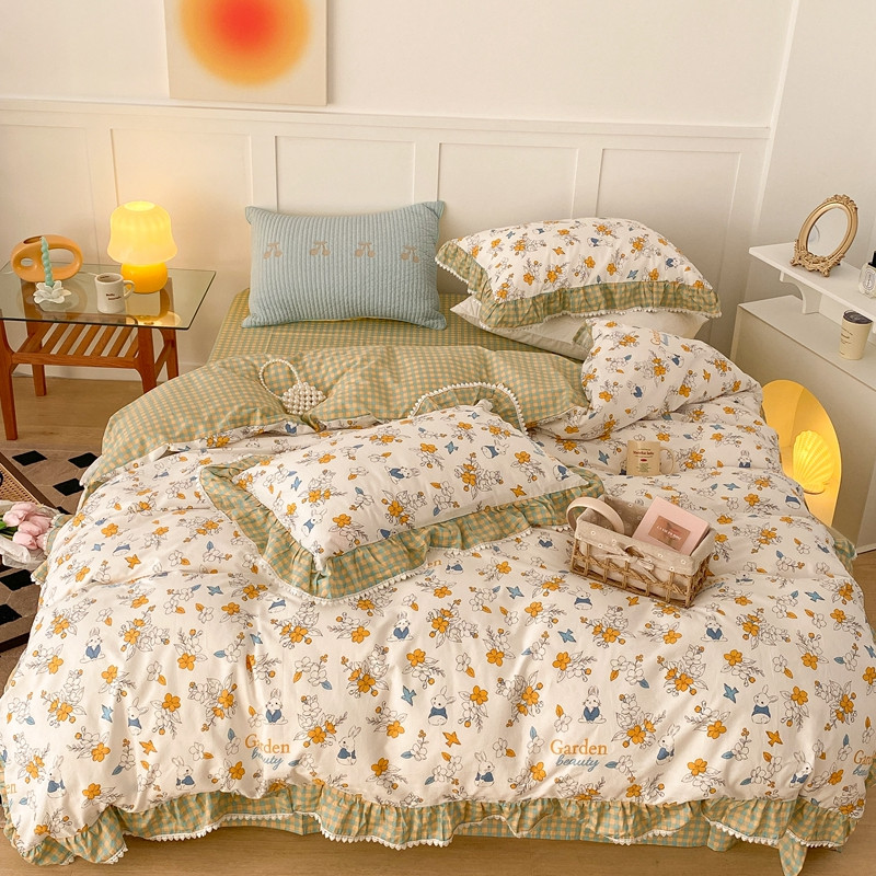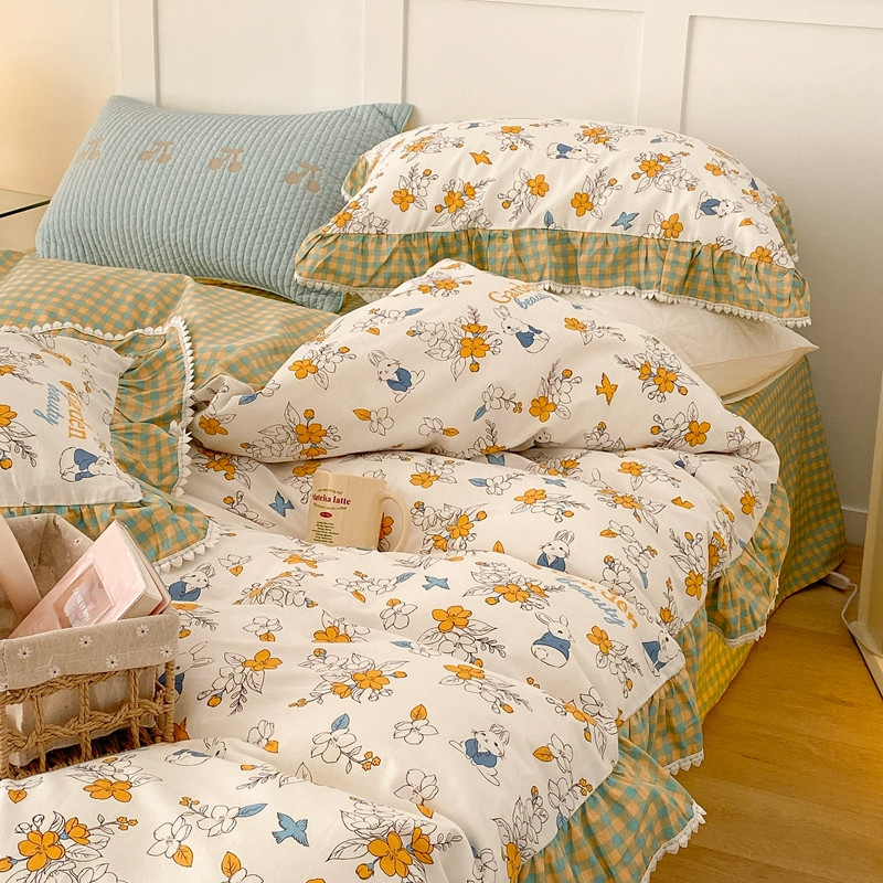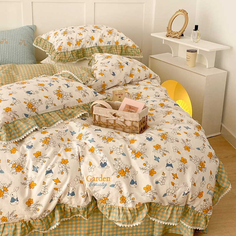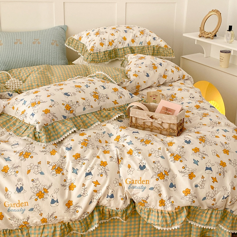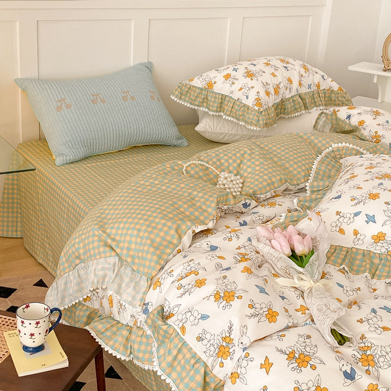 昔可家纺 2022新款全棉格子花边款四件套 花园兔白