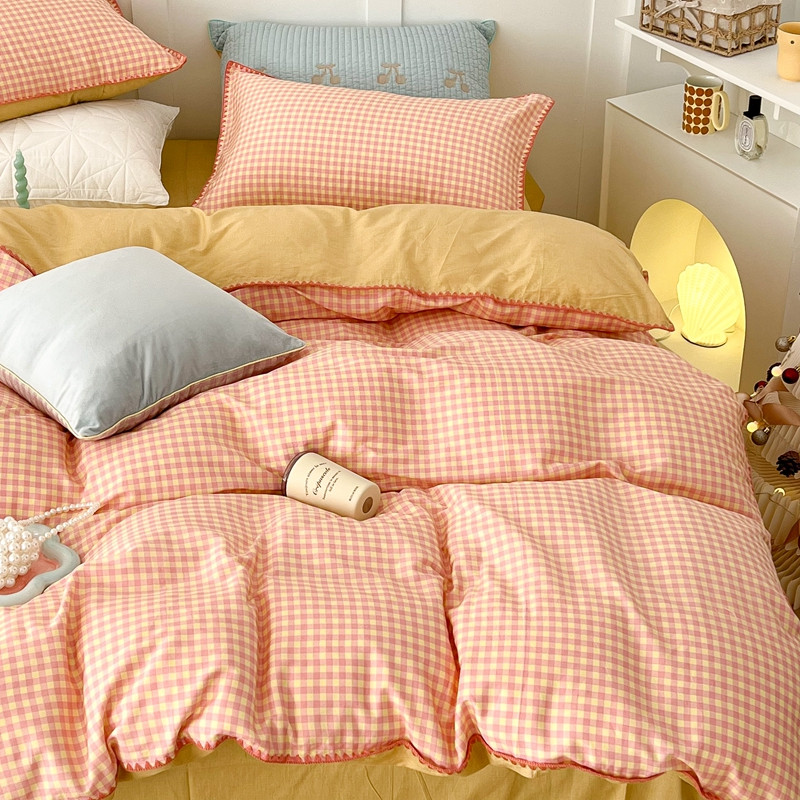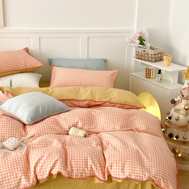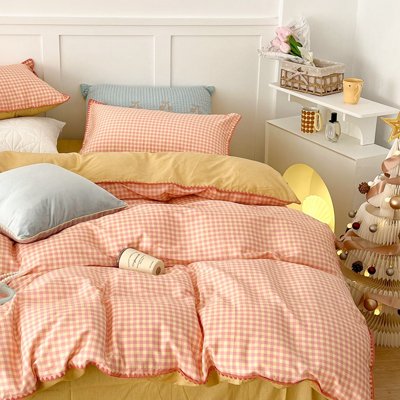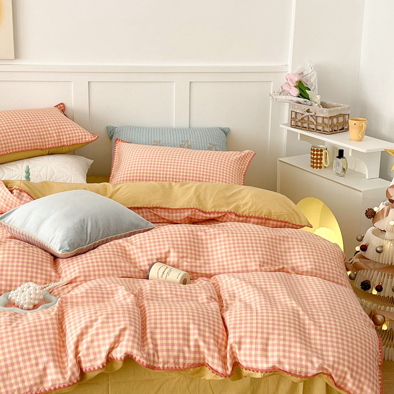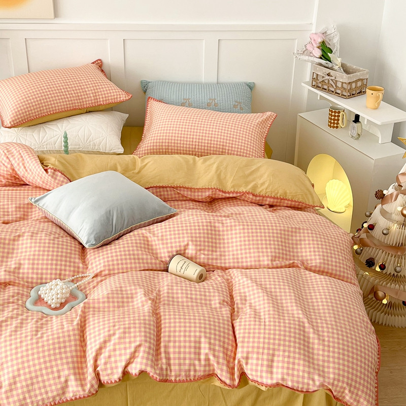 昔可家纺 2022新款全棉贝壳三角针格子款四件套 粉黄格