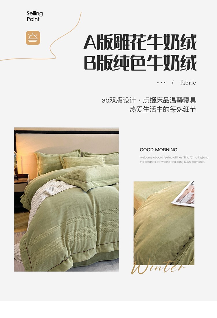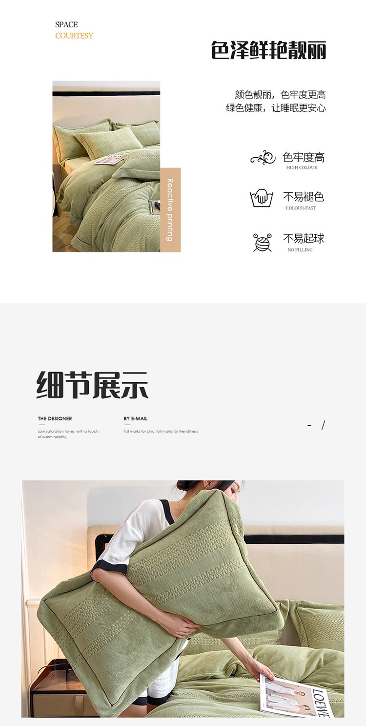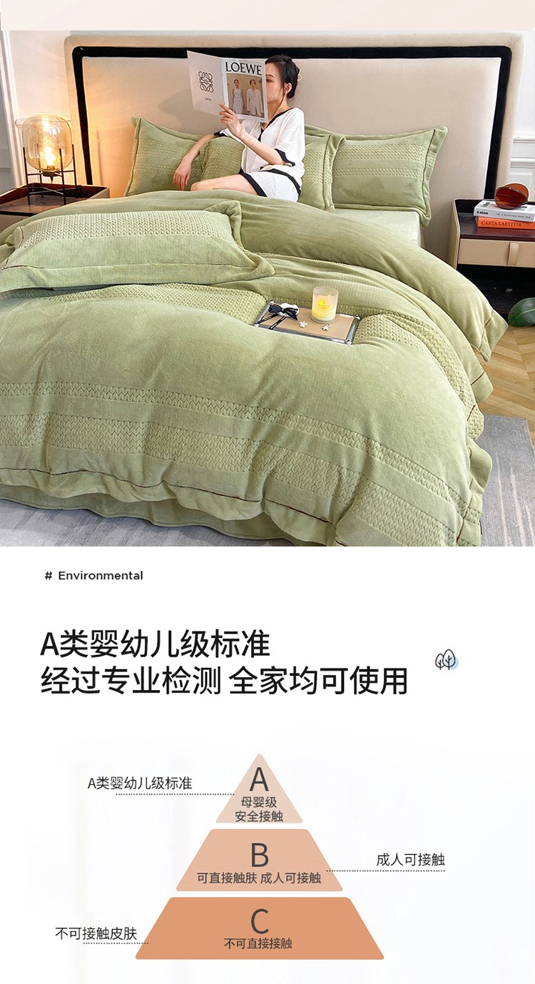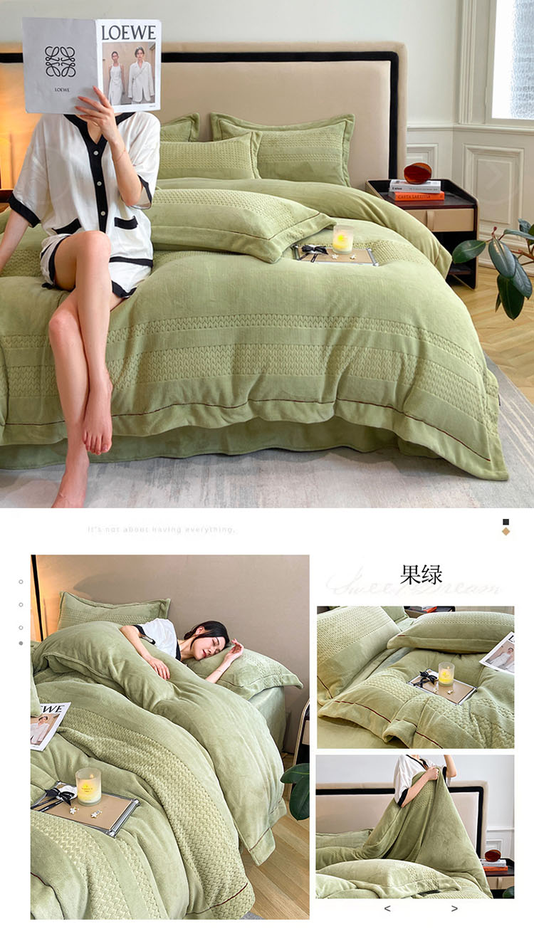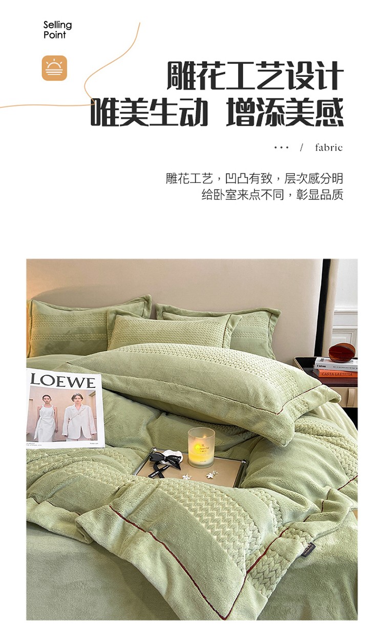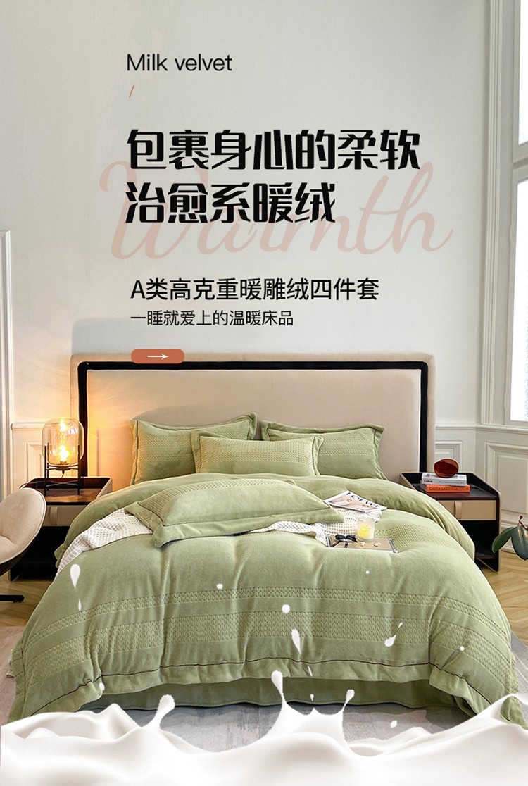 商品名称:嗯呢 2023新款A类高克重轻奢雕花牛奶绒四件套 大麦-豆绿
