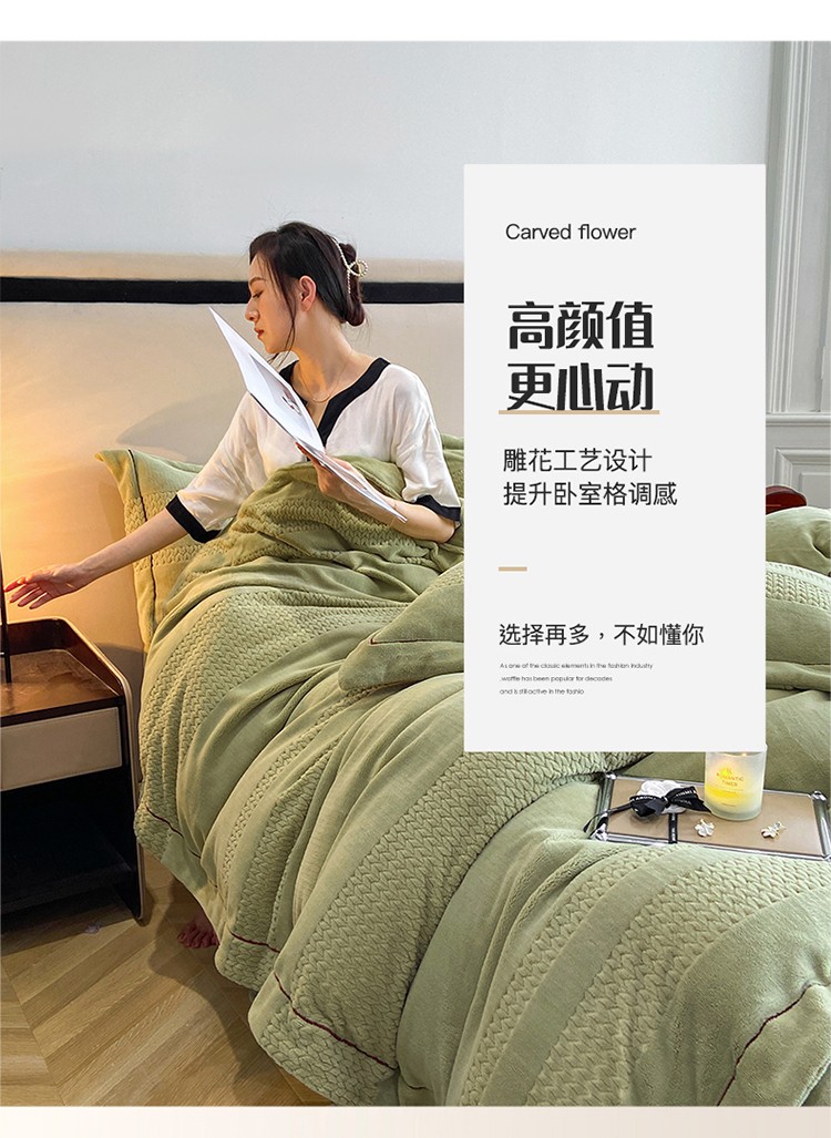 嗯呢 2023新款A类高克重轻奢雕花牛奶绒四件套 大麦-豆绿