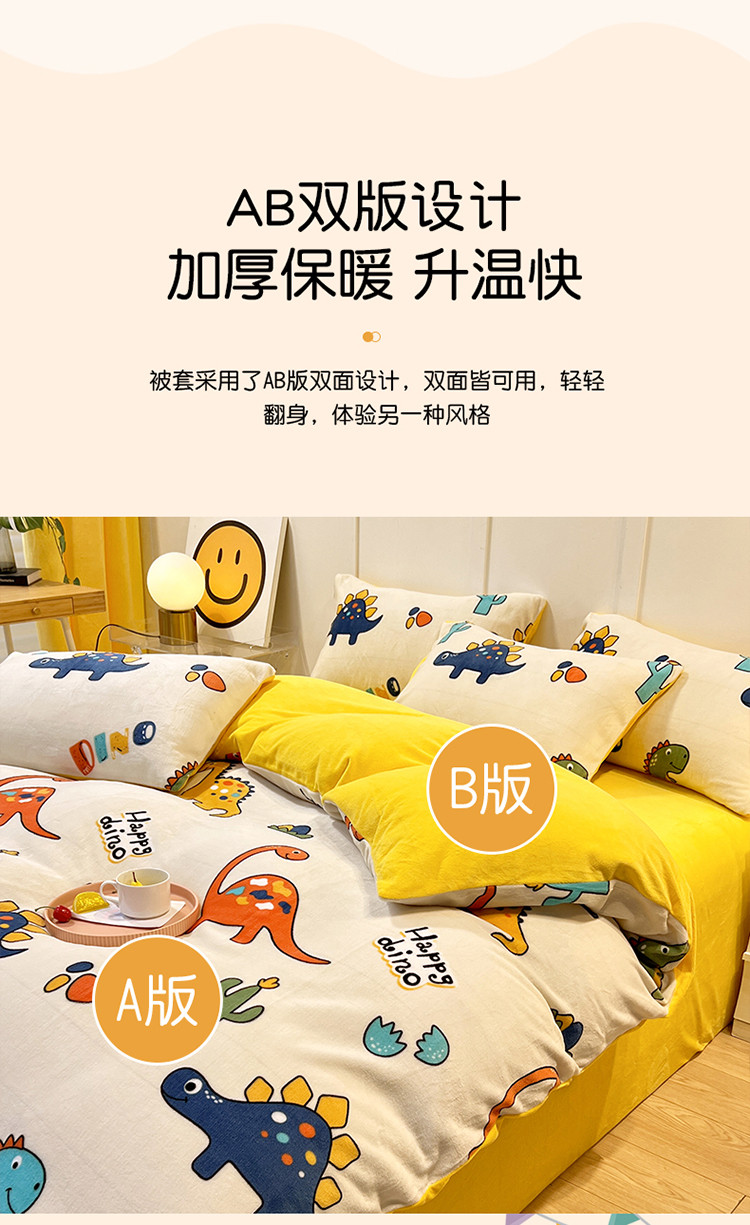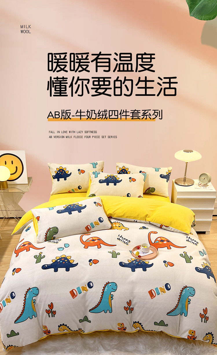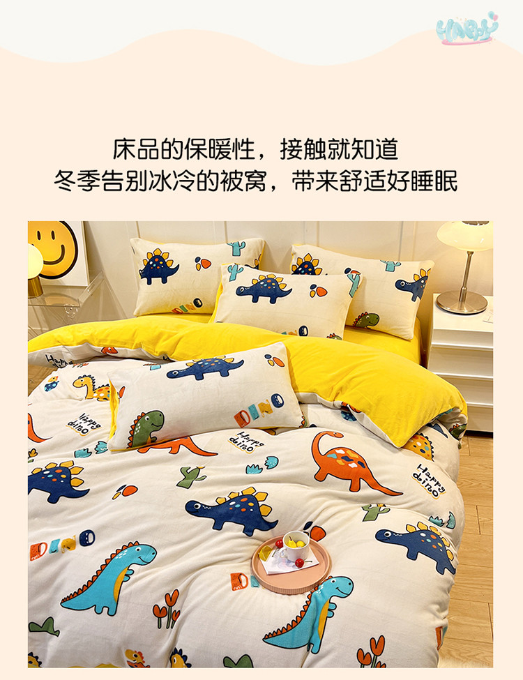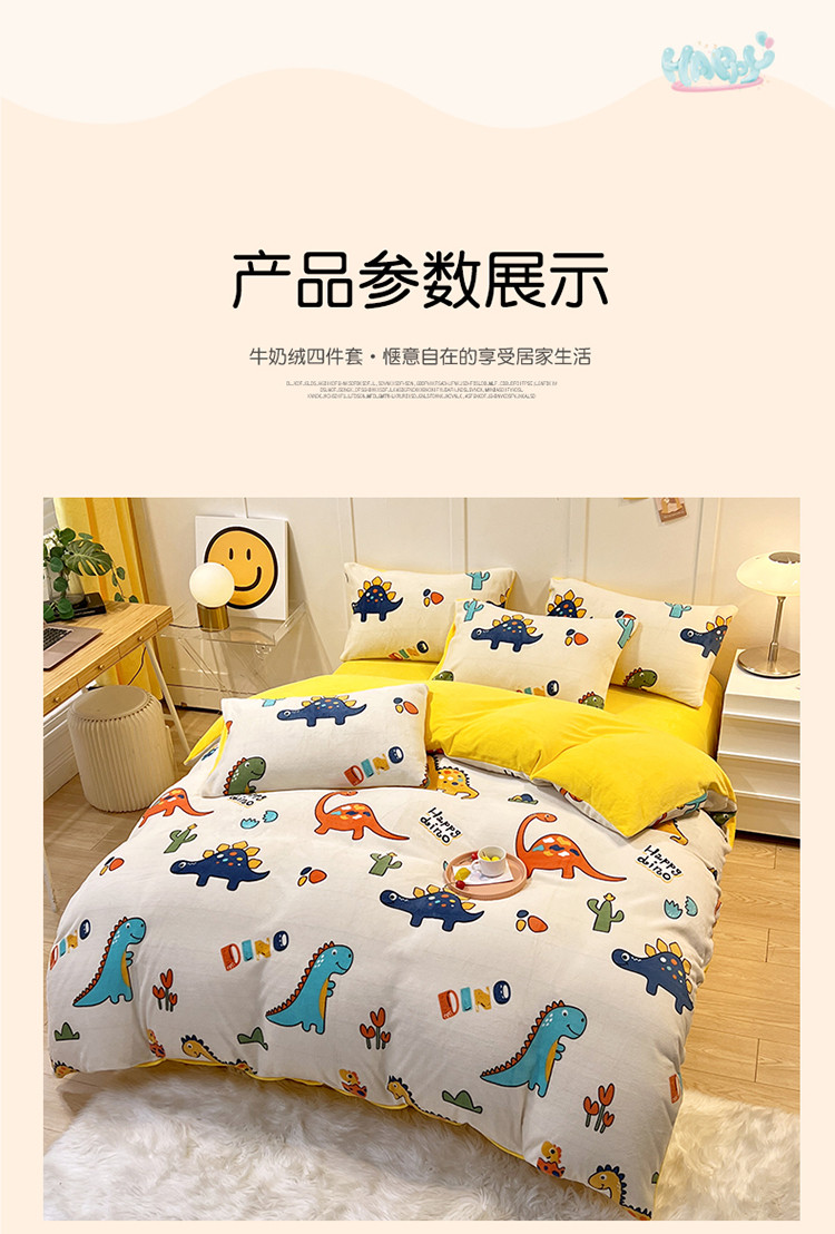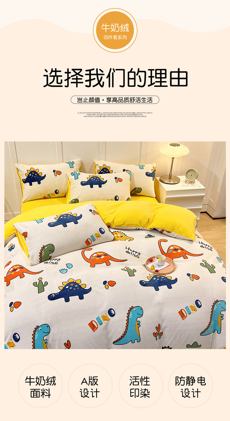 当前位置: 91家纺网 > 商品网购 > 床品套件 > 四件套 > 磨绒四件套 > 孩子王新款冬季加厚牛奶绒水晶绒珊瑚绒印花系列四件套恐龙漫步黄