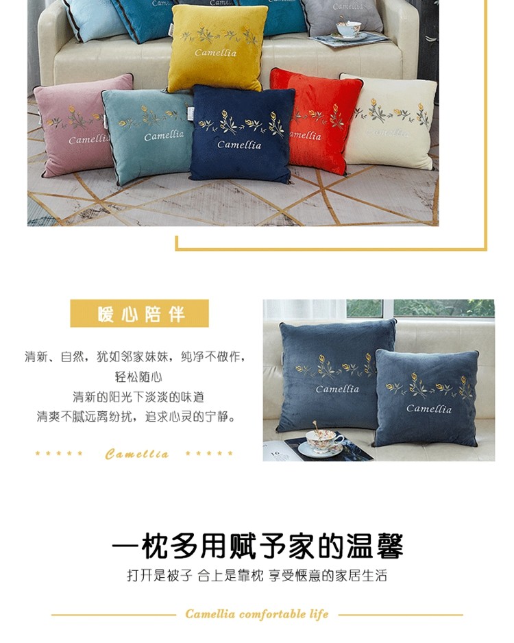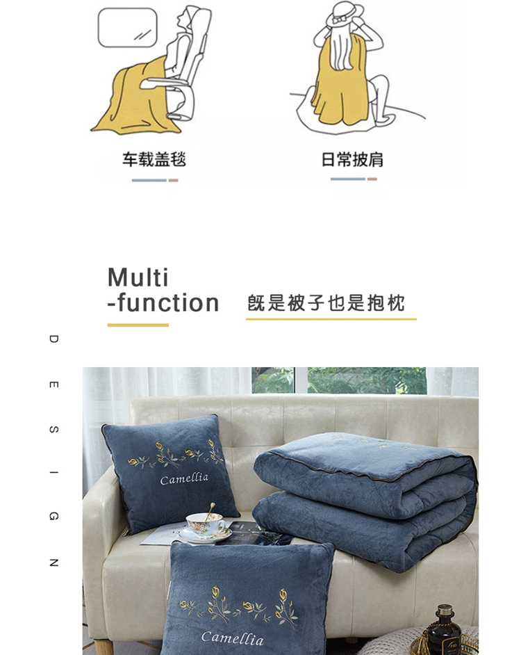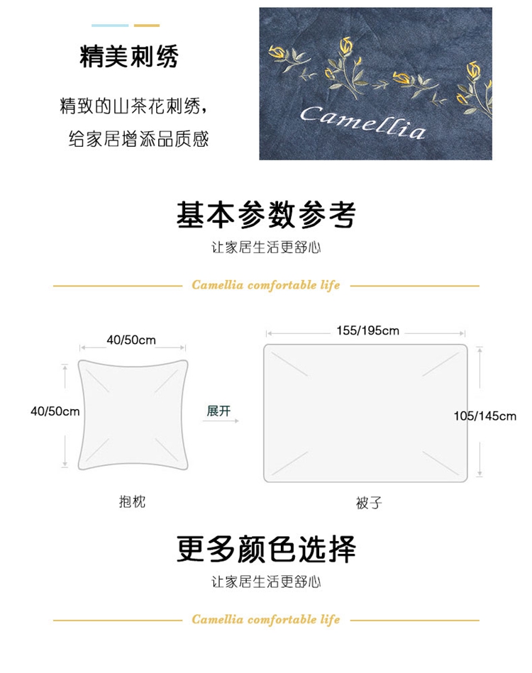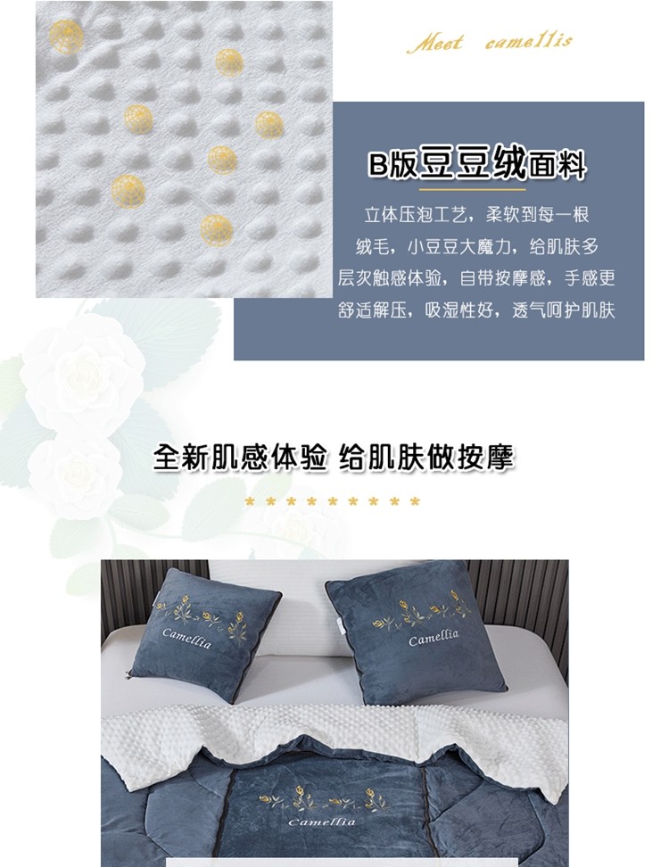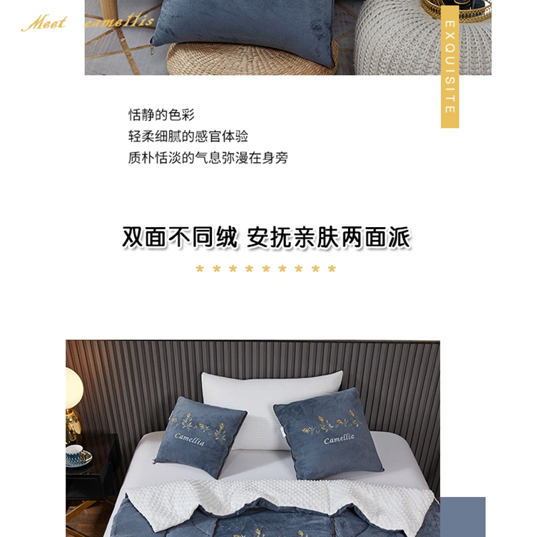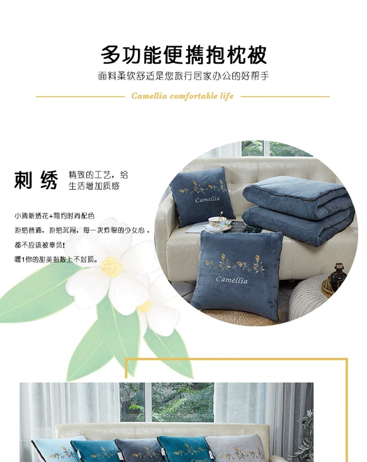 商品名称:翰轩家居 2022新款水晶绒绣花抱枕被系列-山茶花开 高级灰