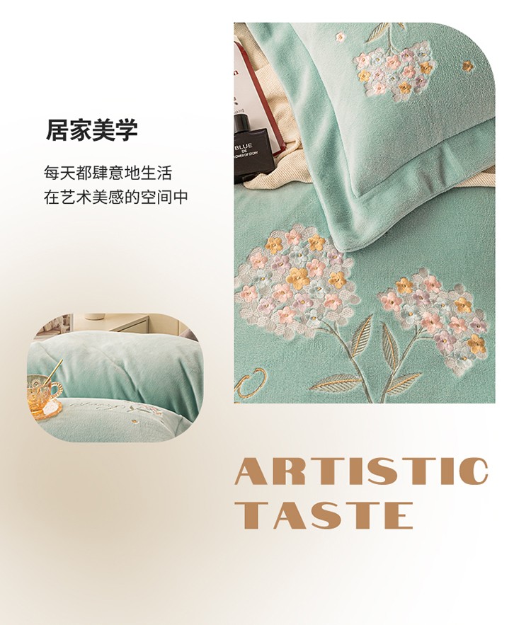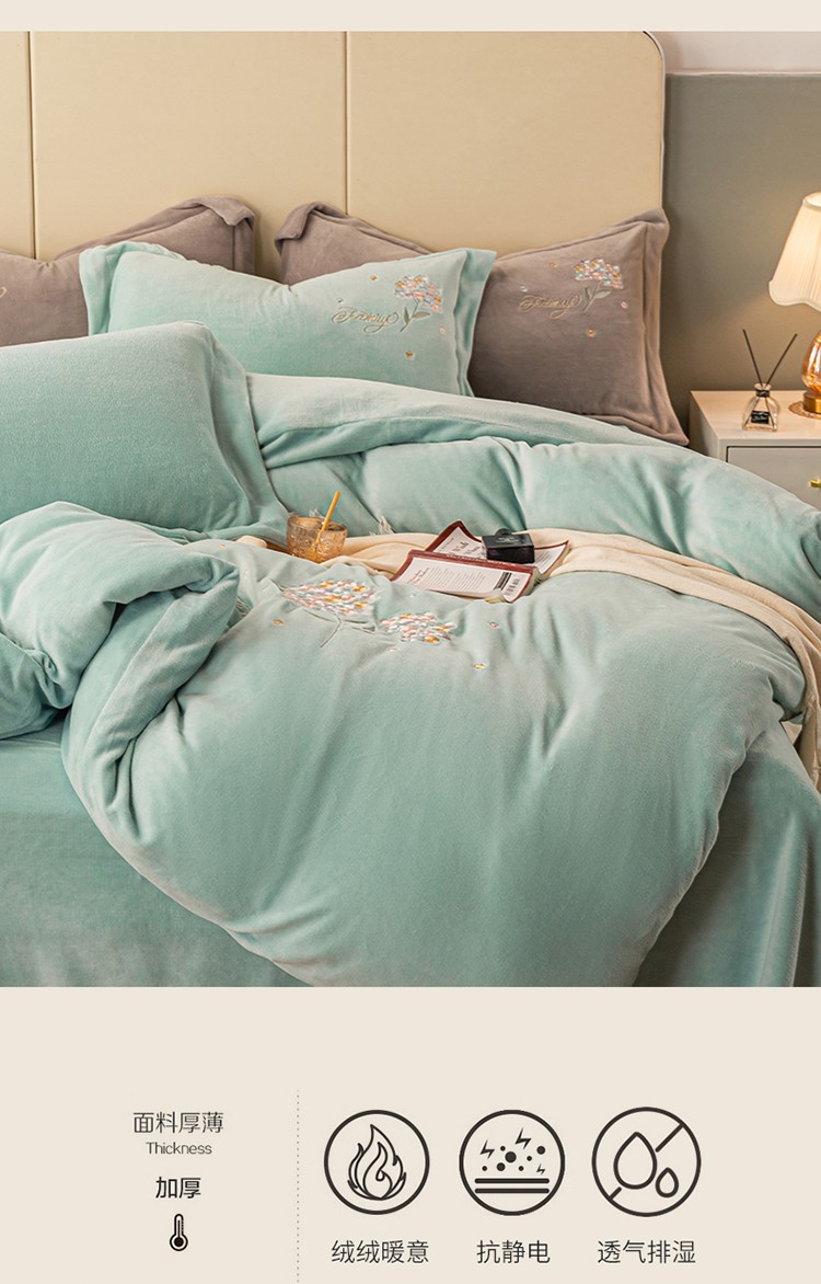 名品优仓 2022新款刺绣牛奶绒200克四件套-绣花球 天蓝