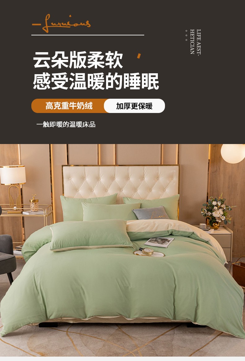 当前位置: 91家纺网 > 商品网购 > 床品套件 > 四件套 > 牛奶绒四件套 > 古吉梦高克重牛奶绒双色床单床笠款四件套 纯色棉绒-豆绿+奶黄