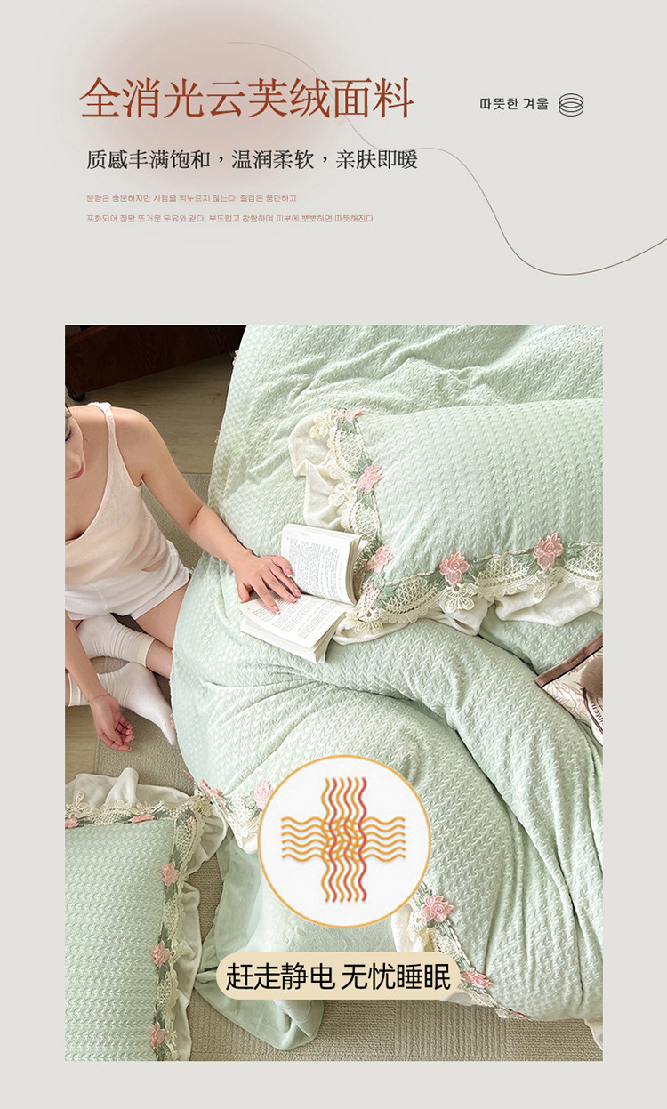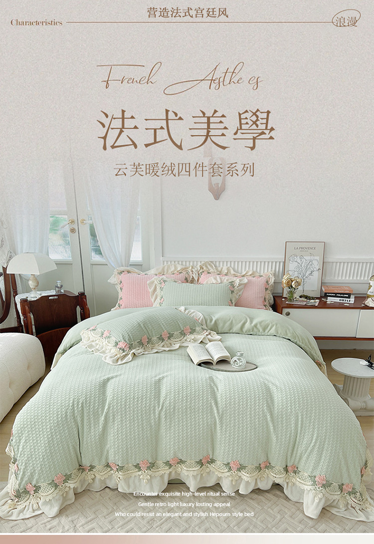 玛奇朵 高定蕾丝边全消光云芙暖绒四件套-唯 一(场景1) 唯一(绿)