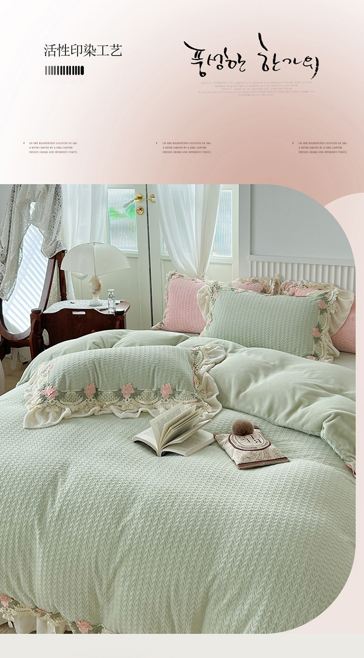 商品名称:玛奇朵 高定蕾丝边全消光云芙暖绒四件套-唯 一(场景1) 唯一(绿)
