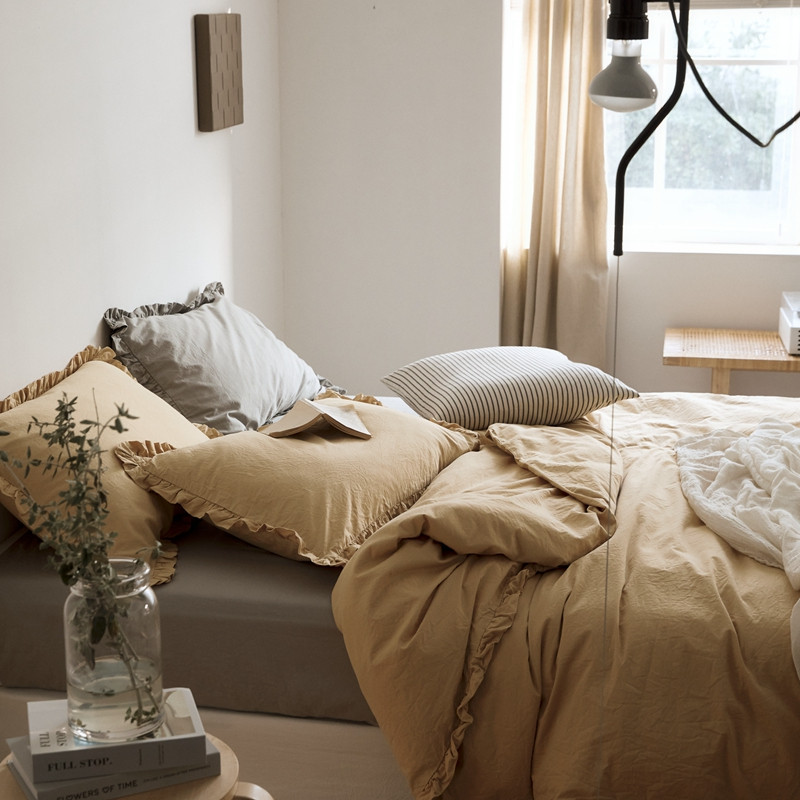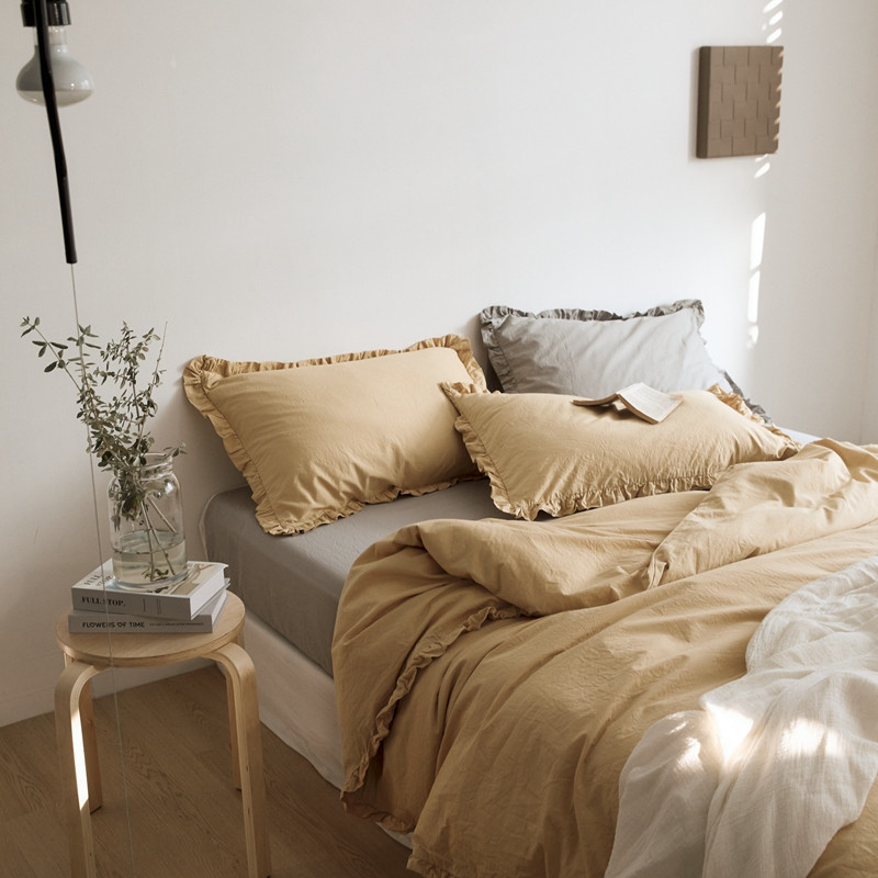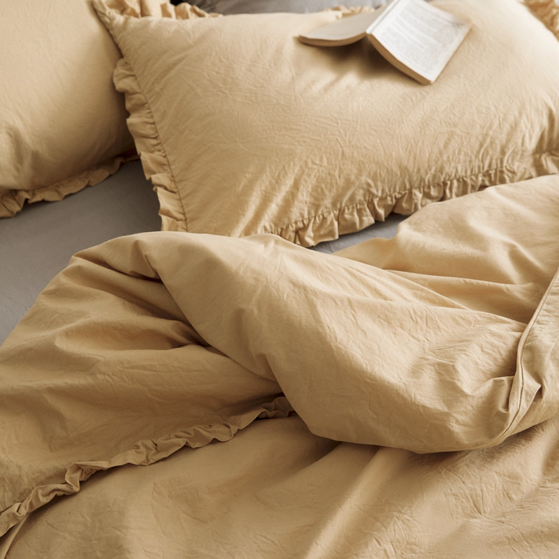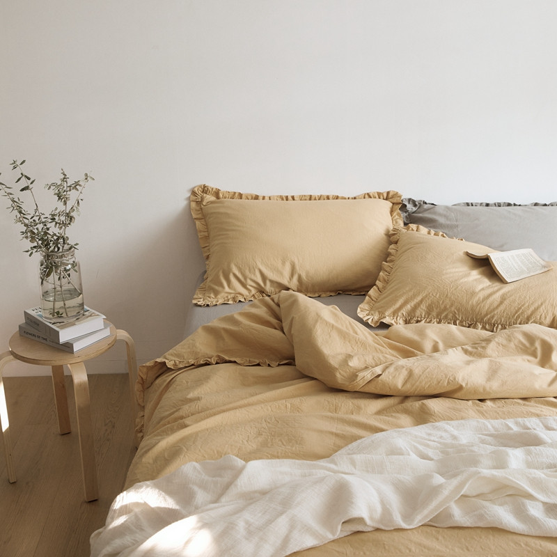 当前位置: 91家纺网 > 商品网购 > 床品套件 > 四件套 > 全棉普通四件套 > 新款13372全棉日系褶皱边四件套 秋叶黄