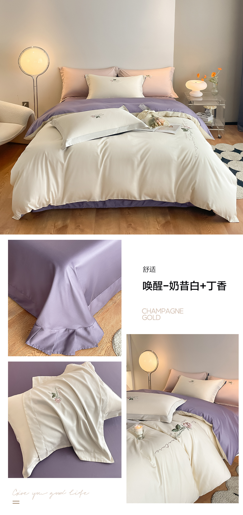 (总)秀色家纺 2026新款100支长绒棉纯棉四件套轻奢全棉刺绣被套床单纯棉四季床品-唤醒,唤醒-奶昔白+天空蓝,唤醒-奶昔白+香槟金,唤醒-奶昔白+莺茶绿,唤醒-奶昔白+茱萸粉,唤醒-天空蓝+茱萸粉,唤醒-香槟金+烟墨灰,唤醒-莺茶绿+香槟金,唤醒-茱萸粉+丁香紫,唤醒-茱萸粉+烟墨灰