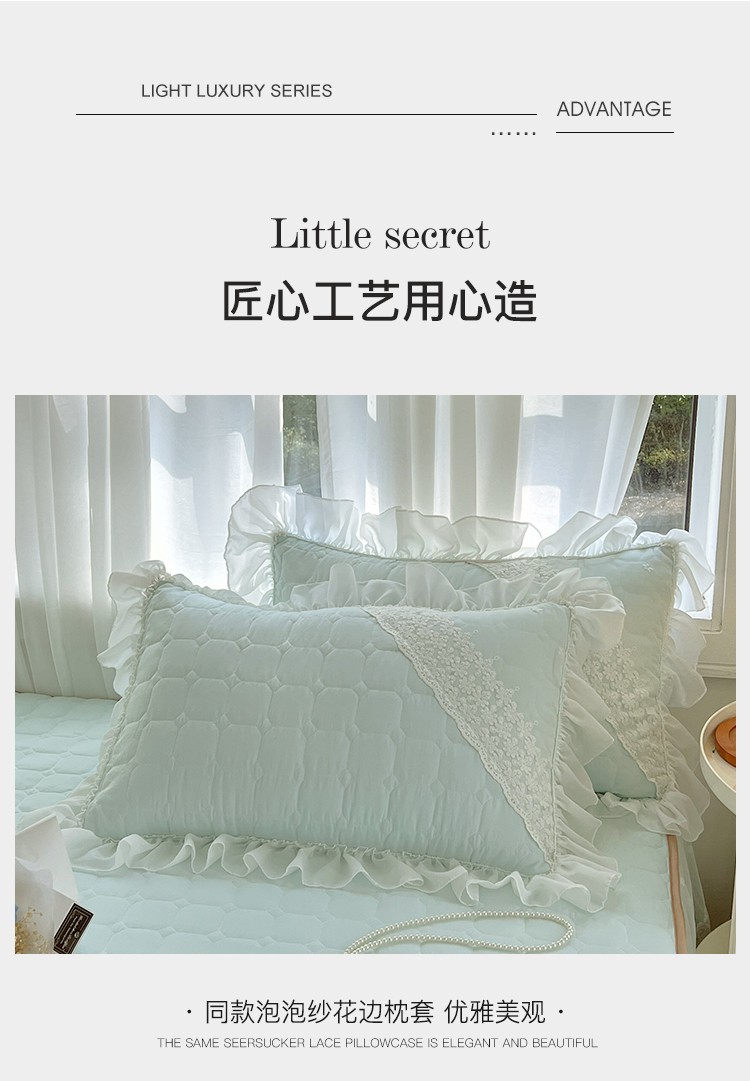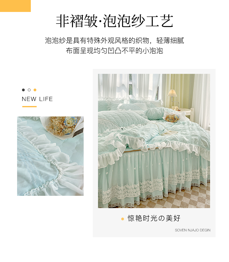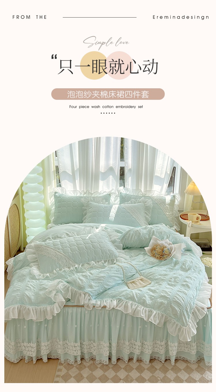 罗艺轩 2024新款 泡泡纱夹棉床裙白雪公主系列四件套 天空蓝