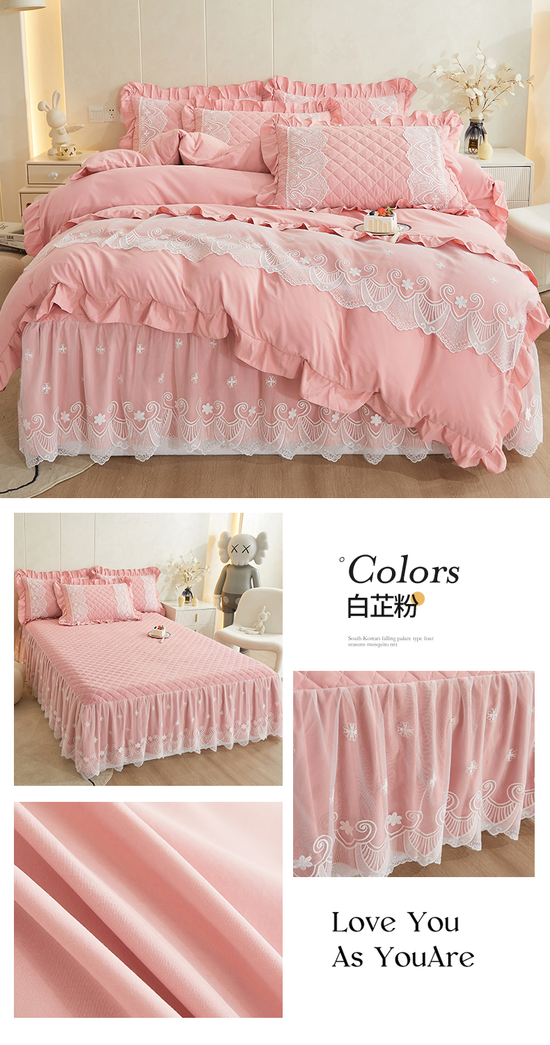 当前位置: 91家纺网 > 商品网购 > 床品套件 > 四件套 > 普通磨毛四件套 > 网红馆 2025新款亲肤蕾丝床裙四件套-梦想生活 白芷粉