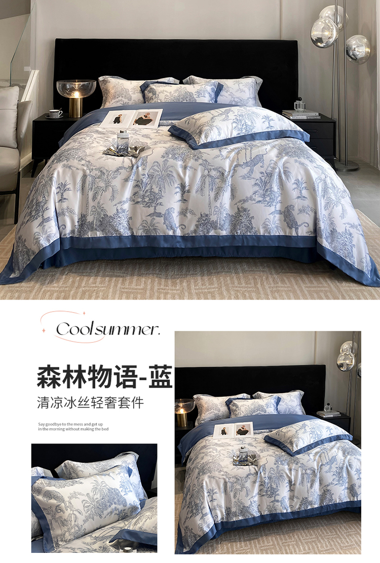 当前位置: 91家纺网 > 商品网购 > 床品套件 > 四件套 > 水洗真丝四件套 > 优悦 2023新款水洗真丝轻奢印花款四件套 森林物语-蓝